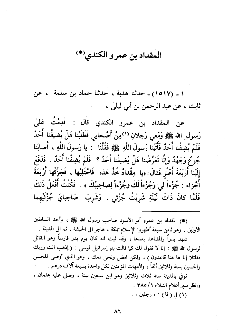 1517 - حَدَّثَنَا هُدْبَةُ، حَدَّثَنَا حَمَّادُ بْنُ سَلَمَةَ، عَنْ ثَابِتٍ، عَنْ عَبْدِ الرَّحْمَنِ بْنِ أَبِي لَيْلَى، عَنِ الْمِقْدَادِ بْنِ عَمْرٍو الْكِنْدِيِّ، قَالَ: قَدِمْتُ عَلَى رَسُولِ اللَّهِ صَلَّى اللهُ عَلَيْهِ وَسَلَّمَ وَمَعِي رَجُلَانِ مِنْ أَصْحَابِي، فَطَلَبْنَا هَلْ يُضِيفُنَا أَحَدٌ؟ فَلَمْ يُضِفْنَا أَحَدٌ، فَأَتَيْنَا رَسُولَ اللَّهِ صَلَّى اللهُ عَلَيْهِ وَسَلَّمَ، فَقُلْنَا: يَا رَسُولَ اللَّهِ، أَصَابَنَا جُوعٌ وَجَهْدٌ، وَإِنَّا تَعَرَضَّنْا هَلْ يُضِيفُنَا أَحَدٌ؟ فَلَمْ يُضِفْنَا أَحَدٌ، فَدَفَعَ إِلَيْنَا أَرْبَعَةَ أَعَنُزٍ فَقَالَ: " يَا مِقْدَادُ، خُذْ هَذِهِ فَاحْتَلِبْهَا فَجَزِّئْهَا أَرْبَعَةَ أَجْزَاءٍ: جُزْءًا لِي، وَجُزْءًا لَكَ، وَجُزْءًا لِصَاحِبَيْكَ " فَكُنْتُ أَفْعَلُ ذَلِكَ، فَلَمَّا كَانَ ذَاتَ لَيْلَةٍ شَرِبْتُ جُزْئِي، وَشَرِبَ صَاحِبَايَ جُزْئَيْهِمَا -[87]-، وَجَعَلْتُ جُزْءَ النَّبِيِّ صَلَّى اللهُ عَلَيْهِ وَسَلَّمَ فِي الْقَعْبِ، وَأَطْبَقْتُ عَلَيْهِ، فَاحْتُبِسَ النَّبِيُّ صَلَّى اللهُ عَلَيْهِ وَسَلَّمَ، فَقَالَتْ لِي نَفْسِي: إِنَّ رَسُولَ اللَّهِ صَلَّى اللهُ عَلَيْهِ وَسَلَّمَ قَدْ دَعَاهُ أَهْلُ بَيْتٍ مِنَ الْمَدِينَةِ، فَتَعَشَّى مَعَهُمْ وَرَسُولُ اللَّهِ صَلَّى اللهُ عَلَيْهِ وَسَلَّمَ لَا يَحْتَاجُ إِلَى هَذَا اللَّبَنِ، فَلَمْ تَزَلْ نَفْسِي تُدِيرُنِي حَتَّى قُمْتُ إِلَى الْقَعْبِ، فَشَرِبْتُ مَا فِيهِ، فَلَمَّا تَقَارَّ فِي بَطْنِي أَخَذَنِي مَا قَدُمَ، وَمَا حَدَثَ، فَقَالَتْ لِي نَفْسِي: يَجِيءُ رَسُولُ اللَّهِ صَلَّى اللهُ عَلَيْهِ وَسَلَّمَ وَهُوَ جَائِعٌ ظَمْآنُ، فَيَرْفَعُ الْقَعْبَ، فَلَا يَجِدُ فِيهِ شَيْئًا فَيَدْعُو عَلَيْكَ، فَتَسَجَّيْتُ كَأَنِّي نَائِمٌ، وَمَا كَانَ بِي نَوْمٌ، فَجَاءَ رَسُولُ اللَّهِ صَلَّى اللهُ عَلَيْهِ وَسَلَّمَ فَسَلَّمَ تَسْلِيمَةً أَسْمَعَ الْيَقْظَانَ، وَلَمْ يُوقِظِ النَّائِمَ، فَلَمَّا لَمْ يَرَ فِي الْقَعْبِ شَيْئًا رَفَعَ رَأْسَهُ إِلَى السَّمَاءِ، فَقَالَ: «§اللَّهُمَّ أَطْعِمْ مَنْ أَطْعَمَنَا وَاسْقِ مَنْ سَقَانَا» قَالَ: فَاغْتَنَمْتُ دَعْوَةَ رَسُولِ اللَّهِ صَلَّى اللهُ عَلَيْهِ وَسَلَّمَ فَأَخَذْتُ الشَّفْرَةَ وَأَنَا أُرِيدُ أَنْ أَذْبَحَ بَعْضَ تِلْكَ الْأَعَنْزِ فَأُطْعِمَهُ، فَضَرَبْتُ بِيَدِي فَوَقَعَتْ عَلَى ضَرْعِهَا، فَإِذَا هِيَ حَافِلٌ، ثُمَّ نَظَرْتُ إِلَيْهِنَّ جَمِيعًا، فَإِذَا هُنَّ حُفَّلٌ فَحَلَبْتُ فِي الْقَعْبِ حَتَّى امْتَلَأَ، ثُمَّ أَتَيْتُهُ وَأَنَا أَبْتَسِمُ، فَقَالَ: «هِيهِ بَعْضَ سَوْآتِكَ يَا مِقْدَادُ» فَقُلْتُ: يَا رَسُولَ اللَّهِ، اشْرَبْ، ثُمَّ أُخْبِرُ فَشَرِبَ، ثُمَّ شَرِبْتُ مَا بَقِيَ ثُمَّ أَخْبَرْتُهُ فَقَالَ: «يَا مِقْدَادُ، هَذِهِ بَرَكَةٌ كَانَ يَنْبَغِي لَكَ أَنْ تُعْلِمَنِي حَتَّى نُوقِظَ صَاحِبَيْنَا فَنَسْقِيَهُمَا مِنْ هَذِهِ الْبَرَكَةِ» قَالَ: قُلْتُ: يَا رَسُولَ اللَّهِ، إِذَا شَرِبْتَ أَنْتَ الْبَرَكَةَ وَأَنَا فَمَا أُبَالِي مَنْ أَخْطَأَتْKإسناده صحيح