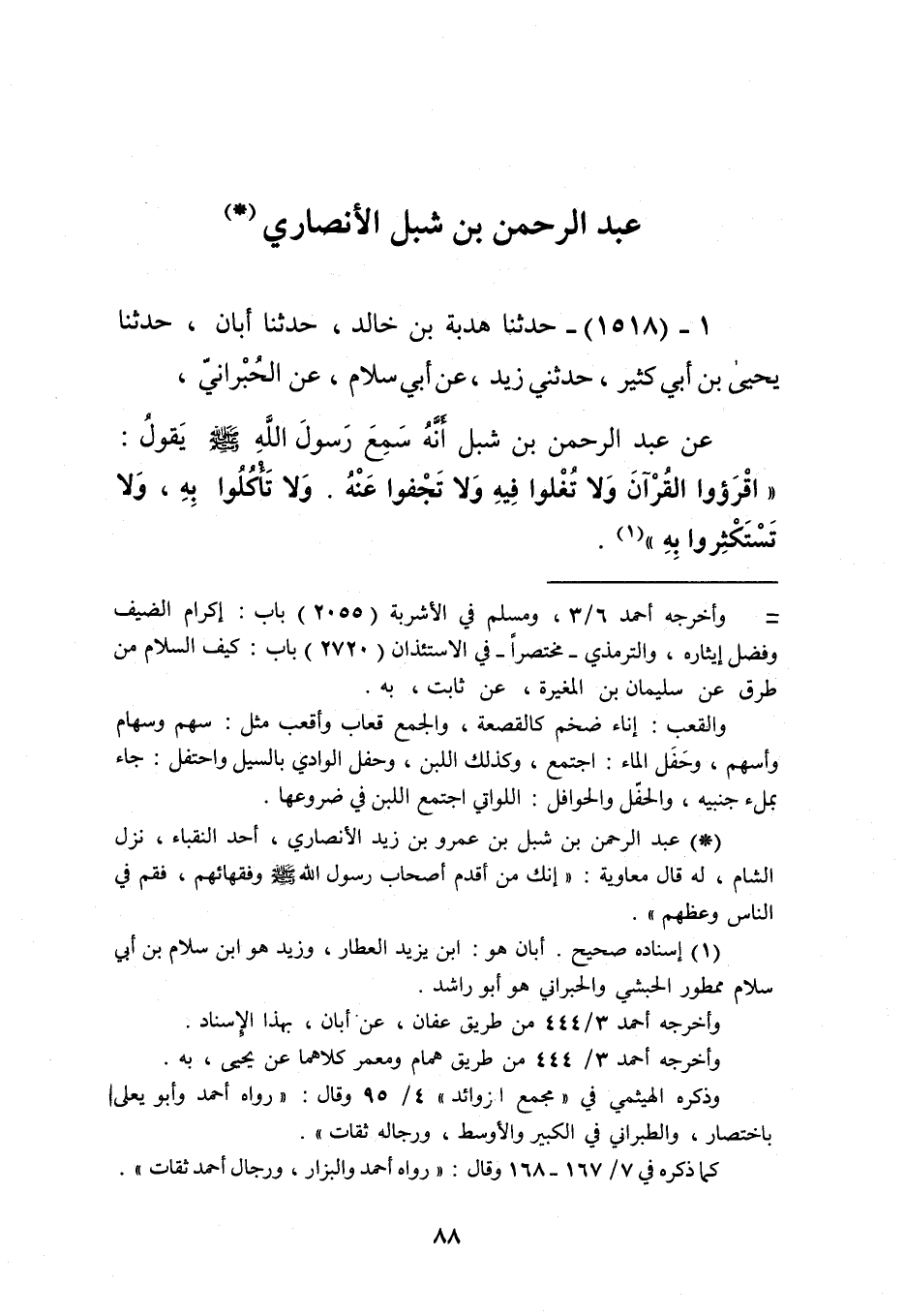 1518 - حَدَّثَنَا هُدْبَةُ بْنُ خَالِدٍ، حَدَّثَنَا أَبَانُ، حَدَّثَنَا يَحْيَى بْنُ أَبِي كَثِيرٍ، حَدَّثَنِي زَيْدُ، عَنْ أَبِي سَلَامٍ، عَنِ الْحُبْرَانِيِّ، عَنْ عَبْدِ الرَّحْمَنِ بْنِ شِبْلٍ، أَنَّهُ سَمِعَ رَسُولَ اللَّهِ صَلَّى اللهُ عَلَيْهِ وَسَلَّمَ يَقُولُ: «§اقْرَءُوا الْقُرْآنَ، وَلَا تَغْلُوا فِيهِ، وَلَا تَجْفُوا، عَنْهُ، وَلَا تَأْكُلُوا بِهِ، وَلَا تَسْتَكْثِرُوا بِهِ» Kإسناده صحيح