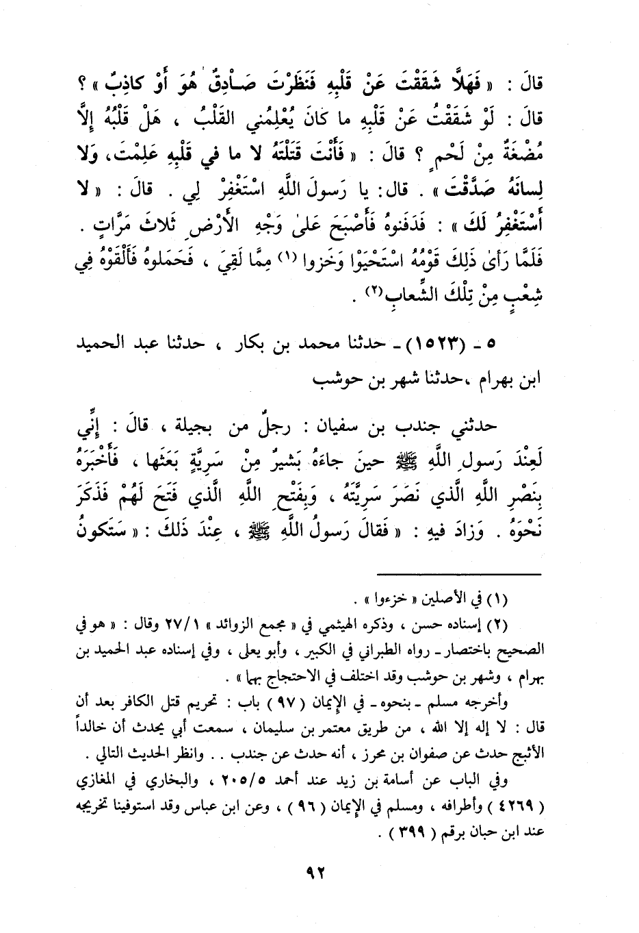 1523 - حَدَّثَنَا مُحَمَّدُ بْنُ بَكَّارٍ، حَدَّثَنَا عَبْدُ الْحَمِيدِ بْنُ بَهْرَامَ، حَدَّثَنَا شَهْرُ بْنُ حَوْشَبٍ، حَدَّثَنِي جُنْدُبُ بْنُ سُفْيَانَ، رَجُلٌ مِنْ بَجِيلَةَ قَالَ: إِنِّي لَعِنْدَ رَسُولِ اللَّهِ صَلَّى اللهُ عَلَيْهِ وَسَلَّمَ حِينَ جَاءَهُ بَشِيرٌ مِنْ سَرِيَّةٍ بَعَثَهَا، فَأَخْبَرَهُ بِنَصْرِ اللَّهِ الَّذِي نَصَرَ سَرِيَّتَهُ، وَبِفَتْحِ اللَّهِ الَّذِي فَتَحَ لَهُمْ، فَذَكَرَ نَحْوَهُ وَزَادَ فِيهِ، فَقَالَ رَسُولُ اللَّهِ صَلَّى اللهُ عَلَيْهِ وَسَلَّمَ، عِنْدَ ذَلِكَ: «§سَتَكُونُ بَعْدِي فِتَنٌ كَقِطَعِ اللَّيْلِ الْمُظْلِمِ تصْدِمُ كَصَدْمِ الْحَيَّاتِ، وَفُحُولِ الثِّيرَانِ، يُصْبِحُ الرَّجُلُ فِيهَا مُسْلِمًا، وَيُمْسِي كَافِرًا، وَيُمْسِي فِيهَا مُسْلِمًا، وَيُصْبِحُ كَافِرًا»، فَقَالَ رَجُلٌ مِنَ الْمُسْلِمِينَ: فَكَيْفَ نَصْنَعُ، عِنْدَ ذَلِكَ يَا رَسُولَ اللَّهِ؟ قَالَ: «ادْخُلُوا بُيُوتَكُمْ وَأَخْمِلُوا ذِكْرَكُمْ»، فَقَالَ رَجُلٌ مِنَ الْمُسْلِمِينَ: أَفَرَأَيْتَ إِنْ دَخَلَ عَلَى أَحَدِنَا فِي بَيْتِهِ؟ فَقَالَ رَسُولُ اللَّهِ صَلَّى اللهُ عَلَيْهِ وَسَلَّمَ: «لِيُمْسِكْ بِيَدِهِ، وَلْيَكُنْ عَبْدَ اللَّهِ الْمَقْتُولَ، وَلَا يَكُنْ عَبْدَ اللَّهِ الْقَاتِلَ، فَإِنَّ الرَّجُلَ يَكُونُ فِي قُبَّةِ الْإِسْلَامِ فَيَأْكُلُ مَالَ أَخِيهِ، وَيَسْفِكُ دَمَهُ، وَيْعِصي رَبَّهُ، وَيَكْفُرُ بِخَالِقِهِ، وَتَجِبُ لَهُ جَهَنَّمُ» Kإسناده حسن