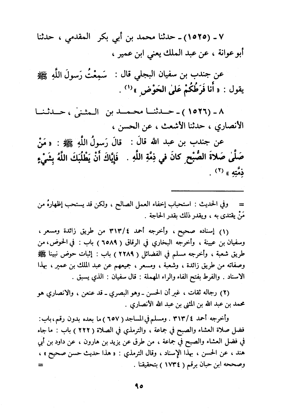 1525 - حَدَّثَنَا مُحَمَّدُ بْنُ أَبِي بَكْرٍ الْمُقَدَّمِيُّ، حَدَّثَنَا أَبُو عَوَانَةَ، عَنْ عَبْدِ الْمَلِكِ يَعْنِي ابْنَ عُمَيْرٍ، عَنْ جُنْدُبِ بْنِ سُفْيَانَ الْبَجَلِيِّ، قَالَ: سَمِعْتُ رَسُولَ اللَّهِ صَلَّى اللهُ عَلَيْهِ وَسَلَّمَ يَقُولُ: «§أَنَا فَرَطُكُمْ عَلَى الْحَوْضِ» Kإسناده صحيح