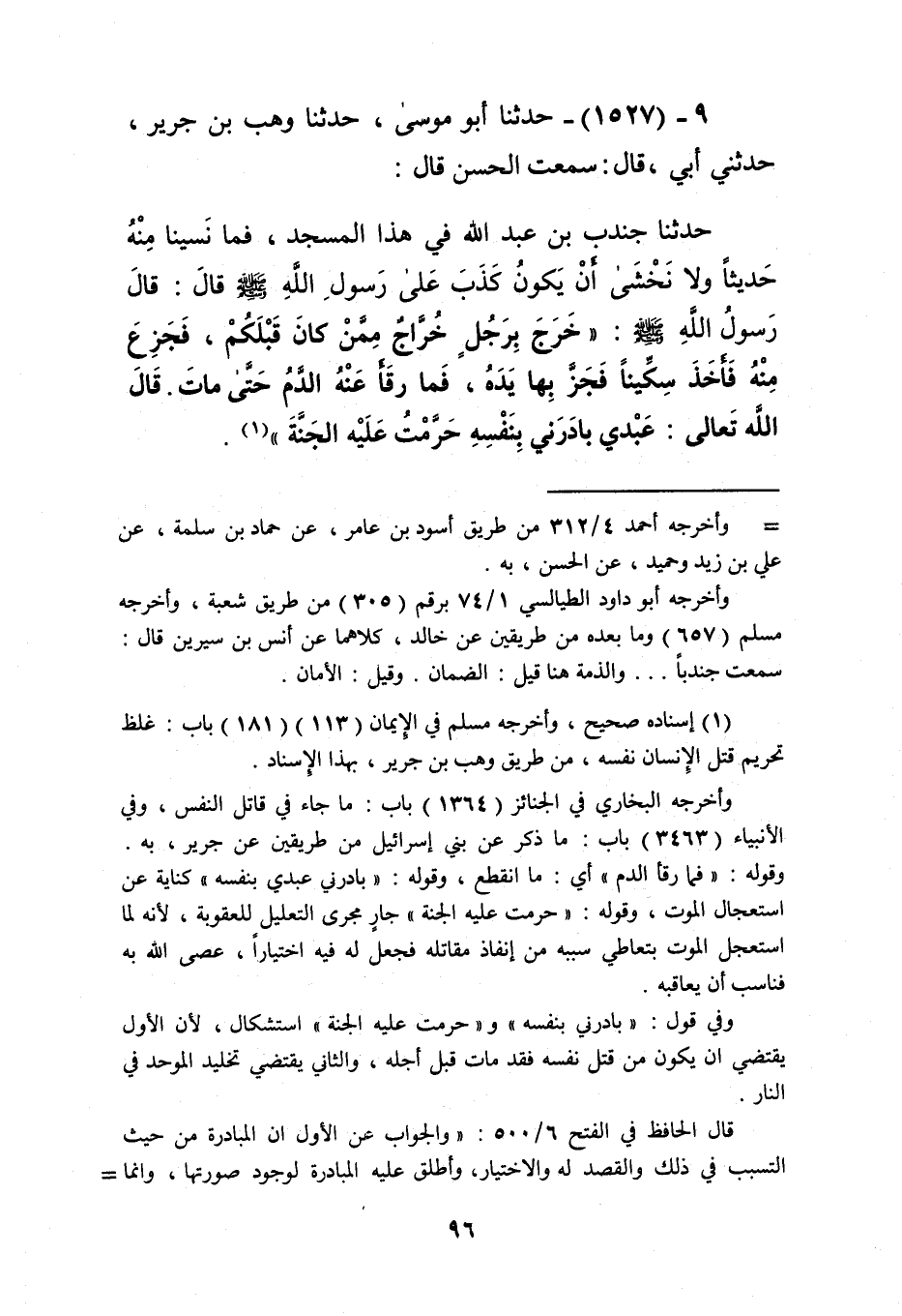 1527 - حَدَّثَنَا أَبُو مُوسَى، حَدَّثَنَا وَهْبُ بْنُ جَرِيرٍ، حَدَّثَنِي أَبِي قَالَ: سَمِعْتُ الْحَسَنَ، قَالَ: حَدَّثَنَا جُنْدُبُ بْنُ عَبْدِ اللَّهِ، فِي هَذَا الْمَسْجِدِ فَمَا نَسِينَا مِنْهُ حَدِيثًا وَلَا نَخْشَى أَنْ يَكُونَ كَذَبَ عَلَى رَسُولِ اللَّهِ صَلَّى اللهُ عَلَيْهِ وَسَلَّمَ قَالَ: قَالَ رَسُولُ اللَّهِ صَلَّى اللهُ عَلَيْهِ وَسَلَّمَ: " §خَرَجَ بِرَجُلٍ خُرَّاجٌ مِمَّنْ كَانَ قَبْلَكُمْ فَجَزِعَ مِنْهُ، فَأَخَذَ سِكِّينًا فَجَرَّ بِهَا يَدَهُ، فَمَا رَقَأَ، عَنْهُ الدَّمُ حَتَّى مَاتَ، قَالَ اللَّهُ تَعَالَى: عَبْدِي بَادَرَنِي بِنَفْسِهِ حَرَّمْتُ عَلَيْهِ الْجَنَّةَ " -[97]-. قَالَ أَبُو مُوسَى قَالَ 149 وَهْبُ: الْقَدَرِيَّةُ يَحْتَجُّونَ بِهَذَا الْحَدِيثِ وَلَيْسَ لَهُمْ فِيهِ حَجَّةٌKإسناده صحيح