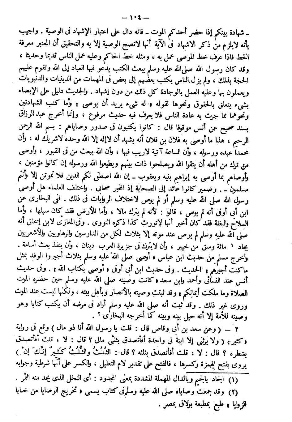 {شَهَادَةُ بَيْنِكُمْ إِذَا حَضَرَ أَحَدَكُمُ الْمَوْتُ} إنه دال على اعتبار الإشهاد في الوصية وأجيب بأنه لا يلزم من ذكر الإشهاد في الآية أنها لا تصح الوصية إلا به والتحقيق أن المعتبر معرفة الخط فإذا عرف خط الموصي عمل به ومثله خط الحاكم وعليه عمل الناس قديما وحديثا وقد كان رسول الله صلى الله عليه وسلم يبعث الكتب يدعو فيها العباد إلى الله وتقوم عليهم الحجة بذلك ولم يزل الناس يكتب بعضهم إلى بعض في المهمات من الدينيات والدنيويات ويعملون بها وعليه العمل بالوجادة كل ذلك من دون إشهاد والحديث دليل على الإيصاء بشيء يتعلق الفراشوق ونحوها لقوله "له شيء يريد أن يوصي" وأما كتب الشهادتين ونحوهما مما جرت به عادة الناس فلا يعرف فيه حديث مرفوع وإنما أخرج عبد الرزاق بسند صحيح عن أنس موقوفا قال كانوا يكتبون في صدور وصاياهم بسم الله الرحمن الرحيم هذا ما أوصى به فلان بن فلان أنه يشهد أن لا إله إلا الله وحده لا شريك له وأن محمدا عبده ورسوله وأن الساعة آتية لا ريب فيها وأن الله يبعث من في القبور وأوصى من ترك من أهله أن يتقوا الله ويصلحوا ذات بينهم ويطيعوا الله ورسوله إن كانوا مؤمنين وأوصاهم بما أوصى به إبراهيم بنيه ويعقوب {إِنَّ اللَّهَ اصْطَفَى لَكُمُ الدِّينَ فَلا تَمُوتُنَّ إِلَّا وَأَنْتُمْ مُسْلِمُونَ} وضمير كانوا عائد إلى الصحابة إذ المخبر صحابي واختلف العلماء هل أوصى رسول الله صلى الله عليه وسلم أو لم يوص لاختلاف الروايات في ذلك ففي البخاري عن ابن أبي أوفى أنه لم يوص قالوا لأنه لم يترك مالا وأما الأرض قد كان سبلها وأما السلاح والبغلة فقد كان أخبر أنها لا تورث كذا ذكره النووي وفي المغازي لابن إسحاق أنه صلى الله عليه وسلم لم يوص عند موته إلا بثلاث لكل من الدارسيين والرهاويين والأشعريين بجاد مائة وسق من خيبر وألا يترك في جزيرة العرب دينان وأن ينفذ بعث أسامة وأخرج مسلم من حديث ابن عباس "أوصى صلى الله عليه وسلم بثلاث أجيروا الوفد بمثل ما كنت أجيرهم" الحديث وفي حديث ابن أبي أوفى "أوصى بكتاب الله" وفي حديث أنس عند النسائي وأحمد وابن سعد كانت وصيته صلى الله عليه وسلم حين حضره الموت الصلاة وما ملكت أيمانكم وقد ثبتت بالأنصار وبأهل بيته ولكنها ليست عند الموت وروي غير ذلك وقد ثبت أنه صلى الله عليه وسلم أراد في مرضه أن يكتب كتابا وهو وصيته للأمة إلا أنه حيل بينه وبينه كما أخرجه البخاري