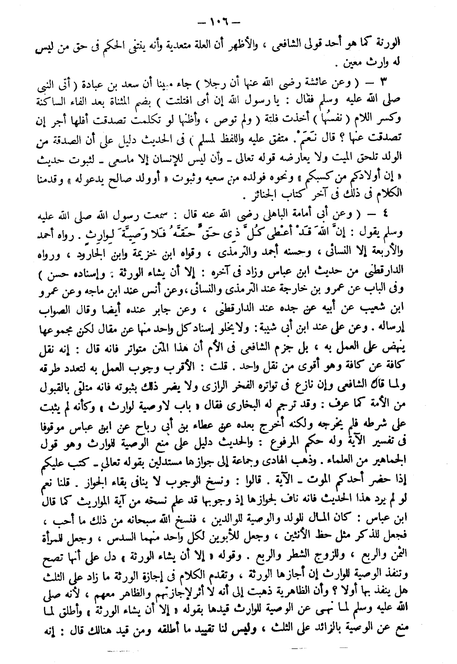 4- وعن أبي أمامة الباهلي رضي الله عنه قال سمعت رسول الله صلى الله عليه وسلم يقول: "إن الله قد أعطى كل ذي حق حقه فلا وصية لوارث" رواه أحمد والأربعة إلا النسائي وحسنه أحمد والترمذي وقواه ابن خزيمة وابن الجارود ورواه الدارقطني من حديث ابن عباس وزاد في آخره "إلا أن يشاء الورثة" وإسناده حسن وفي الباب عن عمرو بن خارجة عند الترمذي والنسائي وعن أنس عند ابن ماجه وعن عمرو بن شعيب عن أبيه عن جده عند الدارقطني وعن جابر عنده أيضا وقال الصواب إرساله وعن علي عند ابن أبي شيبة ولا يخلو إسناد كل واحد منها عن مقال لكن مجموعها ينهض على العمل به بل جزم الشافعي في الأم أن هذا المتن متواتر فإنه قال إنه نقل كافة عن كافة وهو أقوى من نقل واحد قلت الأقرب وجوب العمل به لتعدد طرقه ولما قال الشافعي وإن نازع في تواتره الفخر الرازي ولا يضر ذلك بثبوته فإنه متلقى بالقبول من الأمة كما عرف وقد ترجم له البخاري فقال باب لا وصية لوارث وكأنه لم يثبت على شرطه فلم يخرجه ولكنه أخرج بعده عن عطاء بن أبي رباح عن ابن عباس موقوفا في تفسير الآية وله حكم المرفوع والحديث دليل على منع الوصية للوارث وهو قول الجماهير من العلماء وذهب الهادي وجماعة إلى جوازها مستدلين بقوله تعالى -كتب عليكم إذا حضر أحدكم الموت- الآية قالوا ونسخ الوجوب لا ينافي بقاء الجواز قلنا نعم لو لم يرد هذا الحديث فإنه ناف لجوازها إذ وجوبها قد علم نسخه من آية المواريث كما قال ابن عباس كان المال للولد والوصية للوالدين فنسخ الله سبحانه من ذلك ما أحب فجعل للذكر مثل حظ الأنثيين وجعل للأبوين لكل واحد منهما السدس وجعل للمرأة الثمن والربع وللزوج الشطر والربع وقوله إلا أن يشاء الورثة دل على أنها تصح وتنفذ الوصية للوارث إن أجازها الورثة وتقدم الكلام في إجازة الورثة ما زاد على الثلث هل ينفذ بها أو لا وأن الظاهرية ذهبت إلى أنه لا أثر لإجازتهم والظاهر معهم لأنه صلى الله عليه وسلم لما نهى عن الوصية للوارث قيدها بقوله "إلا أن يشاء الورثة" وأطلق لما منع عن الوصية بالزائد على الثلث وليس لنا تقييد ما أطلقه ومن قيد هنالك قال إنه