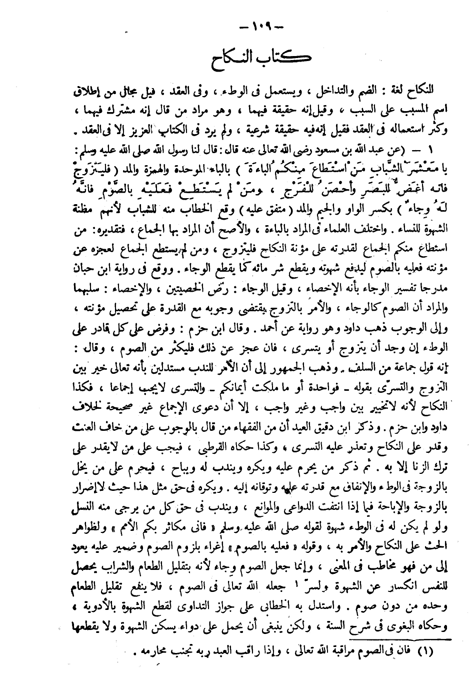 1- عن عبد الله ابن مسعود رضي الله تعالى عنه قال قال رسول الله صلى الله عليه وسلم: "يا معشر الشباب من استطاع منكم الباءة بالباء الموحدة والهمزة والمد فليتزوج فإنه أغض للبصر وأحصن للفرج ومن لم يستطع فعليه بالصوم فإنه له وجاء" بكسر الواو والجيم والمد متفق عليه وقع الخطاب منه للشباب لأنهم مظنة الشهوة للنساء واختلف العلماء في المراد بالباءة والأصح أن المراد بها الجماع فتقديره من استطاع منكم الجماع لقدرته على مؤنة النكاح فليتزوج ومن لم يستطع الجماع لعجزه عن مؤنته فعليه بالصوم ليدفع شهوته ويقطع شر مائه كما يقطع الوجاء ووقع في رواية ابن حبان مدرجا تفسير الوجاء بأنه الإخصاء وقيل الوجاء رض الخصيتين والإخصاء سلبهما والمراد أن الصوم كالوجاء والأمر بالتزوج يقتضي وجوبه مع القدرة على تحصيل مؤنته وإلى الوجوب ذهب داود وهو رواية عن أحمد وقال ابن حزم وفرض على كل قادر على الوطء إن وجد أن يتزوج أو يتسرى فإن عجز عن ذلك فليكثر من الصوم وقال إنه قول جماعة من السلف وذهب الجمهور إلى أن الأمر للندب مستدلين بأنه تعالى خير بين التزوج والتسري بقوله: {فَوَاحِدَةً أَوْ مَا مَلَكَتْ أَيْمَانُكُمْ} والتسري لا يجب إجماعا فكذا النكاح لأنه لا تخيير بين واجب وغير واجب إلا أن دعوى الإجماع غير صحيحة لخلاف داود وابن حزم وذكر ابن دقيق العيد أن من الفقهاء من قال بالوجوب على من خاف العنت وقدر على النكاح وتعذر عليه التسري وكذا حكاه القرطبي فيجب على من لا يقدر على ترك الزنا إلا به ثم ذكر من يحرم عليه ويكره ويندب له ويباح فيحرم على من يخل بالزوجة في الوطء والإنفاق مع قدرته عليه وتوقانه إليه ويكره في حق مثل هذا حيث لا إضرار بالزوجة والإباحة فيما إذا انتفت الدواعي والموانع ويندب في حق كل من يرجى منه النسل ولو لم يكن له في الوطء شهوة لقوله صلى الله عليه وسلم "فإني مكاثر بكم الأمم" ولظواهر الحث على النكاح والأمر به وقوله " فعليه بالصوم" إغراء بلزوم الصوم وضمير عليه يعود إلى من فهو مخاطب في المعنى وإنما جعل الصوم وجاء لأنه بتقليل الطعام والشراب يحصل للنفس إنكسار عن الشهوة ولسر جعله الله تعالى في الصوم فلا ينفع تقليل الطعام وحده من دون صوم واستدل به الخطابي على جواز التداوي لقطع الشهوة بالأدوية وحكاه البغوي في شرح السنة ولكن ينبغي أن يحمل على دواء يسكن الشهوة ولا يقطعها
