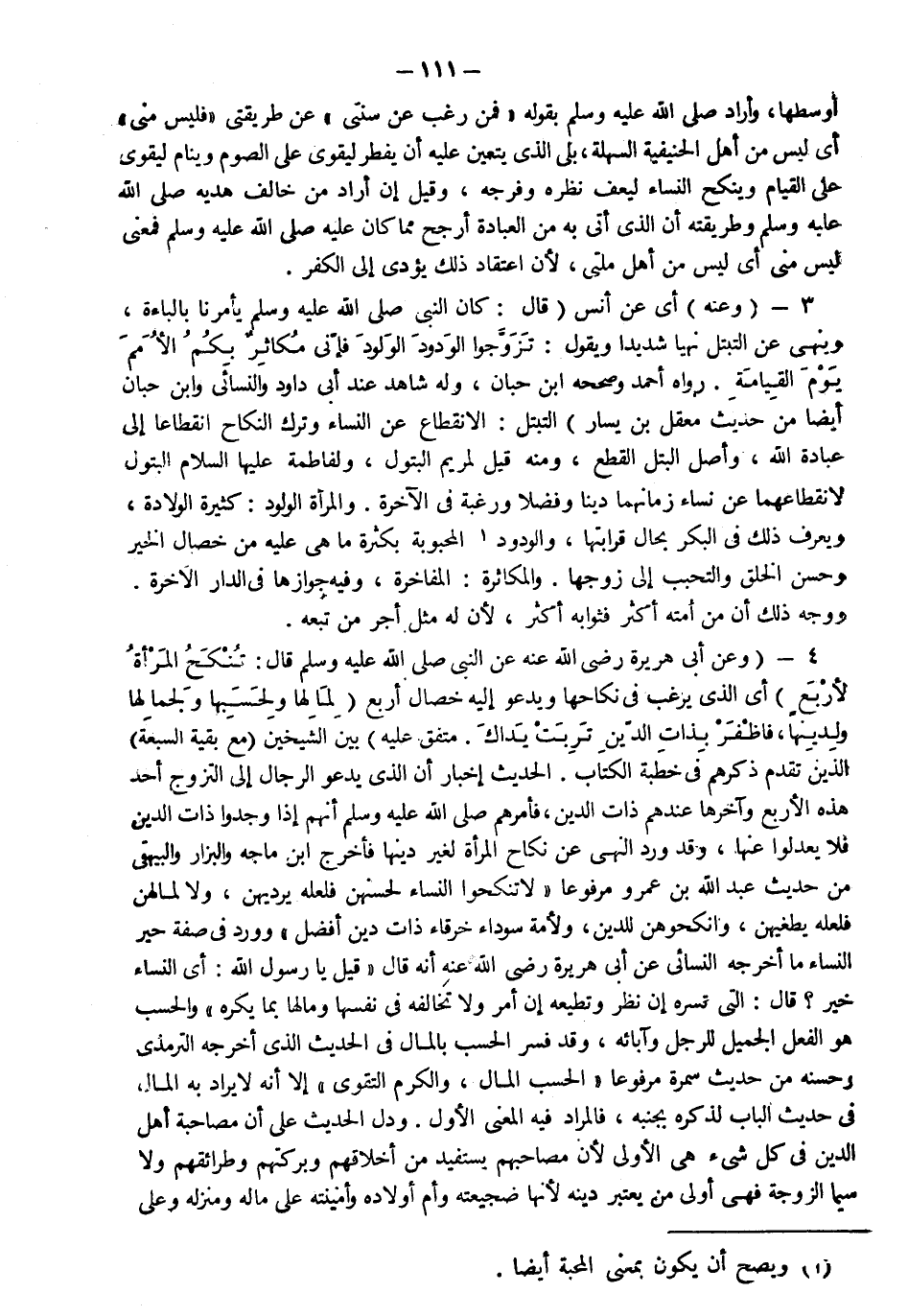 3- وعنه أي عن أنس قال: "كان رسول الله صلى الله عليه وسلم يأمرنا بالباءة وينهى عن التبتل نهيا شديدا ويقول "تزوجوا الودود الولود فإني مكاثر بكم الأنبياء يوم القيامة" رواه أحمد وصححه ابن حبان وله شاهد عند أبي داود والنسائي وابن حبان من حديث معقل بن يسار التبتل الانقطاع عن النساء وترك النكاح انقطاعا إلى عبادة الله وأصل البتل القطع ومنه قيل لمريم البتول وفاطمة عليها السلام البتول لانقطاعهما عن نساء زمانهما دينا وفضلا ورغبة في الآخرة والمرأة الولود كثيرة الولادة ويعرف ذلك في البكر بحال قرابتها والودود المحبوبة بكثرة ما هي عليه من خصال الخير وحسن الخلق والتحبب إلى زوجها والمكاثرة المفاخرة وفيه جوازها في الدار الآخرة ووجه ذلك أن من أمته أكثر فثوابه أكثر لأن له مثل أجر من تبعه