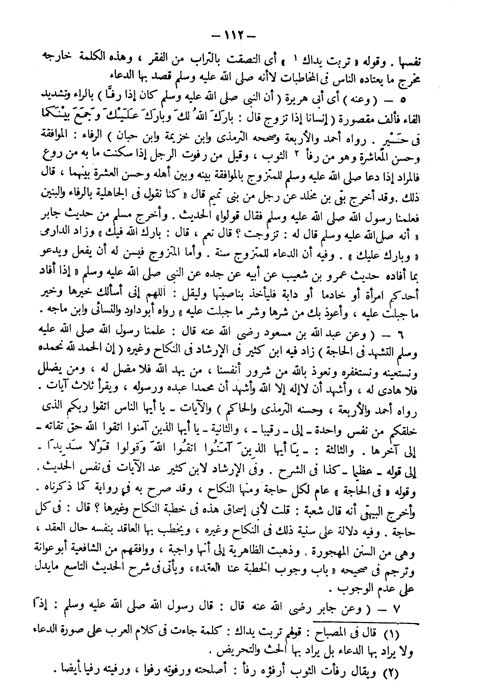 5- وعنه أي أبي هريرة أن النبي صلى الله عليه وسلم كان إذا رفىّ بالراء وتشديد الفاء فألف مقصورة إنسانا إذا تزوج قال: "بارك الله لك وبارك عليك وجمع بينكما في خير" رواه أحمد والأربعة وصححه الترمذي وابن خزيمة وابن حبان الرفاء الموافقة وحسن المعاشرة وهو من رفأ الثوب وقيل من رفوت الرجل إذا سكنت ما به من روع فالمراد إذا دعا صلى الله عليه وسلم للمتزوج بالموافقة بينه وبين أهله وحسن العشرة بينهما قال ذلك وقد أخرج بقي بن مخلد عن رجل من بني تميم قال كنا نقول في الجاهلية بالرفاء والبنين فعلمنا رسول الله صلى الله عليه وسلم فقال قولوا الحديث وأخرج مسلم من حديث جابر أنه صلى الله عليه وسلم قال له تزوجت قال نعم قال بارك الله فيك وزاد الدارمي وبارك عليك وفيه أن الدعاء للمتزوج سنة وأما المتزوج فيسن له أن يفعل ويدعو بما أفاده حديث عمرو بن شعيب عن أبيه عن جده عن النبي صلى الله عليه وسلم إذا أفاد أحدكم امرأة أو خادما أو دابة فليأخذ بناصيتها وليقل: "اللهم إني أسألك خيرها وخير ما جبلت عليه وأعوذ بك من شرها وشر ما جبلت عليه" رواه أبو داود والنسائي وابن ماجه