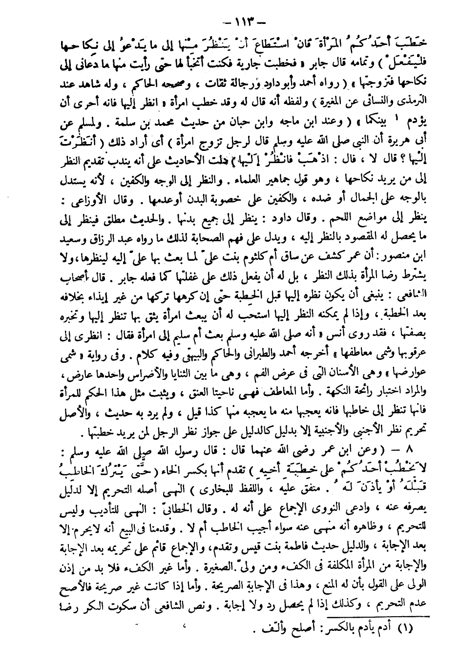 خطب أحدكم المرأة فإن استطاع أن ينظر منها إلى ما يدعو إلى نكاحها فليفعل" وتمامه قال جابر: فخطبت جارية فكنت أتخبأ لها حتى رأيت منها ما دعاني إلى نكاحها فتزوجتها رواه أحمد وأبو داود ورجاله ثقات وصححه الحاكم وله شاهد عند الترمذي والنسائي عن المغيرة ولفظه أنه قال له وقد خطب امرأة "انظر إليها فإنه أحرى أن يؤدم بينكما" وعند ابن ماجه وابن حبان من حديث محمد بن سلمة ولمسلم عن أبي هريرة أن النبي صلى الله عليه وسلم قال لرجل تزوج امرأة أي أراد ذلك " أنظرت إليها" قال لا قال: "اذهب فانظر إليها" دلت الأحاديث على أنه يندب تقديم النظر إلى من يريد نكاحها وهو قول جماهير العلماء والنظر إلى الوجه والكفين لأنه يستدل بالوجه على الجمال أو ضده والكفين على خصوبة البدن أو عدمها وقال الأوزاعي ينظر إلى مواضع اللحم وقال داود ينظر إلى جميع بدنها والحديث مطلق فينظر إلى ما يحصل له إليه ويدل على فهم الصحابة لذلك ما رواه عبد الرزاق وسعيد بن منصور أن عمر كشف عن ساق أم كلثوم بنت علي لما بعث بها علي إليه لينظرها ولا يشترط رضا المرأة بذلك النظر بل له أن يفعل ذلك على غفلتها كما فعله جابر قال أصحاب الشافعي ينبغي أن يكون نظره إليها قبل الخطبة حتى إن كرهها تركها من غير إيذاء بخلافه بعد الخطبة وإذا لم يمكنه النظر إليها استحب له أن يبعث امرأة يثق بها تنظر إليها وتخبره بصفتها فقد روى أنس أنه صلى الله عليه وسلم بعث أم سليم إلى امرأة فقال انظري إلى عرقوبها وشمي معاطفها أخرجه أحمد والطبراني والحاكم والبيهقي وفيه كلام وفي رواية شمي عوارضها وهي الأإطعام التي في عرض الفم وهي ما بين الثنايا والأضراس واحدها عارض والمراد اختبار رائحة النكهة وأما المعاطف فهي ناحيتا العنق ويثبت مثل هذا الحكم للمرأة فإنها تنظر إلى خاطبها فإنه يعجبها منه ما يعجبه منها كذا قيل ولم يرد به حديث والأصل تحريم نظر الأجنبي والأجنبية إلا بدليل كالدليل على جواز نظر الرجل لمن يريد خطبتها