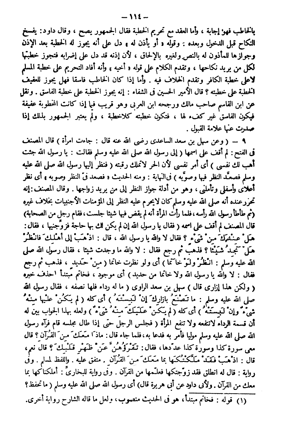 9- وعن سهل بن سعد الساعدي رضي الله عنه قال جاءت امرأة قال المصنف في الفتح لم أقف على اسمها إلى رسول الله صلى الله عليه وسلم فقالت يا رسول الله: جئت أهب لك نفسي أي أمر نفسي لأن الحر لا تملك رقبته "فنظر إليها رسول الله صلى الله عليه وسلم فصعد النظر فيها وصوبه" في النهاية ومنه الحديث "فصعد في النظر وصوبه" أي نظر أعلاي وأسفلي وتأملني وهو من أدلة جواز النظر إلى من يريد زواجها وقال المصنف إنه تحرر عنده أنه صلى الله عليه وسلم كان لا يحرم عليه النظر إلى المؤمنات الأجنبيات بخلاف غيره "ثم طأطأ رسول الله صلى الله عليه وسلم رأسه" فلما رأت المرأة أنه لم يقض فيها شيئا جلست فقام رجل من الصحابة قال المصنف لم أقف على اسمه فقال يا رسول الله: إن لم يكن لك بها حاجة فزوجنيها فقال: "فهل عندك من شيء" فقال: لا والله يا رسول الله قال: "اذهب إلى أهلك فانظر هل تجد شيئا" فذهب ثم رجع فقال: لا والله ما وجدت شيئا فقال رسول الله صلى الله عليه وسلم: "انظر ولو خاتما" أي ولو نظرت خاتما "من حديد" فذهب ثم رجع فقال: لا والله يا رسول الله ولا خاتما من حديد أي موجود فخاتم مبتدأ حذف خبره ولكن هذا إزاري قال سهل بن سعد الراوي ماله رداء فلها نصفه فقال رسول الله صلى الله عليه وسلم "ما تصنع بإزارك إن لبسته" أي كله "لم يكن عليها منه شيء وإن لبسته" أي كله "لم يكن عليك منه شيء" ولعله بهذا الجواب بين له أن قسمة الرداء لا تنفعه ولا تنفع المرأة فجلس الرجل حتى إذا طال مجلسه قام فرآه رسول الله صلى الله عليه وسلم موليا فأمر به فدعي به فلما جاء قال: "ماذا معك من القرآن" قال معي سورة كذا وسورة كذا عددها فقال: "تقرؤهن عن ظهر قلبك" قال نعم قال: "اذهب فقد ملكتكها بما معك من القرآن" متفق عليه واللفظ لمسلم وفي رواية قال انطلق فقد زوجتكها فعلمها من القرآن وفي رواية للبخاري "أملكناكها بما معك من القرآن" ولأبي داود عن أبي هريرة قال أي رسول الله صلى الله عليه وسلم: "ما تحفظ؟"