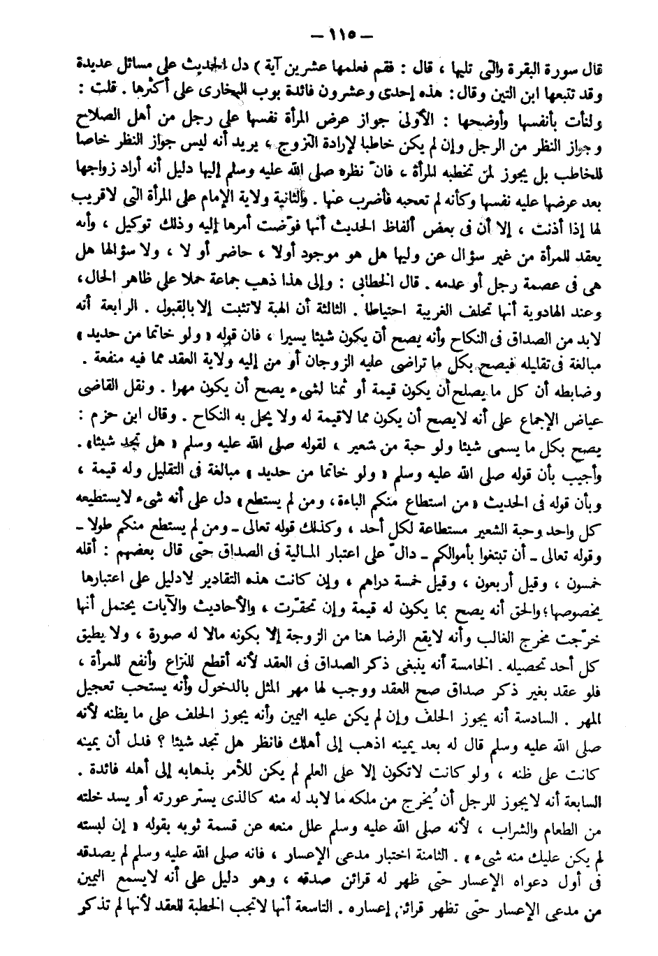 قال سورة البقرة والتي تليها قال: "قم فعلمها عشرين" آية دل الحديث على مسائل عديدة وقد تتبعها ابن التين وقال هذه إحدى وعشرين فائدة بوب البخاري على أكثرها قلت ولنأت بأنفسها وأوضحها الأولى جواز عرض المرأة نفسها على رجل من أهل الصلاح وجواز النظر من الرجل وإن لم يكن خاطبا لإرادة التزوج يريد أنه ليس جواز النظر الموطأ للخاطب بل يجوز لمن تخطبه المرأة فإن نظره صلى الله عليه وسلم إليها دليل أنه أراد زواجها بعد عرضها عليه نفسها وكأنها لم تعجبه فأضرب عنها والثانية ولاية الإمام على المرأة التي لا قريب لها إذا أذنت إلا أن في بعض ألفاظ الحديث أنها فوضت أمرها إليه وذلك توكيل وأنه يعقد للمرأة من غير سؤال عن وليها هل هو موجود أو لا حاضر أو لا وسؤالها هل هي في عصمة رجل أو عدمه قال الخطابي وإلى هذا ذهب جماعة حملا على ظاهر الحال وعند الهادوية أنها تحلف الغريبة احتياطا الثالثة: أن الهبة لا تثبت إلا بالقبول الرابعة: أنه لا بد من الصداق في النكاح وأنه يصح أن يكون شيئا يسيرا فإن قوله "ولو خاتما من حديد" مبالغة في تقليله فيصح بكل ما تراضى عليه الزوجان أو من إليه ولاية العقد مما فيه منفعة وضابطه أن كل ما يصلح أن يكون قيمة أو ثمنا لشيء يصح أن يكون مهرا ونقل القاضي عياض الإجماع على أنه لا يصح أن يكون مما لا قيمة له ولا يحل به النكاح وقال ابن حزم يصح بكل ما يسمى شيئا ولو حبة من شعير لقوله صلى الله عليه وسلم "هل تجد شيئا" وأجيب بأن قوله صلى الله عليه وسلم "ولو خاتما من حديد" مبالغة في التقليل وله قيمة وبأن قوله في الحديث "من استطاع منكم الباءة ومن لم يستطع" دل على أنه شيء لا يستطيعه كل واحد وحبة الشعير مستطاعة لكل أحد وكذلك قوله تعالى: {وَمَنْ لَمْ يَسْتَطِعْ مِنْكُمْ طَوْلاً} وقوله تعالى: {نْ تَبْتَغُوا بِأَمْوَالِكُمْ} دال على اعتبار المالية في الصداق حتى قال بعضهم أقله خمسون وقيل أربعون وقيل خمسة دراهم وإن كانت هذه التقادير لا دليل على اعتبارها بخصوصها والحق أنه يصح بما يكون له قيمة وإن تحقرت والأحاديث والآيات يحتمل أنها خرجت مخرج الغالب وأنه لا يقع الرضا هنا من الزوجة إلا بكونه مالا له صورة ولا يطيق كل أحد تحصيله الخامسة أنه ينبغي ذكر الصداق في العقد لأنه أقطع للنزاع وأنفع للمرأة فلو عقد بغير ذكر صداق صح العقد ووجب لها مهر المثل بالدخول وأنه يستحب تعجيل المهر السادسة أنه يجوز الحلف وإن لم يكن عليه اليمين وأنه يجوز الحلف على ما يظنه لأنه صلى الله عليه وسلم قال له بعد يمينه اذهب إلى أهلك فانظر هل تجد شيئا فدل أن يمينه كانت على ظنه ولو كانت لا تكون إلا على العلم لم يكن للأمر بذهابه إلى أهله فائدة السابعة أنه لا يجوز للرجل أن يخرج من ملكه ما لا بد له منه كالذي يستر عورته أو يسد خلته من الطعام والشراب لأنه صلى الله عليه وسلم علل منعه عن قسمة ثوبه بقوله "إن لبسته لم يكن عليك منه شيء" الثامنة اختبار مدعي الإعسار فإنه صلى الله عليه وسلم لم يصدقه في أول دعواه الإعسار حتى ظهر له قرائن صدقه وهو دليل على أنه لا يسمع اليمين من مدعي الإعسار حتى تظهر قرائن إعساره التاسعة أنها لا تجب الخطبة للعقد لأنها لم تذكر