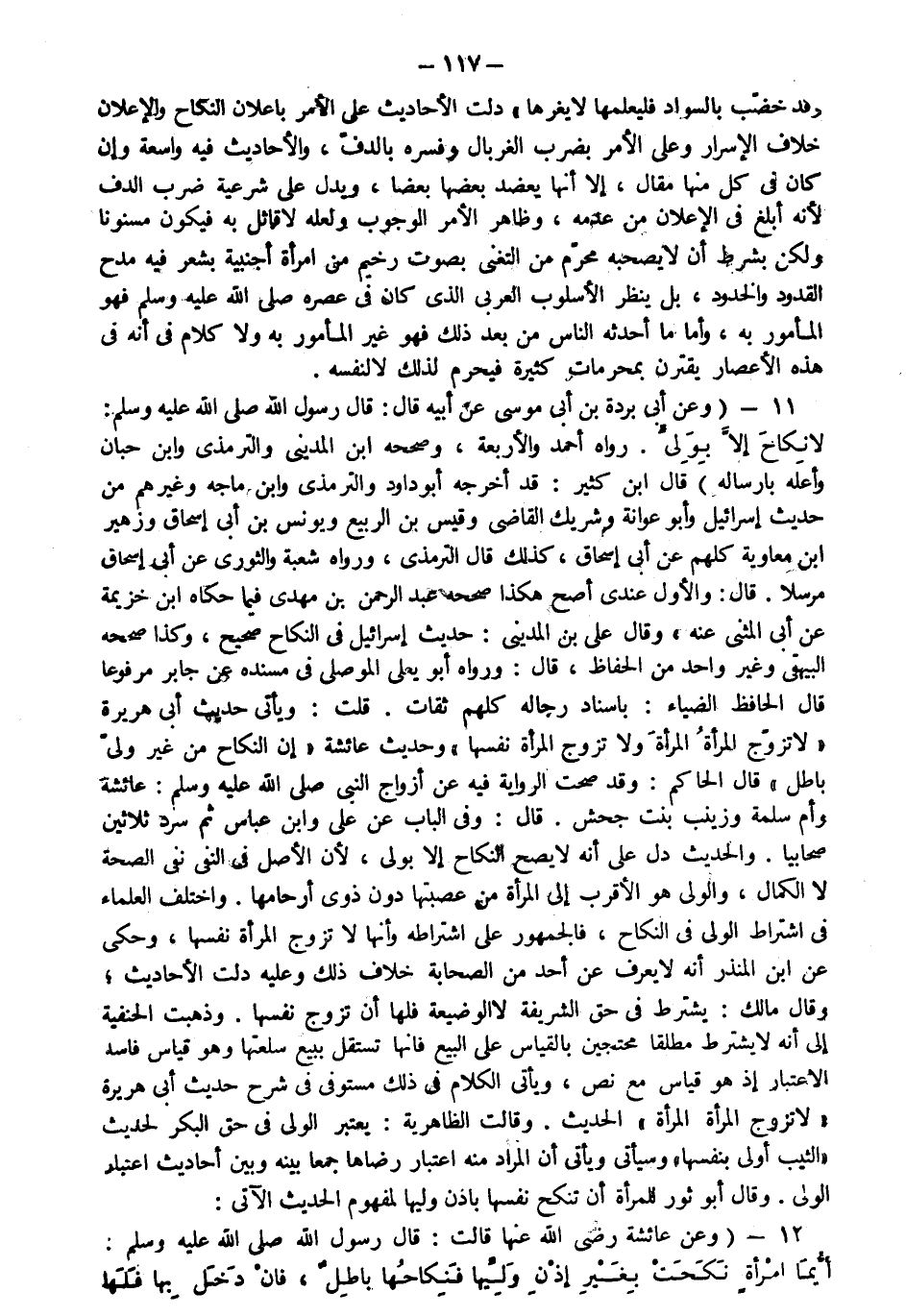 11- وعن أبي بردة بن أبي موسى عن أبيه قال قال رسول الله صلى الله عليه وسلم: "لا نكاح إلا بولي" رواه أحمد والأربعة وصححه ابن المديني والترمذي وابن حبان وأعله بإرساله قال ابن كثير قد أخرجه أبو داود والترمذي وابن ماجه وغيرهم من حديث إسرائيل وأبو عوانة وشريح القاضي وقيس بن الربيع ويونس بن أبي إسحاق وزهير بن معاوية كلهم عن أبي إسحاق كذلك قال الترمذي ورواه شعبة والثوري عن أبي إسحاق مرسلا قال والأول عندي أصح هكذا صححه عبد الرحمن بن مهدي فيما حكاه ابن خزيمة عن أبي المثنى عنه وقال علي بن المديني حديث إسرائيل في النكاح صحيح وكذا صححه البيهقي وغير واحد من الحفاظ قال ورواه أبو يعلى الموصلي في مسنده عن جابر مرفوعا قال الحافظ الضياء بإسناد رجاله كلهم ثقات قلت ويأتي حديث أبي هريرة لا تزوج المرأة المرأة ولا تزوج المرأة نفسها وحديث عائشة إن النكاح من غير ولي باطل قال الحاكم وقد صحت الرواية فيه عن أزواج النبي صلى الله عليه وسلم عائشة وأم سلمة وزينب بنت جحش قال وفي الباب عن علي وابن عباس ثم سرد ثلاثين صحابيا والحديث دل على أنه لا يصح النكاح إلا بولي لأن الأصل في النفي نفي الصحة لا الكمال والولي هو الأقرب إلى المرأة من عصبتها دون ذوي أرحامها واختلف العلماء في اشتراط الولي في النكاح فالجمهور على اشتراطه وأنها لا تزوج المرأة نفسها وحكى عن ابن المنذر أنه لا يعرف عن أحد من الصحابة خلاف ذلك وعليه دلت الأحاديث وقال مالك يشترط في حق الشريفة لا الوضيعة فلها أن تزوج نفسها وذهبت الحنفية إلى أنه لا يشترط مطلقا محتجين بالقياس على البيع فإنها تستقل ببيع سلعتها وهو قياس فاسد الاعتبار إذ هو قياس مع نص ويأتي الكلام في ذلك مستوفى في شرح حديث أبي هريرة لا تزوج المرأة المرأة الحديث وقالت الظاهرية يعتبر الولي في حق البكر لحديث "الثيب أولى بنفسها" وسيأتي ويأتي أن المراد منه اعتبار رضاها جمعا بينه وبين أحاديث اعتبار الولي وقال أبو ثور للمرأة أن تنكح نفسها بإذن وليها لمفهوم الحديث الآتي