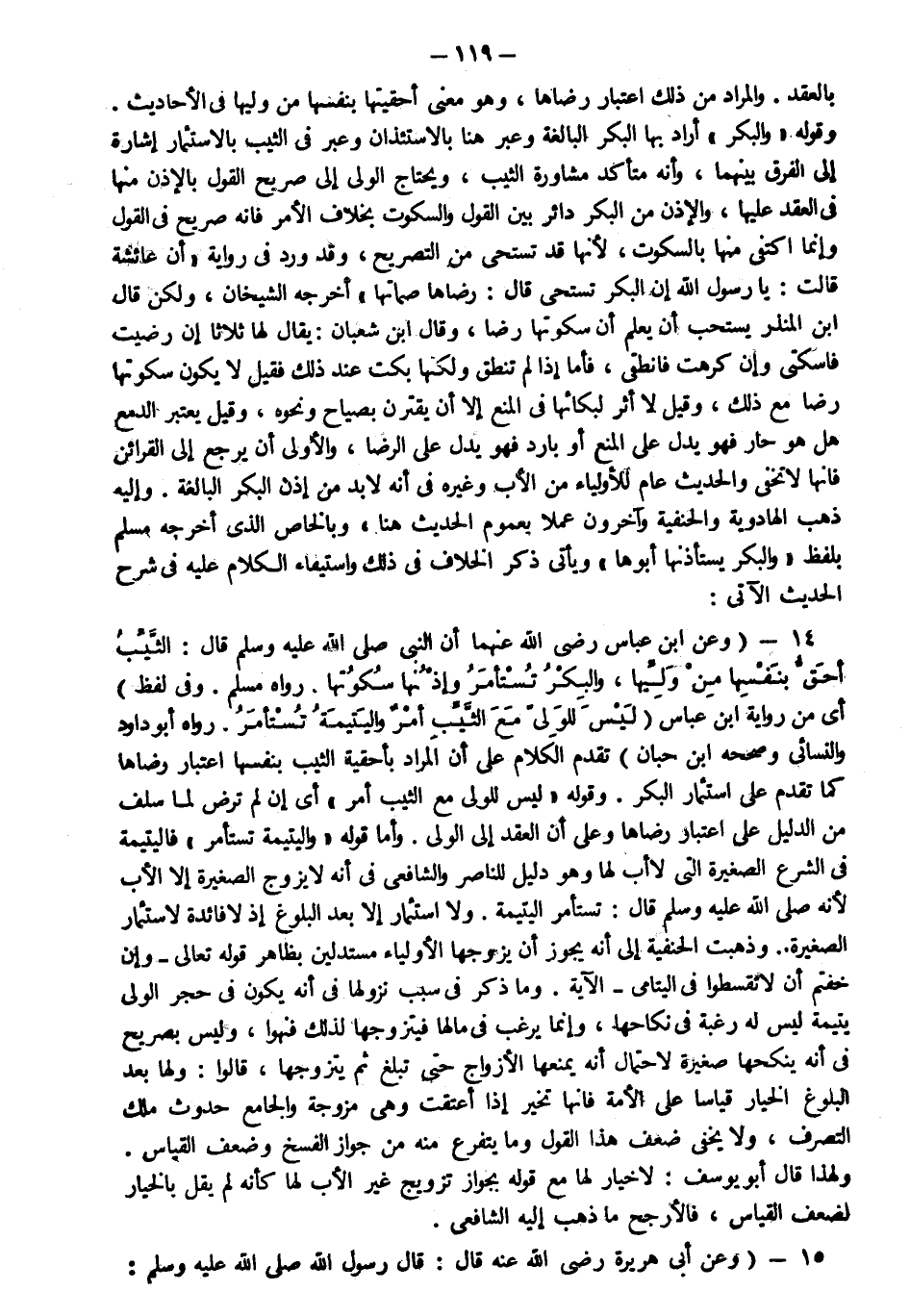 14- وعن ابن عباس رضي الله عنه أن النبي صلى الله عليه وسلم قال: "الثيب أحق بنفسها من وليها والبكر تستأمر وإذنها سكوتها" رواه مسلم وفي لفظ أي من رواية ابن عباس "ليس للولي مع الثيب أمر واليتيمة تستأمر" رواه أبو داود والنسائي وصححه ابن حبان تقدم الكلام على أن المراد بأحقية الثيب بنفسها اعتبار رضاها كما تقدم على استئمار البكر وقوله "ليس للولي مع الثيب أمر" أي إن لم ترض لما سلف من الدليل على اعتبار رضاها وعلى أن العقد إلى الولي وأما قوله "واليتمية تستأمر" فاليتيمة في الشرع الصغيرة التي لا أب لها وهو دليل للناصر والشافعي في أنه لا يزوج الصغيرة إلا الأب لأنه صلى الله عليه وسلم قال تستأمر اليتيمة ولا استئمار إلا بعد البلوغ إذ لا فائدة لاستئمار الصغيرة وذهب الحنفية إلى أنه يجوز أن يزوجها الأولياء مستدلين بظاهر قوله تعالى: {وَإِنْ خِفْتُمْ أَلَّا تُقْسِطُوا فِي الْيَتَامَى} الآية وما ذكر في سبب نزولها في أن يكون في حجر الولي ليس له رغبة في نكاحها وإنما يرغب في مالها فيتزوجها لذلك فنهوا وليس بصريح في أنه ينكحها صغيرة لاحتمال أنه يمنعها الأزواج حتى تبلغ ثم يتزوجها قالوا ولها بعد البلوغ الخيار قياسا على الأمة فإنها تخير إذا أعتقت وهي مزوجة والجامع حدوث ملك التصرف ولا يخفى ضعف هذا القول وما يتفرع من جواز الفسخ وضعف القياس ولهذا قال أبو يوسف لا خيار لها مع قوله بجواز تزويج غير الأب لها كأنه لم يقل بالخيار لضعف القياس فالأرجح ما ذهب إليه الشافعي