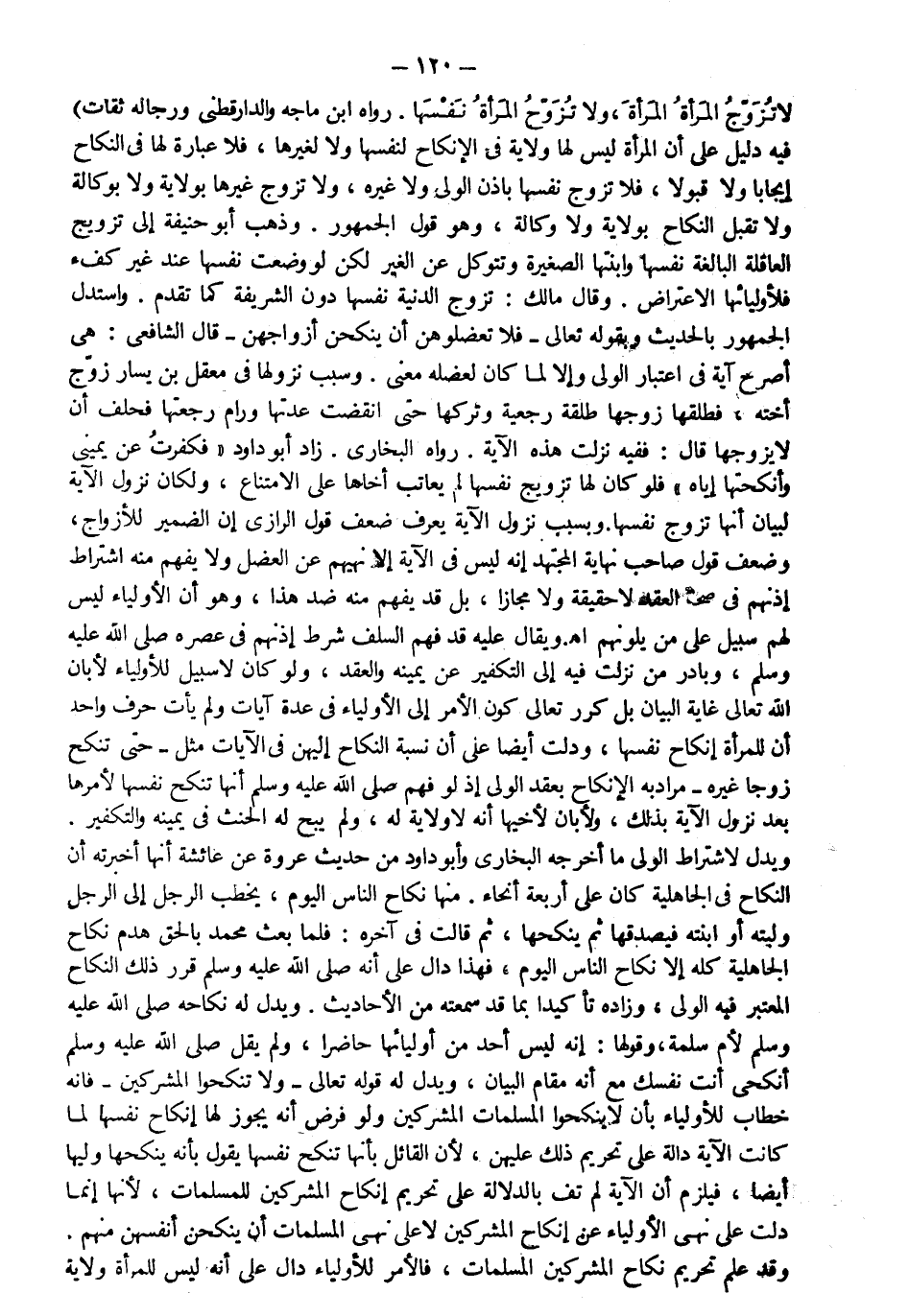 "لا تزوج المرأة المرأة ولا تزوج المرأة نفسها" رواه ابن ماجه والدارقطني ورجاله ثقات فيه دليل على أن المرأة ليس لها ولاية في الإنكاح لنفسها ولا لغيرها فلا عبرة لها في النكاح إيجابا ولا قبولا فلا تزوج نفسها بإذن الولي ولا غيره ولا تزوج غيرها بولاية ولا بوكالة ولا تقبل النكاح بولاية ولا وكالة وهو قول الجمهور وذهب أبو حنيفة إلى تزويج العاقلة البالغة نفسها وابنتها الصغيرة وتتوكل عن الغير لكن لو وضعت نفسها عند غير كفء فلأوليائها الاعتراض وقال مالك تزوج الدنية نفسها دون الشريفة كما تقدم واستدل الجمهور بالحديث بقوله تعالى: {فَلا تَعْضُلُوهُنَّ أَنْ يَنْكِحْنَ أَزْوَاجَهُنَّ} قال الشافعي: هي أصرح آية في اعتبار الولي وإلا لما كان لعضله معنى وسبب نزولها في معقل بن يسار زوج أخته فطلقها زوجها طلقة رجعية وتركها حتى انقضت عدتها ورام رجعتها فحلف أن لا يزوجها قال ففيه نزلت هذه الآية رواه البخاري زاد أبو داود فكفرت عن يميني وأنكحتها إياه فلو كان لها تزويج نفسها لم يعاتب أخاها على الامتناع ولكان نزول الآية لبيان أنها تزوج نفسها وبسبب نزول الآية يعرف ضعف قول الرازي إن الضمير للأزواج وضعف قول صاحب نهاية المجتهد إنه ليس في الآية إلا نهيهم عن العضل ولا يفهم منه اشتراط إذنهم في صحة العقد لا حقيقة ولا مجازا بل قد يفهم منه ضد هذا وهو أن الأولياء ليس لهم سبيل على من يلونهم اه ويقال عليه قد فهم السلف شرط إذنهم في عصره صلى الله عليه وسلم وبادر من نزلت فيه إلى التكفير عن يمينه والعقد ولو كان لا سبيل للأولياء لأبان الله تعالى غاية البيان بل كرر تعالى كون الأمر إلى الأولياء في عدة آيات ولم يأت حرف واحد أن للمرأة إنكاح نفسها ودلت أيضا أن نسبة النكاح إليهن في الآيات مثل {حَتَّى تَنْكِحَ زَوْجاً غَيْرَهُ} ومراد به الإنكاح بعقد الولي إذ لو فهم صلى الله عليه وسلم أنها تنكح نفسها لأمرها بعد نزول الآية بذلك ولأبان لأخيها أنه لا ولاية له ولم يبح له الحنث في يمينه والتكفير ويدل لاشتراط الولي ما أخرجه البخاري وأبو داود من حديث عروة عن عائشة أنها أخبرته أن النكاح في الجاهلية كان على أربعة أنحاء منها نكاح الناس اليوم يخطب الرجل إلى الرجل وليته أو ابنته فيصدقها ثم ينكحها ثم قالت في آخره فلما بعث محمد الفراش هدم نكاح الجاهلية كله إلا نكاح الناس اليوم فهذا دال على أنه صلى الله عليه وسلم قرر ذلك النكاح المعتبر فيه الولي وزاده تأكيدا بما قد سمعت من الأحاديث ويدل على نكاحه صلى الله عليه وسلم لأم سلمة وقولها إنه ليس أحد من أوليائها حاضرا ولم يقل صلى الله عليه وسلم أنكحي أنت نفسك مع أنه مقام البيان ويدل له قوله تعالى: {وَلا تُنْكِحُوا الْمُشْرِكِينَ} فإنه خطاب للأولياء بأن لا ينكحوا المسلمات المشركين ولو فرض أنه يجوز لها إنكاح نفسها لما كانت الآية دالة على تحريم ذلك عليهن لأن القائل بأنها تنكح نفسها يقول بأنه ينكحها وليها أيضا فيلزم أن الآية لم تف بالدلالة على تحريم إنكاح المشركين للمسلمات لأنها إنما دلت على نهي الأولياء من إنكاح المشركين لا على نهي المسلمات أن ينكحن أنفسهن منهم وقد علم تحريم نكاح المشركين المسلمات فالأمر للأولياء دال على أنه ليس للمرأة ولاية