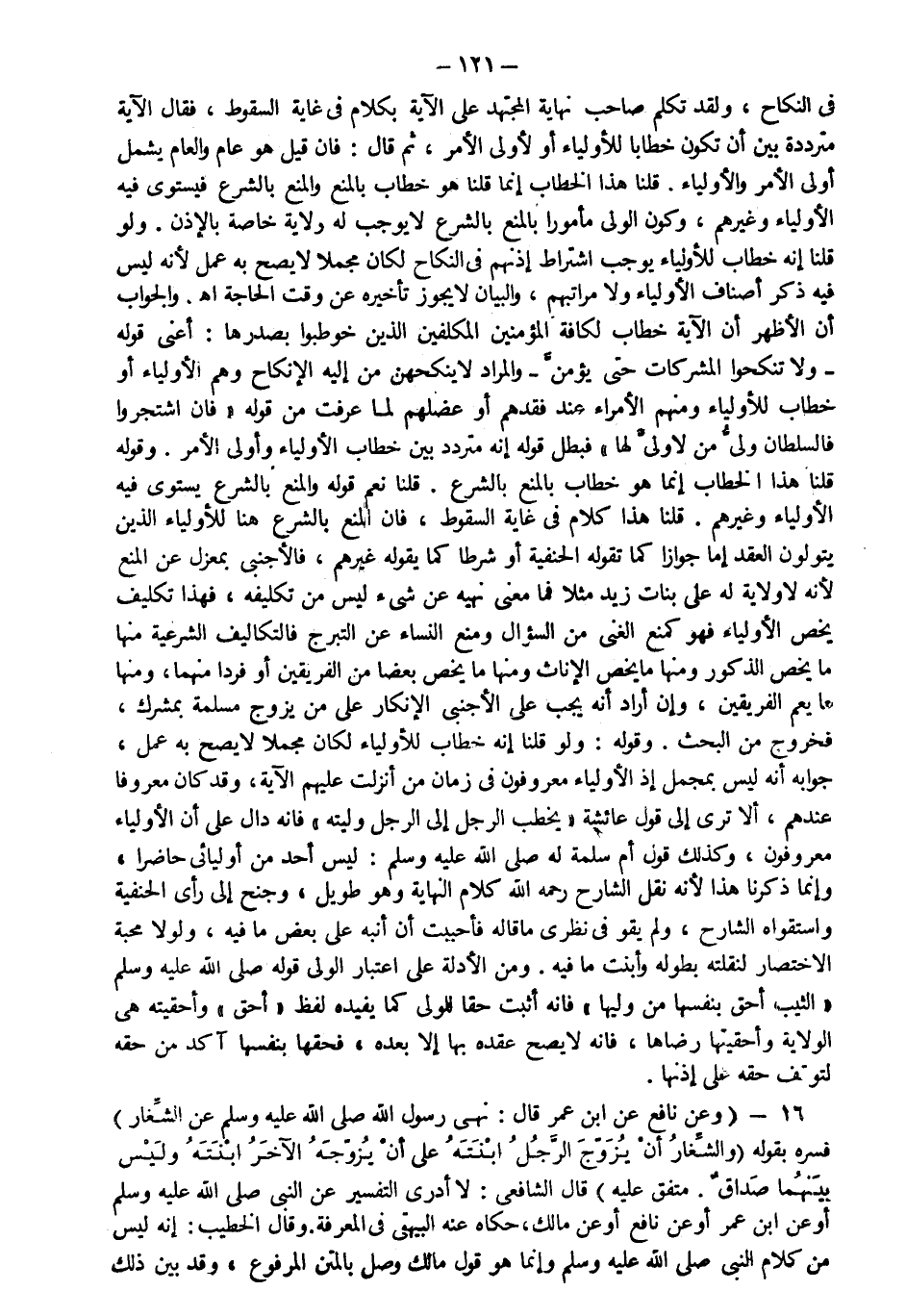 في النكاح ولقد تكلم صاحب نهاية المجتهد على الآية بكلام في غاية السقوط فقال الآية مترددة بين أن تكون خطابا للأولياء أو لأولي الأمر ثم قال فإن قيل هو عام والعام يشمل أولي الأمر والأولياء قلنا هذا الخطاب إنما هو خطاب بالمنع والمنع بالشرع فيستوي فيه الأولياء وغيرهم وكون الولي مأمورا بالمنع بالشرع لا يوجب له ولاية خاصة بالإذن ولو قلنا إنه خطاب للأولياء يوجب اشتراط إذنهم في النكاح لكان مجملا لا يصح به عمل لأنه ليس فيه ذكر أصناف الأولياء ولا مراتبهم والبيان لا يجوز تأخيره عن وقت الحاجة اه والجواب أن الأظهر أن الآية خطاب لكافة المؤمنين المكلفين الذين خوطبوا بصدرها أعني قوله: {وَلا تَنْكِحُوا الْمُشْرِكَاتِ حَتَّى يُؤْمِنَّ} والمراد لا ينكحهن من إليه الإنكاح وهم الأولياء أو خطاب للأولياء ومنهم الأمراء عند فقدهم أو عضلهم لما عرفت من قوله "فإن اشتجروا فالسلطان ولي من لا ولي لها" فبطل قوله إنه متردد بين خطاب الأولياء وأولي الأمر وقوله قلنا هذا الخطاب إنما هو خطاب بالمنع بالشرع قلنا نعم قوله والمنع بالشرع يستوي فيه الأولياء وغيرهم قلنا هذا كلام في غاية السقوط فإن المنع بالشرع هنا للأولياء الذين يتولون العقد إما جوازا كما تقوله الحنفية أو شرطا كما يقوله غيرهم فالأجنبي بمعزل عن المنع لأنه لا ولاية له على بنات زيد مثلا فما معنى نهيه عن شيء ليس من تكليفه فهذا تكليف يخص الأولياء فهو كمنع الغني من السؤال ومنع النساء عن التبرج فالتكاليف الشرعية منها ما يخص الذكور ومنها ما يخص الإناث ومنها ما يخص بعضا من الفريقين أو فردا منهما ومنها ما يعم الفريقين وإن أراد أنه يجب على الأجنبي الإنكار على من يزوج مسلمة بمشرك فخروج من البحث وقوله ولو قلنا إنه خطاب للأولياء لكان مجملا لا يصح به عمل جوابه أنه ليس بمجمل إذ الأولياء معروفون في زمان من أنزلت عليهم الآية وقد كان معروفا عندهم ألا ترى إلى قول عائشة يخطب الرجل إلى الرجل وليته فإنه دال على أن الأولياء معروفون وكذلك قول أم سلمة له صلى الله عليه وسلم ليس أحد من أوليائي حاضرا وإنما ذكرنا هذا لأنه نقل الشارح رحمه الله كلام النهاية وهو طويل وجنح إلى رأي الحنفية واستقواه الشارح ولم يقو في نظري ما قاله فأحببت أن أنبه على بعض ما فيه ولولا محبة الاختصار لنقلته بطوله وأبنت ما فيه ومن الأدلة على اعتبار الولي قوله صلى الله عليه وسلم الثيب أحق بنفسها من وليها فإنه أثبت حقا للولي كما يفيده لفظ أحق وأحقيته هي الولاية وأحقيتها رضاها فإنه لا يصح عقده بها إلا بعده فحقها بنفسها آكد من حقه لتوقف حقه على إذنها