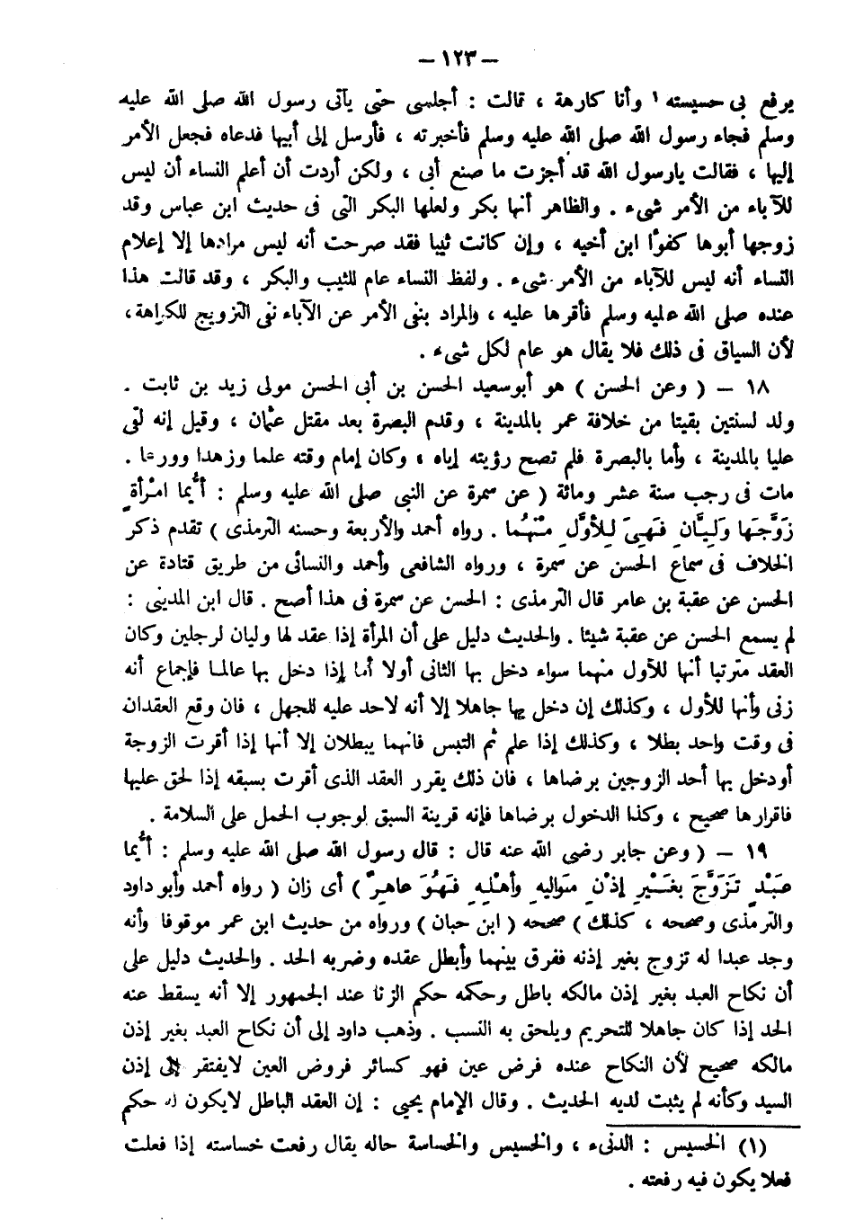 18- وعن الحسن هو أبو سعيد الحسن بن أبي الحسن مولى زيد بن ثابت ولد لسنتين بقيتا من خلافة عمر بالمدينة وقدم البصرة بعد مقتل عثمان وقيل إنه لقي عليا بالمدينة وأما بالبصرة فلم تصح رؤيته إياه وكان إمام وقته علما وزهدا وورعا مات في رجب سنة عشرة ومائة عن سمرة عن النبي صلى الله عليه وسلم "أيما امرأة زوجها وليان فهي للأول منهما" رواه أحمد والأربعة وحسنه الترمذي تقدم ذكر الخلاف في سماع الحسن من سمرة ورواه الشافعي وأحمد والنسائي من طريق قتادة عن الحسن عن عقبة بن عامر قال الترمذي الحسن عن سمرة في هذا أصح قال ابن المديني لم يسمع الحسن عن عقبة شيئا والحديث دليل على أن المرأة إذا عقد لها وليان لرجلين وكان العقد مترتبا أنها للأول منهما سواء دخل بها الثاني أو لا أما إذا دخل بها عالما فإجماع أنه زنا وأنها للأول وكذلك إن دخل بها جاهلا إلا أنه لا حد عليه للجهل فإن وقع العقدان في وقت واحد بطلا وكذا إذا علم ثم التبس فإنهما يبطلان إلا أنها إذا أقرت الزوجة أو دخل بها أحد الزوجين برضاها فإن ذلك يقرر العقد الذي أقرت بسبقه إذا لحق عليها فإقرارها صحيح وكذا الدخول برضاها فإنه قرينة السبق لوجوب الحمل على السلامة