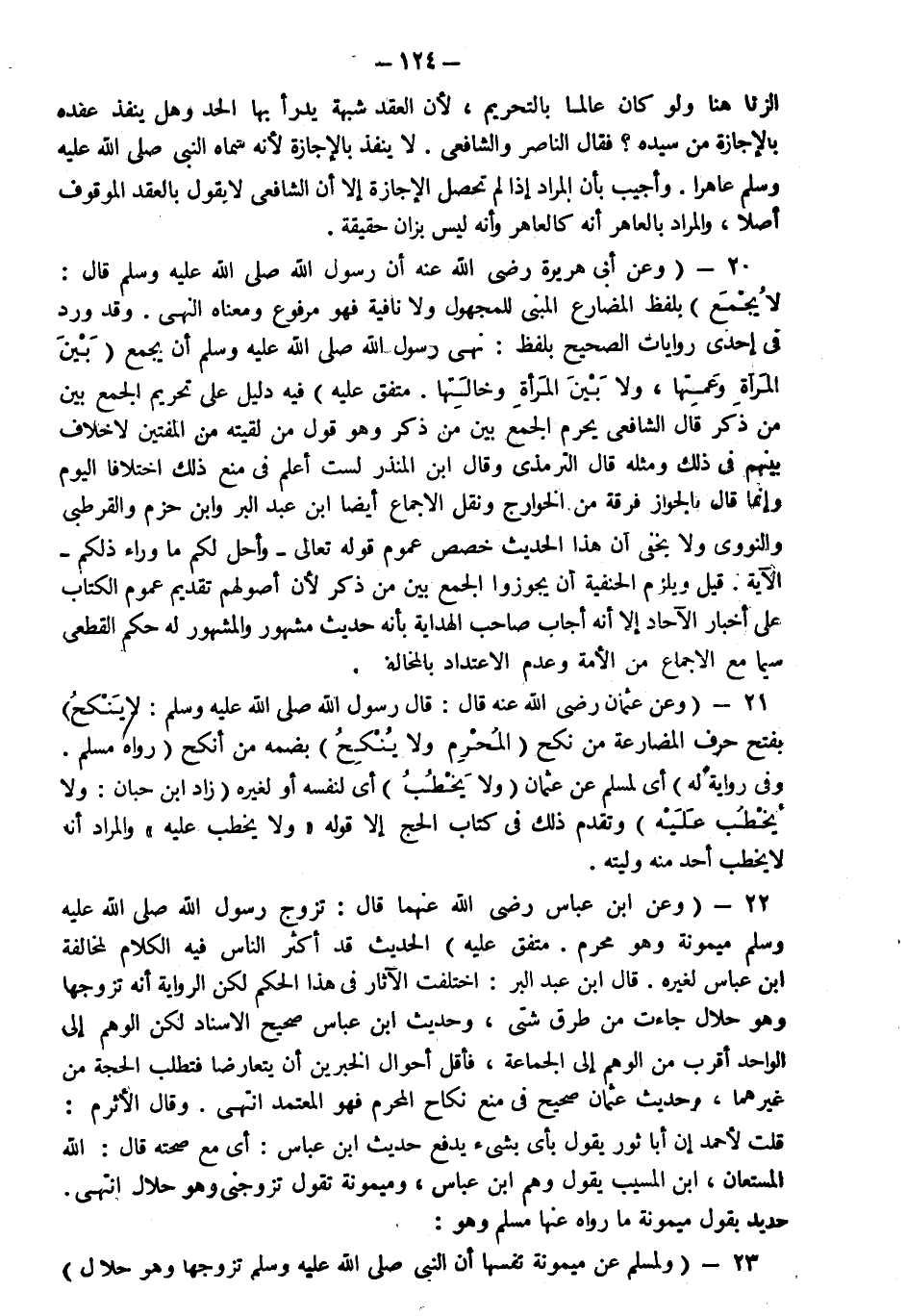 20- وعن أبي هريرة رضي الله عنه أن رسول الله صلى الله عليه وسلم قال: "لا يجمع" بلفظ المضارع المبني للمجهول و لا نافية فهو مرفوع ومعناه النهي وقد ورد في إحدى روايات الصحيح بلفظ "نهى رسول الله صلى الله عليه وسلم أن يجمع بين المرأة وعمتها ولا بين المرأة وخالتها" متفق عليه فيه دليل على تحريم الجمع بين من ذكر قال الشافعي يحرم الجمع بين من ذكر وهو قول من لقيته من المفتين لا خلاف بينهم في ذلك ومثله قال الترمذي وقال ابن المنذر لست أعلم في منع ذلك اختلافا اليوم وإنما قال بالجواز فرقة من الخوارج ونقل الإجماع أيضا ابن عبد البر وابن حزم والقرطبي والنووي ولا يخفى أن هذا الحديث خصص عموم قوله تعالى: {وَأُحِلَّ لَكُمْ مَا وَرَاءَ ذَلِكُمْ} الآية قيل ويلزم الحنفية أن يجوزوا الجمع بين من ذكر لأن أصولهم تقديم عموم الكتاب على أخبار الآحاد إلا أنه أجاب صاحب الهداية بأنه حديث مشهور والمشهور له حكم القطعي سيما مع الإجماع من الأمة وعدم الإعتداد بالمخالف