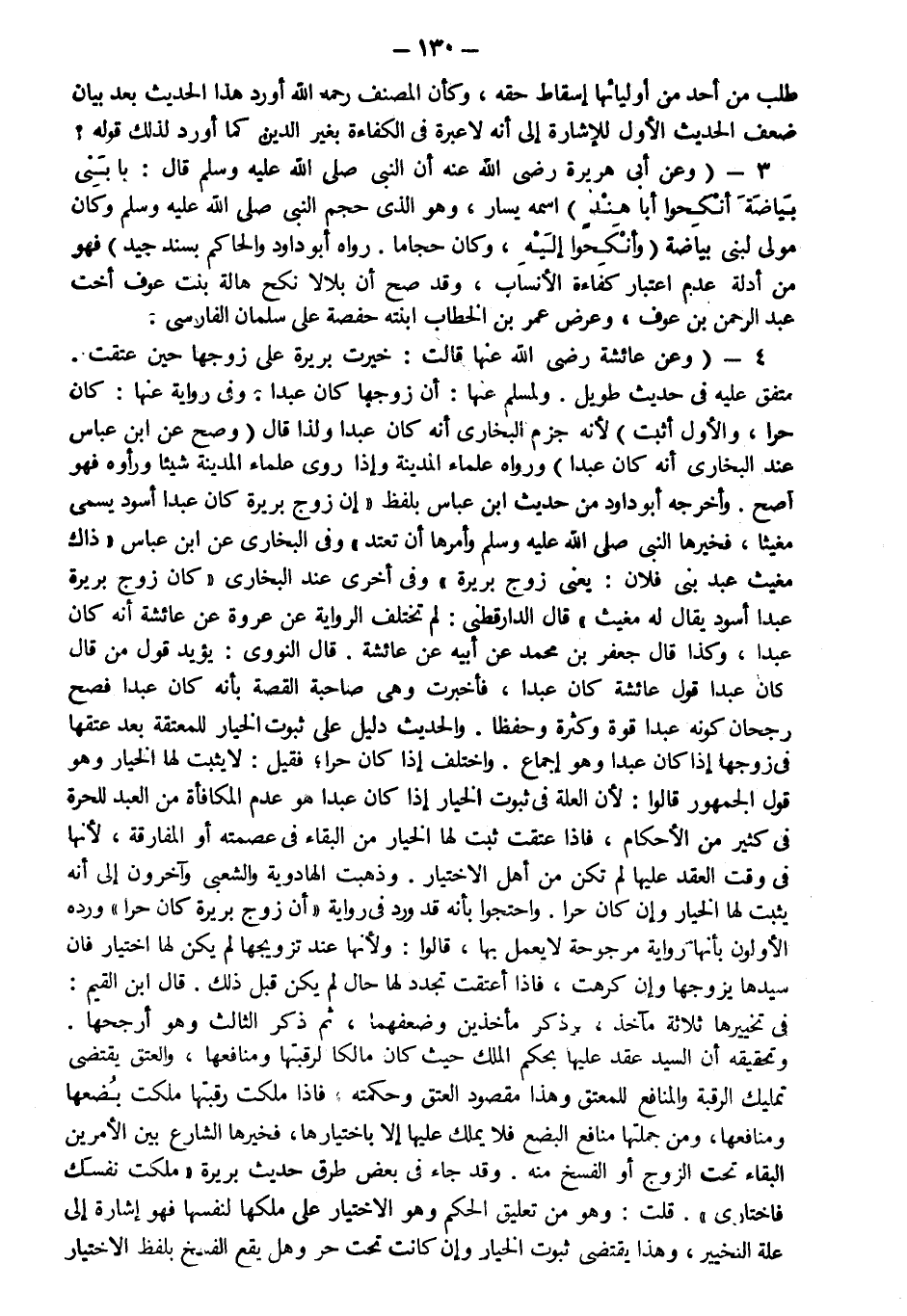 4- وعن عائشة رضي الله عنها قالت خيرت بريرة على زوجها حين عتقت متفق عليه في ولمسلم عنها رضي الله عنها أن زوجها كان عبدا وفي رواية عنها كان حرا والأول أثبت لأنه جزم البخاري أنه كان عبد الله ولذا قال وصح عن ابن عباس رضي الله عنه عند البخاري أنه كان عبدا ورواه علماء المدينة وإذا روى علماء المدينة شيئا ورأوه فهو أصح وأخرجه أبو داود من حديث ابن عباس بلفظ إن زوج بريرة كان عبدا أسود يسمى مغيثا فخيرها النبي صلى الله عليه وسلم وأمرها أن تعتد وفي البخاري عن ابن عباس ذاك مغيث عبد بني فلان يعني زوج بريرة وفي أخرى عند البخاري كان زوج بريرة عبدا أسود يقال له مغيث قال الدارقطني لم تختلف الرواية عن عروة عن عائشة أنه كان عبدا وكذا قال جعفر بن محمد عن أبيه عن عائشة قال النووي: يؤيد قول من قال كان عبدا قول عائشة كان عبدا فأخبرت وهي صاحبة القصة بأنه كان عبدا فصح رجحان كونه عبدا قوة وكثرة وحفظا والحديث دليل على ثبوت الخيار للمعتقة بعد عتقها في زوجها إذا كان عبدا وهو إجماع واختلف إذا كان حرا فقيل لايثبت لها الخيار وهو قول الجمهور قالوا: لأن العلة في ثبوت الخيار إذا كان عبدا هو عدم المكافأة من العبد للحرة في كثير من الأحكام فإذا عتقت ثبت لها الخيار من البقاء في عصمته أو المفارقة لأنها في وقت العقد عليها لم تكن من أهل الاختيار وذهبت الهادوية والشعبي وآخرون إلى أنه يثبت لها الخيار وإن كان حرا احتجوا بأنه قد ورد في رواية أن زوج بريرة كان حرا ورده الأولون بأنها رواية مرجوحة لا يعمل بها قالوا ولأنها عند تزويجها لم يكن لها اختيار فإن سيدها يزوجها وإن كرهت فإذا أعتقت تجدد لها حال لم يكن قبل ذلك قال ابن القيم في تخييرها ثلاثة مآخذ وذكر مأخذين وضعفهما ثم ذكر الثالث وهو أرجحها وتحقيقه أن السيد عقد عليها بحكم الملك حيث كان مالكا لرقبتها ومنافعها والعتق يقتضي تمليك الرقبة والمنافع للمعتق وهذا مقصود العتق وحكمته فإذا ملكت رقبتها ملكت بضعها ومنافعها ومن جملتها منافع البضع فلا يملك عليها إلا باختيارها فخيرها الشارع بين الأمرين البقاء تحت الزوج أو الفسخ منه وقد جاء في بعض طرق حديث بريرة ملكت نفسك فاختاري قلت وهو من تعليق الحكم وهو الاختيار على ملكها لنفسها فهو إشارة إلى علة التخيير وهذا يقتضي ثبوت الخيار إن كانت تحت حر وهل يقع الفسخ بلفظ الاختيار