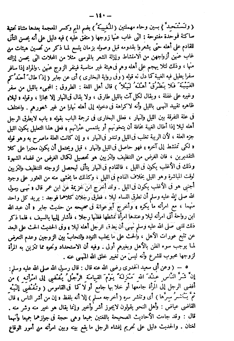 "وتستحد" بسين وحاء مهملتين "المغيبة" بضم الميم وكسر المعجمة بعدها مثناة تحتية ساكنة فموحدة مفتوحة التي غاب عنها زوجها متفق عليه فيه دليل على أنه يحسن التأني للقادم على أهله حتى يشعروا بقدومه قبل وصوله بزمان يتسع لما ذكر من تحسين هيئات من غاب عنهن أزواجهن من الامتشاط وإزالة الشعر بالموسى مثلا من المحلات التي يحسن إزالته منها وذلك لئلا يهجم على أهله وهم في هيئة غير مناسبة فينفر الزوج عنهن والمراد إذا سافر سفرا يطيل فيه الغيبة كما دل له قوله وفي رواية البخاري أي عن جابر "إذا أطال أحدكم الغيبة فلا يطرق أهله ليلا" قال أهل اللغة الطروق المجيء بالليل من سفر وغيره على غفلة ويقال لكل آت بالليل طارق ولا يقال في النهار إلا مجازا وقوله ليلا ظاهره تقييد النهي بالليل وأنه لا كراهة في دخوله إلى أهله نهارا من غير شعورهم واختلف في علة التفرقة بين الليل والنهار فعلل البخاري في ترجمة الباب بقوله باب لا يطرق الرجل أهله ليلا إذا أطال الغيبة مخافة أن يتخونهم أو يتلمس عثراتهم فعلى هذا التعليل يكون الليل جزء العلة لأن الريبة تغلب في الليل وتندر في النهار وإن كانت العلة ما صرح به وهو قوله لكي تمتشط إلى آخره فهو حاصل في الليل والنهار قيل ويحتمل أن يكون معتبرا على كلا التقديرين فإن الغرض منه التنظيف والتزيين هوتحصيل لكمال الغرض من قضاء الشهوة وذلك في الأغلب يكون في الليل فالقادم في النهار يتأنى ليحصل لزوجته التنظيف والتزيين لوقت المباشرة وهو الليل بخلاف القادم في الليل وكذلك ما يخشى منه من العثور على وجود أجنبي وهو في الأغلب يكون في الليل وقد أخرج ابن خزيمة عن ابن عمر قال " نهى رسول الله صلى الله عليه وسلم أن تطرق النساء ليلا فطرق رجلان كلاهما فوجد يريد كل واحد منهما مع امرأته ما يكره" وأخرج أبو عوانة في صحيحه من حديث جابر أن عبد الله بن رواحة أتى امرأته ليلا وعندها امرأة تمشطها فظنها رجلا فأشار إليها بالسيف فلما ذكر ذلك للنبي صلى الله عليه وسلم "نهى أن يطرق الرجل أهله ليلا " وفي الحديث الحث على البعد عن تتبع عورات الأهل والحث على ما يجلب التودد والتحاب بين الزوجين وعدم التعرض لما يوجب سوء الظن بالأهل وبغيرهم أولى وفيه أن الاستحداد ونحوه مما تتزين به المرأة لزوجها محبوب للشرع وأنه ليس من تغيير خلق الله المنهي عنه