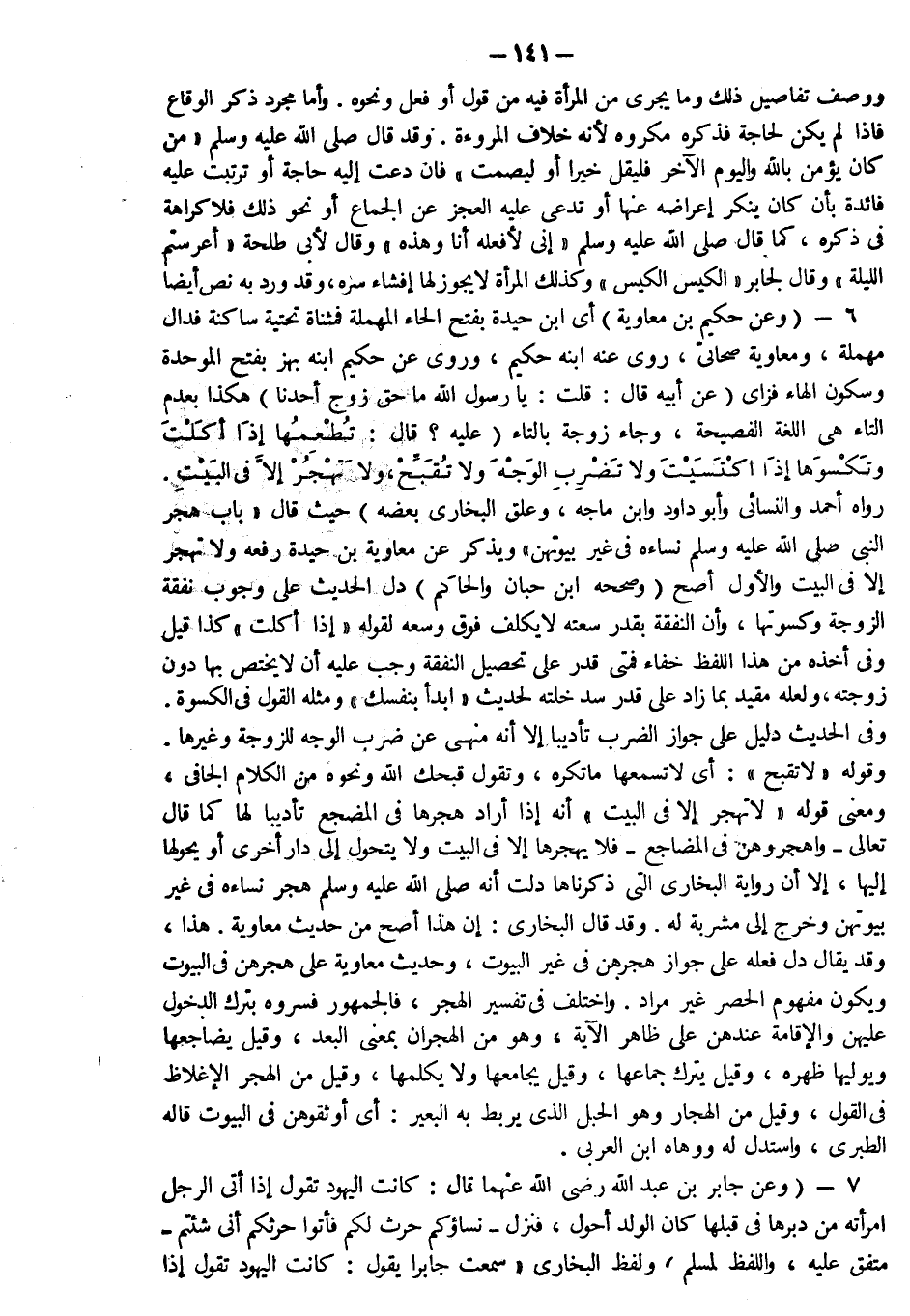 6- وعن حكيم بن معاوية أي ابن حيدة بفتح الحاء المهملة فمثناة تحتية ساكنة فدال مهملة ومعاوية صحابي روى عنه ابنه حكيم وروى عن حكيم ابنه بهز بفتح الموحدة وسكون الهاء فزاي عن أبيه رضي الله عنه قال قلت يا رسول الله ما حق زوج أحدنا هكذا بعدم التاء هي اللغة الفصيحة وجاء زوجة بالتاء عليه قال: "تطعمها إذا اكلت وتكسوها إذا اكتسيت ولا تضرب الوجه ولا تقبح ولا تهجر إلا في البيت" رواه أحمد وأبو داود والنسائي وابن ماجه وعلق البخاري بعضه حيث قال: باب هجر النبي صلى الله عليه وسلم نساءه في غير بيوتهن ويذكر عن معاوية بن حيدة رفعه ولا تهجر إلا في البيت والأول أصح وصححه ابن حبان والحاكم دل الحديث على وجوب نفقة الزوجة وكسوتها وأن النفقة بقدر سعته لا يكلف فوق وسعه لقوله "إذا اكلت" كذا قيل وفي أخذه من هذا اللفظ خفاء فمتى قدر على تحصيل النفقة وجب عليه أن لا يختص بها دون زوجته ولعله مقيد بما زاد على قدر سد خلته لحديث "ابدأ بنفسك" ومثله القول في الكسوة وفي الحديث دليل على جواز الضرب تأديبا إلا أنه منهي عن ضرب الوجه للزوجة وغيرها وقوله "لا تقبح" أي لا تسمعها ما تكره وتقول قبحك الله ونحوه من الكلام الجافي ومعنى قوله "لا تهجر إلا في البيت" أنه إذا أراد هجرها في المضجع تأديبا لها كما قال تعالى: {وَاهْجُرُوهُنَّ فِي الْمَضَاجِعِ} فلا يهجرها إلا في البيت ولا يتحول إلى دار أخرى أو يحولها إليها إلا أن رواية البخاري التي ذكرناها دلت أنه صلى الله عليه وسلم هجر نساءه في غير بيوتهن وخرج إلى مشربة له وقد قال البخاري إن هذا أصح من حديث معاوية هذا وقد يقال دل فعله على جواز هجرهن في غير البيوت وحديث معاوية على هجرهن في البيوت ويكون مفهوم الحصر غير مراد واختلف في تفسير الهجر فالجمهور فسروه بترك الدخول عليهن والإقامة عندهن على ظاهر الآية وهو من الهجران بمعنى البعد وقيل يضاجعها ويوليها ظهره وقيل يترك جماعها وقيل يجامعها ولا يكلمها وقيل من الهجر الإغلاظ في القول وقيل من الهجار وهو الحبل الذي يربط به البعير أي أوثقوهن في البيوت قاله الطبري واستدل له ووهاه ابن العربي