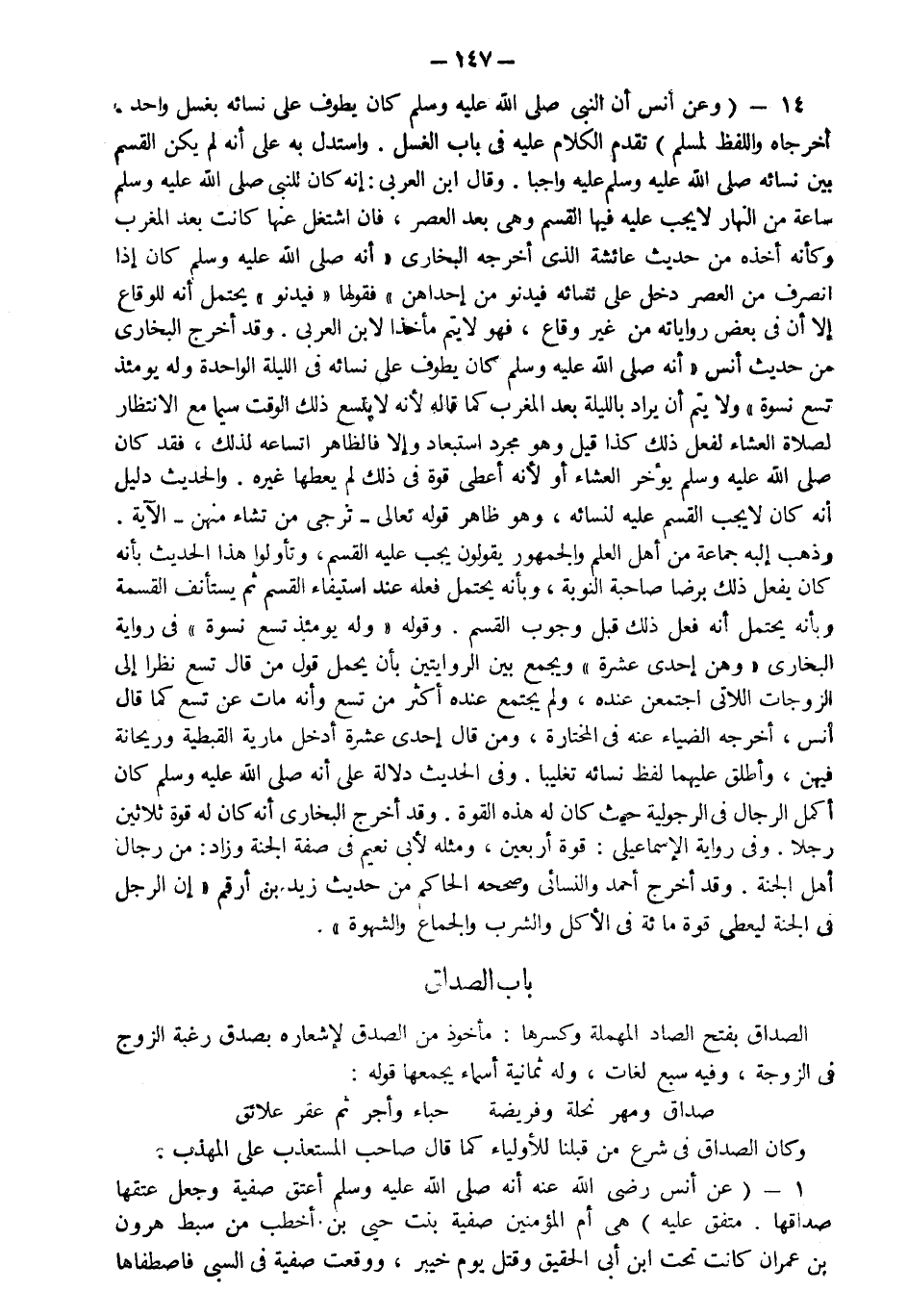 1- عن أنس رضي الله عنه عن النبي صلى الله عليه وسلم "أنه أعتق صفية وجعل عتقها صداقها" متفق عليه هي أم المؤمنين صفية بنت حيي بن أخطب من سبط هارون بن عمران كانت تحت ابن أبي الحقيق وقتل يوم خيبر ووقعت صفية في السبي فاصطفاها