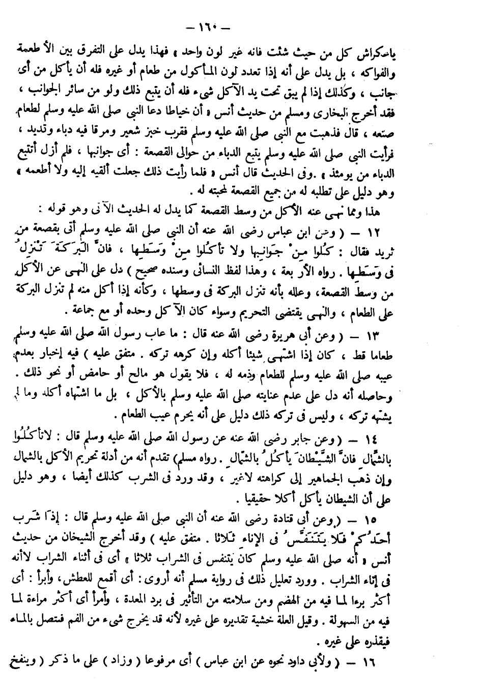 14- وعن جابر رضي الله عنه عن رسول الله صلى الله عليه وسلم قال: "لا تأكلوا بالشمال فإن الشيطان يأكل بالشمال" رواه مسلم تقدم أنه من أدلة تحريم الأكل بالشمال وإن ذهب الجماهير إلى كراهته لاغير وقد ورد في الشرب كذلك أيضا وهو دليل على أن الشيطان يأكل أكلا حقيقيا