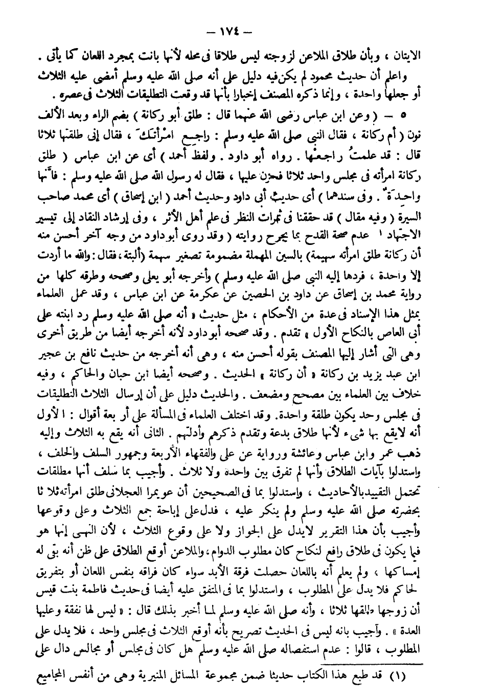 5- وعن ابن عباس رضي الله عنهما قال طلق أبو ركانة بضم الراء وبعد الألف نون أم ركانة فقال النبي صلى الله عليه وسلم: "راجع امرأتك" قال إني طلقتها ثلاثا قال: "قد علمت راجعها" رواه أبو داود ولفظ أحمد أي عن ابن عباس طلق أبو ركانة امرأته في مجلس واحد ثلاثا فحزن عليها فقال له رسول الله صلى الله عليه وسلم فإنها واحدة وفي سندهما أي حديث أبي داود وحديث أحمد ابن إسحاق أي محمد صاحب السيرة وفيه مقال وقد حققنا في ثمرات النظر في علم أهل الأثر وفي إرشاد النقاد إلى تيسير الاجتهاد عدم صحة القدح بما يجرح روايته وقد روى أبو داود من وجه آخر أحسن منه أن ركانة طلق امرأته سهيمة بالسين المهملة مضمومة تصغير سهمة البتة فقال والله ما أردت إلا واحدة فردها إليه النبي صلى الله عليه وسلم وأخرجه أبو يعلى وصححه وطرقه كلها من رواية محمد بن إسحاق عن داود بن الحصين عن عكرمة عن ابن عباس وقد عمل العلماء بمثل هذا الإسناد في عدة من الأحكام مثل حديث أنه صلى الله عليه وسلم رد ابنته على أبي العاص بالنكاح الأول تقدم وقد صححه أبو داود لأنه أخرجه أيضا من طريق أخرى وهي التي أشار إليها المصنف بقوله أحسن منه وهي أنه أخرجه من حديث نافع بن عجير بن عبد يزيد بن ركانة أن ركانة الحديث وصححه أيضا ابن حبان والحاكم وفيه خلاف بين العلماء بين مصحح ومضعف والحديث دليل على أن إرسال الثلاث التطليقات في مجلس واحد يكون طلقة واحدة وقد اختلف العلماء في المسألة على أربعة أقوال الأول أنه لا يقع بها شيء لأنها طلاق بدعة وتقدم ذكرهم وأدلتهم الثاني أنه يقع به الثلاث وإليه ذهب عمر وابن عباس وعائشة ورواية عن علي والفقهاء الأربعة وجمهور السلف والخلف واستدلوا بآيات الطلاق وأنها لم تفرق بين واحدة ولا ثلاث وأجيب بما سلف أنها مطلقات تحتمل التقييد بالأحاديث واستدلوا بما في الصحيحين أن عويمرا العجلاني طلق امرأته ثلاثا بحضرته صلى الله عليه وسلم ولم ينكر عليه فدل على إباحة جمع الثلاث وعلى وقوعها وأجيب بأن هذا التقرير لا يدل على الجواز ولا على وقوع الثلاث لأن النهي إنما هو فيما يكون في طلاق رافع لنكاح كان مطلوب الدوام والملاعن أوقع الطلاق على ظن أنه بقي له إمساكها ولم يعلم أنه باللعان حصلت فرقة الأبد سواء كان فراقه بنفس اللعان أو بتفريق الحاكم فلا يدل على المطلوب واستدلوا بما في المتفق عليه أيضا في حديث فاطمة بنت قيس أن زوجها طلقها ثلاثا وأنه صلى الله عليه وسلم لما أخبر بذلك قال: "ليس لها نفقة وعليها العدة" وأجيب بأنه ليس في الحديث تصريح بأنه أوقع الثلاث في مجلس واحد فلا يدل على المطلوب قالوا عدم استفصاله صلى الله عليه وسلم هل كان في مجلس أو مجالس دال على
