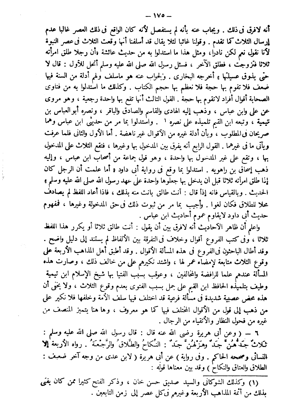 أنه لا فرق في ذلك ويجاب عنه بأنه لم يستفصل لأنه كان الواقع في ذلك العصر غالبا عدم إرسال الثلاث كما تقدم وقولنا غالبا لئلا يقال قد أسلفنا أنها وقعت الثلاث في عصر النبوة لأنا نقول نعم لكن نادرا ومثل هذا ما استدلوا به من حديث عائشة أن رجلا طلق امرأته ثلاثا فتزوجت فطلق الآخر فسئل رسول الله صلى الله عليه وعلى آله وسلم أتحل للأول قال: "لا حتى يذوق عسيلتها" أخرجه البخاري والجواب عنه هو ما سلف ولهم أدلة من السنة فيها ضعف فلا تقوم بها حجة فلا نعظم بها حجم الكتاب وكذلك ما استدلوا به من فتاوى الصحابة أقوال أفراد لا تقوم بها حجة القول الثالث إنها تقع بها واحدة رجعية وهو مروي عن علي وابن عباس وذهب إليه الهادي والقاسم والصادق والباقر ونصره أبو العباس ابن تيمة وتبعه ابن القيم تلميذه على نصره واستدلوا بما مر من حديثي ابن عباس وهما صريحان في المطلوب وبأن أدلة غيره من الأقوال غير ناهضة أما الأول والثاني فلما عرفت ويأتي ما في غيرهما القول الرابع أنه يفرق بين المدخول بها وغيرها فتقع الثلاث على المدخول بها وتقع على غير المدخول بها واحدة وهو قول جماعة من أصحاب ابن عباس وإليه ذهب إسحاق بن راهويه واستدلوا بما وقع في رواية أبي داود أما علمت أن الرجل كان إذا طلق امرأته ثلاثا قبل أن يدخل بها جعلوها واحدة على عهد رسول الله صلى الله عليه وسلم الحديث وبالقياس فإنه إذا قال أنت طالق بانت منه بذلك فإذا أعاد اللفظ لم يصادف محلا للطلاق فكان لغوا وأجيب بما مر من ثبوت ذلك في حق المدخولة وغيرها فمفهوم حديث أبي داود لا يقاوم عموم أحاديث ابن عباس واعلم أن ظاهر الأحاديث أنه لا فرق بين أن يقول أنت طالق ثلاثا أو يكرر هذا اللفظ ثلاثا وفي كتب الفروع أقوال وخلاف في التفرقة بين الألفاظ لم يستند إلى دليل واضح وقد أطال الباحثون في الفروع في هذه المسألة الأقوال وقد أطبق أهل المذاهب الأربعة على وقوع الثلاث متابعة لإمضاء عمر لها واشتد نكيرهم على من خالف ذلك وصارت هذه المسألة عندهم علما للرافضة والمخالفين وعوقب بسبب الفتيا بها شيخ الإسلام ابن تيمية وطيف بتلميذه الحافظ ابن القيم على جمل بسبب الفتوى بعدم وقوع الثلاث ولا يخفى أن هذه محض عصبية شديدة في مسألة فرعية قد اختلف فيها سلف الأمة وخلفها فلا نكير على من ذهب إلى قول من الأقوال المختلف فيها كما هو معروف وها هنا يتميز المنصف من غيره من فحول النظار والأتقياء من الرجال.