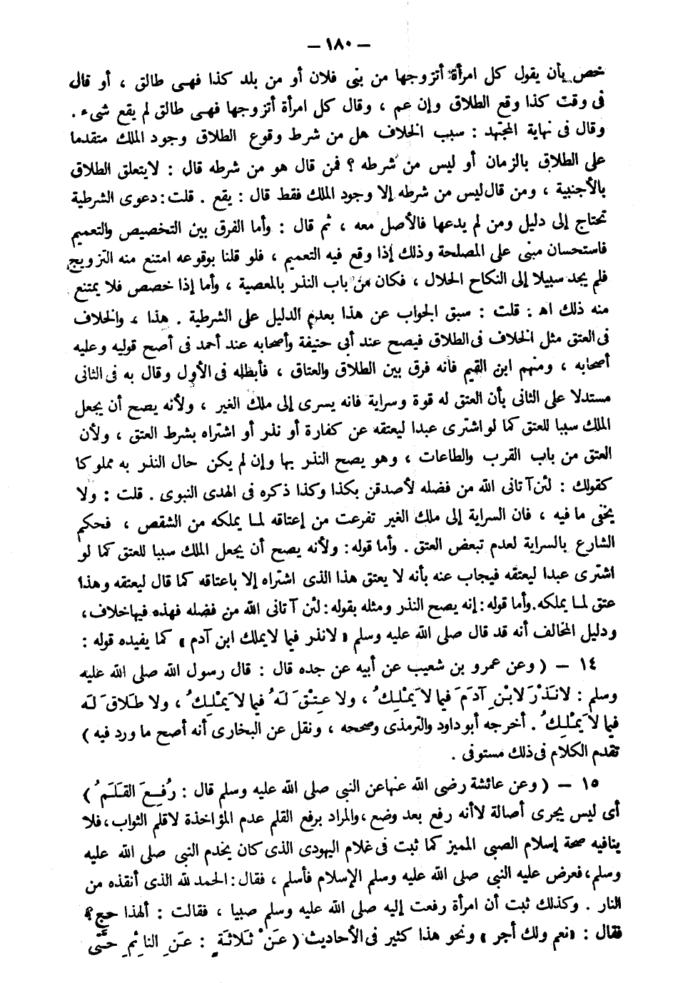 14- وعن عمرو بن شعيب عن أبيه عن جده قال قال رسول الله صلى الله عليه وسلم: "لا نذر لابن آدم فيما لا يملك ولا عتق له فيما لا يملك ولا طلاق له فيما لا يملك" أخرجه أبو داود والترمذي وصححه ونقل عن البخاري أنه أصح ما ورد فيه تقدم الكلام في ذلك مستوفى