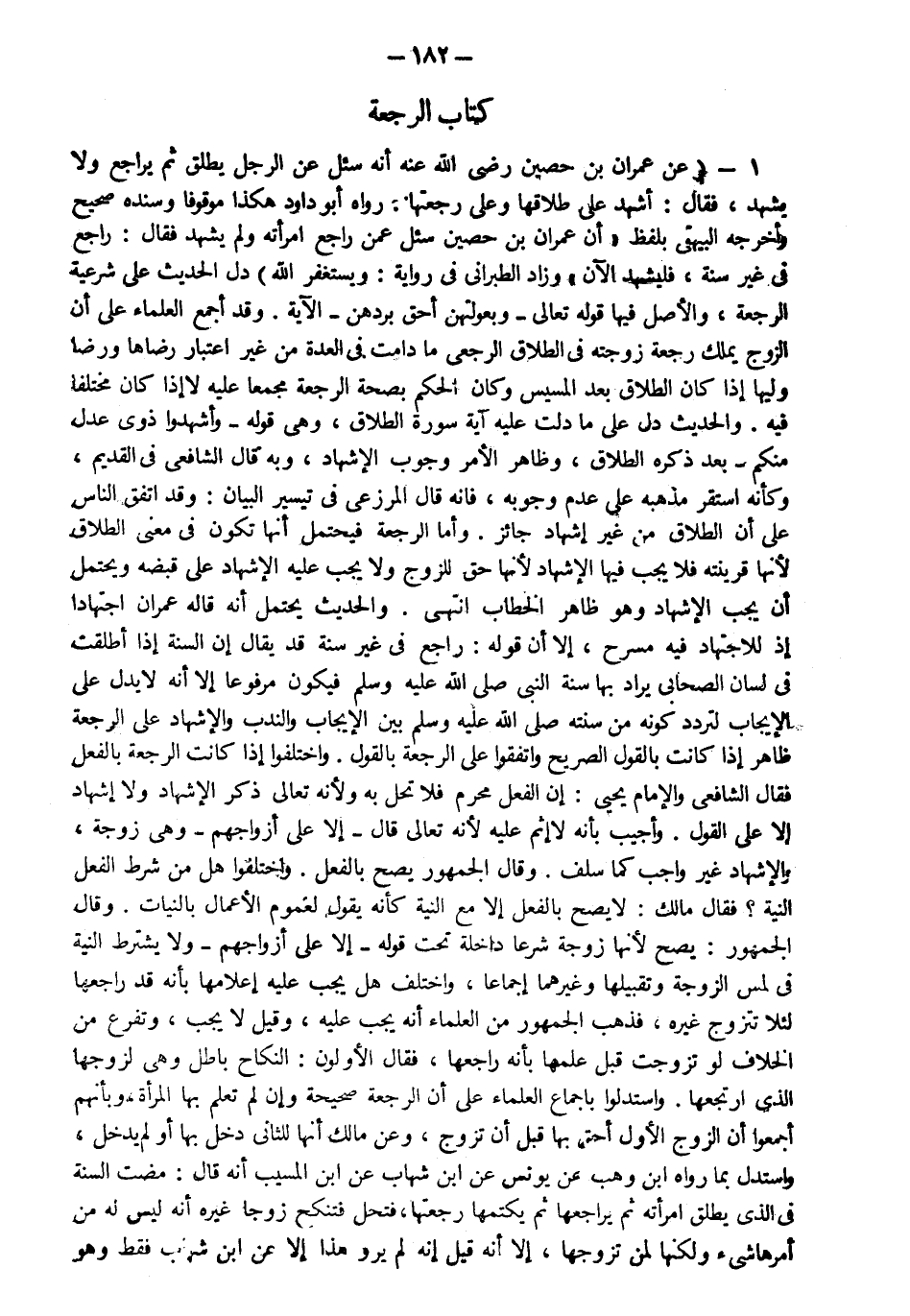 1- عن عمران بن حصين رضي الله عنه أنه سئل عن الرجل يطلق ثم يراجع ولا يشهد فقال أشهد على طلاقها وعلى رجعتها رواه أبو داود هكذا موقوفا وسنده صحيح وأخرجه البيهقي بلفظ أن عمران بن حصين سئل عمن راجع امرأته ولم يشهد فقال راجع في غير سنة فليشهد الآن وزاد الطبراني في رواية ويستغفر الله دل الحديث على شرعية الرجعة والأصل فيها قوله تعالى: {وَبُعُولَتُهُنَّ أَحَقُّ بِرَدِّهِنَّ} الآية وقد أجمع العلماء على أن الزوج يملك رجعة زوجته في الطلاق الرجعي ما دامت في العدة من غير اعتبار رضاها ورضا وليها إذا كان الطلاق بعد المسيس وكان الحكم بصحة الرجعة مجمعا عليه لا إذا كان مختلفا فيه والحديث دل على ما دلت عليه آية سورة الطلاق وهي قوله: {وَأَشْهِدُوا ذَوَيْ عَدْلٍ مِنْكُمْ} بعد ذكره الطلاق وظاهر الأمر وجوب الإشهاد وبه قال الشافعي في القديم وكأنه استقر مذهبه على عدم وجوبه فإنه قال المرزعي في تيسير البيان وقد اتفق الناس على أن الطلاق من غير إشهاد جائز وأما الرجعة فيحتمل أنها تكون في معنى الطلاق لأنها قرينته فلا يجب فيها الإشهاد لأنها حق للزوج ولا يجب عليه الإشهاد على قبضه ويحتمل أن يجب الإشهاد وهو ظاهر الخطاب انتهى والحديث يحتمل أنه قاله عمران اجتهادا إذ للاجتهاد فيه مسرح إلا أن قوله راجع في غير سنة قد يقال إن السنة إذا أطلقت في لسان الصحابي يراد بها سنة النبي صلى الله عليه وسلم فيكون مرفوعا إلا أنه لا يدل على الإيجاب لتردد كونه من سنته صلى الله عليه وسلم بين الإيجاب والندب والإشهاد على الرجعة ظاهر إذا كانت بالقول الصريح واتفقوا على الرجعة بالقول واختلف إذا كانت الرجعة بالفعل فقال الشافعي والإمام يحيى إن الفعل محرم فلا تحل به ولأنه تعالى ذكر الإشهاد ولا إشهاد إلا على القول وأجيب بأنه لا إ ثم عليه لأنه تعالى قال: {إِلَّا عَلَى أَزْوَاجِهِمْ} وهي زوجة والإشهاد غير واجب كما سلف وقال الجمهور يصح بالفعل واختلفوا هل من شرط الفعل النية فقال مالك لا يصح بالفعل إلا مع النية كأنه يقول لعموم الأعمال بالنيات وقال الجمهور يصح لأنها زوجة شرعا داخلة تحت قوله إلا على أزواجهم ولا يشترط النية في لمس الزوجة وتقبيلها وغيرهما إجماعا واختلف هل يجب عليه إعلامها بأنه قد راجعها لئلا تتزوج غيره فذهب الجمهور من العلماء أنه يجب عليه وقيل لا يجب وتفرع من الخلاف لو تزوجت قبل علمها بأنه راجعها فقال الأولون النكاح باطل وهي لزوجها الذي ارتجعها واستدلوا بإجماع العلماء على أن الرجعة صحيحة وإن لم تعلم بها المرأة وبأنهم أجمعوا أن الزوج الأول أحق بها قبل أن تزوج وعن مالك أنها للثاني دخل بها أو لم يدخل واستدل بما رواه ابن وهب عن يونس عن ابن شهاب عن ابن المسيب أنه قال مضت السنة في الذي يطلق امرأته ثم يراجعها ثم يكتمها رجعتها فتحل فتنكح زوجا غيره أنه ليس له من أمرها شيء ولكنها لمن تزوجها إلا أنه قيل إنه لم يرو هذا إلا عن ابن شهاب فقط وهو