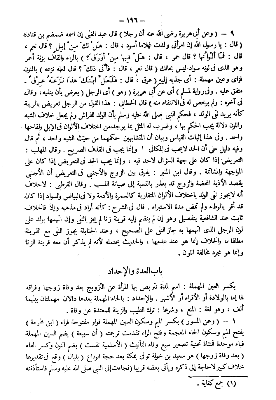 9- وعن أبي هريرة رضي الله عنه أن رجلا قال عبد الغني إن اسمه ضمضم بن قتادة قال يا رسول الله إن امرأتي ولدت غلاما أسود قال: "هل لك من إبل قال نعم قال فما ألوانها قال حمر قال هل فيها من أورق" بالراء والقاف بزنة أحمر وهو الذي في لونه سواد ليس بحالك "قال نعم قال فأنى ذلك قال لعله نزعه" بالنون فزاي وعين مهملة أي جذبه إليه "عرق قال فلعل ابنك هذا نزعه عرق" متفق عليه وفي رواية لمسلم أي عن أبي هريرة وهو أي الرجل يعرض بأن ينفيه وقال في آخره ولم يرخص له في الانتفاء منه قال الخطابي هذا القول من الرجل تعريض بالريبة كأنه يريد نفي الولد فحكم النبي صلى الله عليه وسلم بأن الولد للفراش ولم يجعل خلاف الشبه واللون دلالة يجب الحكم بها وضرب له المثل بما يوجد من اختلاف الألوان في الإبل ولقاحها واحد وفي هذا إثبات القياس وبيان أن المتشابهين حكمهما من حيث الشبه واحد ثم قال وفيه دليل على أن الحد لا يجب في المكاني وإنما يجب في القذف الصريح وقال المهلب التعريض إذا كان على جهة السؤال لا حد فيه وإنما يجب الحد في التعريض إذا كان على المواجهة والمشاتمة وقال ابن المنير يفرق بين الزوج والأجنبي في التعريض أن الأجنبي يقصد الأذية المحضة والزوج قد يعذر بالنسبة إلى صيانة النسب وقال القرطبي لا خلاف أنه لا يجوز نفي الولد باختلاف الألوان المتقاربة كالسمرة والأدمة ولا في البياض والسواد إذا كان قد أقر بالوطء ولم تمض مدة الاستبراء قال في الشرح كأنه أراد في مذهبه وإلا فالخلاف ثابت عند الشافعية بتفصيل وهو إن لم ينضم إليه قرينة زنا لم يجز النفي وإن اتهمها بولد على لون الرجل الذي اتهمها به جاز النفي على الصحيح وعند الحنابلة يجوز النفي مع القرينة مطلقا والخلاف إنما هو عند عدمها والحديث يحتمله لأنه لم يذكر أن معه قرينة الزنا وإنما هو مجرد مخالفة اللون