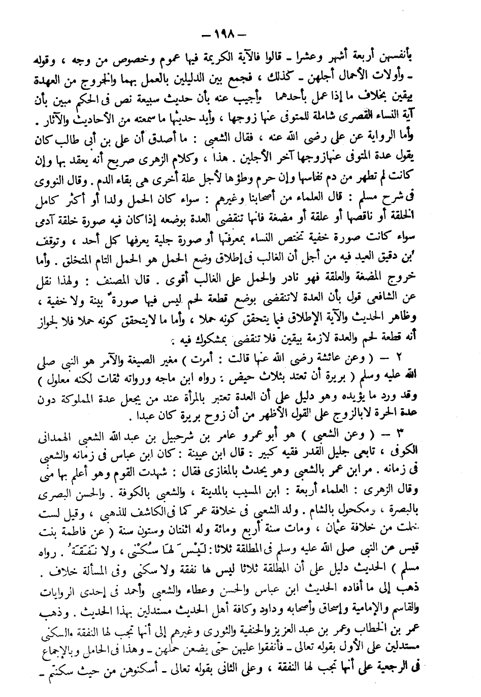 3- وعن الشعبي هو أبو عمرو عامر بن شراحيل بن عبد الله الشعبي الهمذاني الكوفي تابعي جليل القدر فقيه كبير قال ابن عيينة كان ابن عباس في زمانه والشعبي في زمانه مر ابن عمر بالشعبي وهو يحدث بالمغازي فقال شهدت القوم وهو أعلم بها مني وقال الزهري العلماء أربعة ابن المسيب بالمدينة والشعبي بالكوفة والحسن البصري بالبصرة ومكحول بالشام ولد الشعبي في خلافة عمر كما في الكاشف للذهبي وقيل لست خلت من خلافه عثمان ومات سنة أربع ومائة وله اثنتان وستون سنة عن فاطمة بنت قيس عن النبي صلى الله عليه وسلم في المطلقة ثلاثا "ليس لها سكنى ولا نفقة" رواه مسلم الحديث دليل على أن المطلقة ثلاثا ليس لها نفقة ولا سكنى وفي المسألة خلاف ذهب إلى ما أفاده الحديث ابن عباس و الحسن وعطاء والشعبي وأحمد في إحدى الروايات القاسم والإمامية و إسحاق وأصحابه و داود وكافة أهل الحديث مستدلين بهذا الحديث وذهب عمر بن الخطاب وعمر بن عبد العزيز والحنفية و الثوري وغيرهم إلى أنها تجب لها النفقة وسكنى مستدلين على الأول بقوله تعالى: {فَأَنْفِقُوا عَلَيْهِنَّ حَتَّى يَضَعْنَ حَمْلَهُنَّ} وهذا في الحامل وبالإجماع في الرجعية على أنها تجب لها النفقة وعلى الثاني بقوله تعالى: {أَسْكِنُوهُنَّ مِنْ حَيْثُ سَكَنْتُمْ}