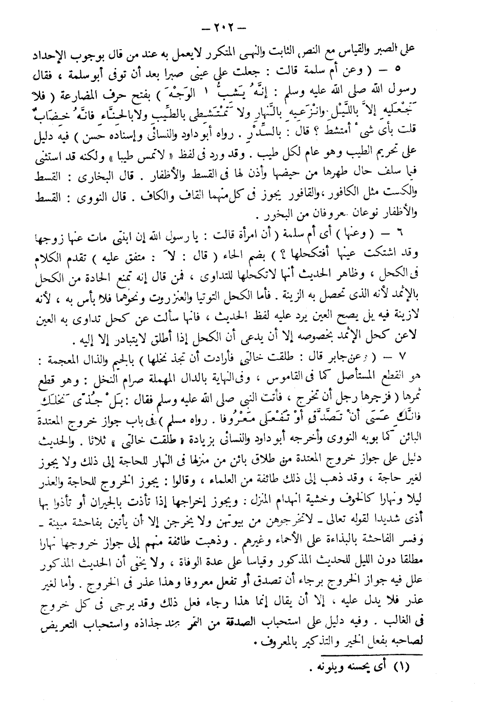 7- وعن جابر قال طلقت خالتي فأرادت أن تجذ نخلها بالجيم والذال المعجمة هو القطع المستأصل كما في القاموس وفي النهاية بالدال المهملة صرام النخل وهو قطع ثمرها فزجرها رجل أن تخرج فأتت النبي صلى الله عليه وسلم فقال "بلى جذي نخلك فإنك عسى أن تصدقي أو تفعلي معروفا" رواه مسلم في باب جواز خروج المعتدة البائن كما بوبه النووي وأخرجه أبو داود والنسائي بزيادة طلقت خالتي ثلاثا والحديث دليل على جواز خروج المعتدة من طلاق بائن من منزلها في النهار للحاجة إلى ذلك ولا يجوز لغير حاجة وقد ذهب إلى ذلك طائفة من العلماء وقالوا يجوز الخروج للحاجة والعذر ليلا ونهارا كالخوف وخشية انهدام المنزل ويجوز إخراجها إذا تأذت بالجيران أو تأذوا بها أذى شديدا لقوله تعالى: {لا تُخْرِجُوهُنَّ مِنْ بُيُوتِهِنَّ وَلا يَخْرُجْنَ إِلَّا أَنْ يَأْتِينَ بِفَاحِشَةٍ مُبَيِّنَةٍ} وفسر الفاحشة بالبذاءة على الأحماء وغيرهم وذهبت طائفة منهم إلى جواز خروجها نهارا مطلقا دون الليل للحديث المذكور وقياسا على عدة الوفاة ولا يخفى أن الحديث المذكور علل فيه جواز الخروج برجاء أن تصدق أو تفعل معروفا وهذا عذر في الخروج وأما لغير عذر فلا يدل عليه إلا أن يقال إنما هذا رجاء فعل ذلك وقد يرجى في كل خروج في الغالب وفيه دليل على استحباب الصدقة من التمر عند جذاذه واستحباب التعريض لصاحبه بفعل الخير والتذكير بالمعروف