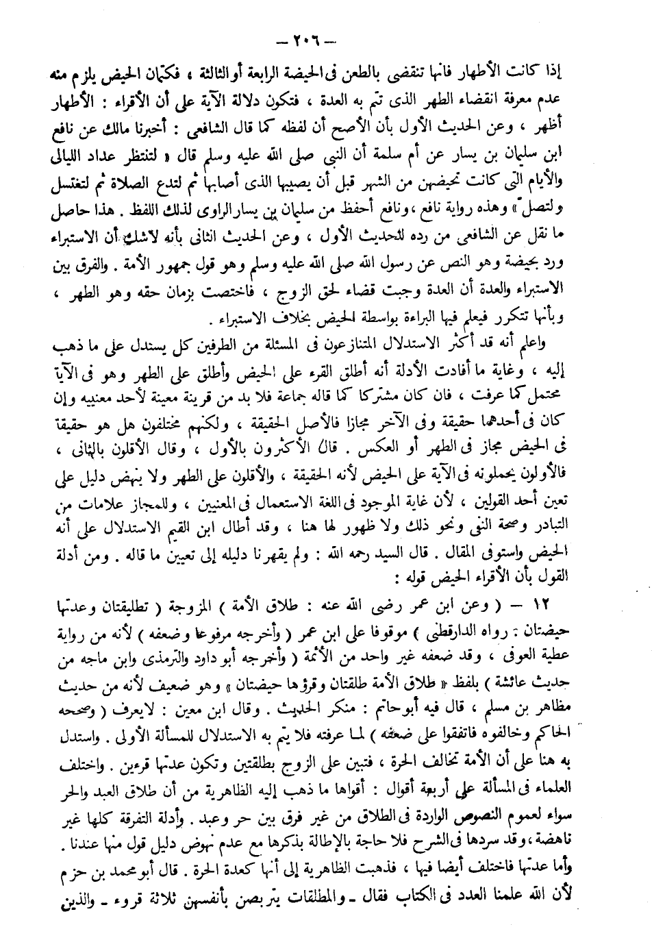 12- وعن ابن عمر رضي الله عنه طلاق الأمة المزوجة تطليقتان وعدتها حيضتان رواه الدارقطني موقوفا على ابن عمر وأخرجه مرفوعا وضعفه لأنه من رواية عطية العوفي وقد ضعفه غير واحد من الأئمة وأخرجه أبو داود والترمذي وابن ماجه من حديث عائشة بلفظ طلاق الأمة طلقتان وقرؤها حيضتان وهو ضعيف لأنه من حديث مظاهر بن مسلم قال فيه أبو حاتم منكر الحديث وقال ابن معين لا يعرف وصححه الحاكم وخالفوه فاتفقوا على ضعفه لما عرفته فلا يتم به الاستدلال للمسألة الأولى واستدل به هنا على أن الأمة تخالف الحرة فتبين على الزوج بطلقتين وتكون عدتها قرأين واختلف العلماء في المسألة على أربعة أقوال أقواها ما ذهب إليه الظاهرية من أن طلاق العبد والحر سواء لعموم النصوص الواردة في الطلاق من غير فرق بين حر وعبد وأدلة التفرقة كلها غير ناهضة وقد سردها في الشرح فلا حاجة بالإطالة بذكرها مع عدم نهوض دليل قول منها ثمنا وأما عدتها فاختلف أيضا فيها فذهبت الظاهرية إلى أنها كعدة الحرة قال أبو محمد بن حزم لأن الله علمنا العدد في الكتاب فقال: {وَالْمُطَلَّقَاتُ يَتَرَبَّصْنَ بِأَنْفُسِهِنَّ ثَلاثَةَ قُرُوءٍ} {وَالَّذِينَ