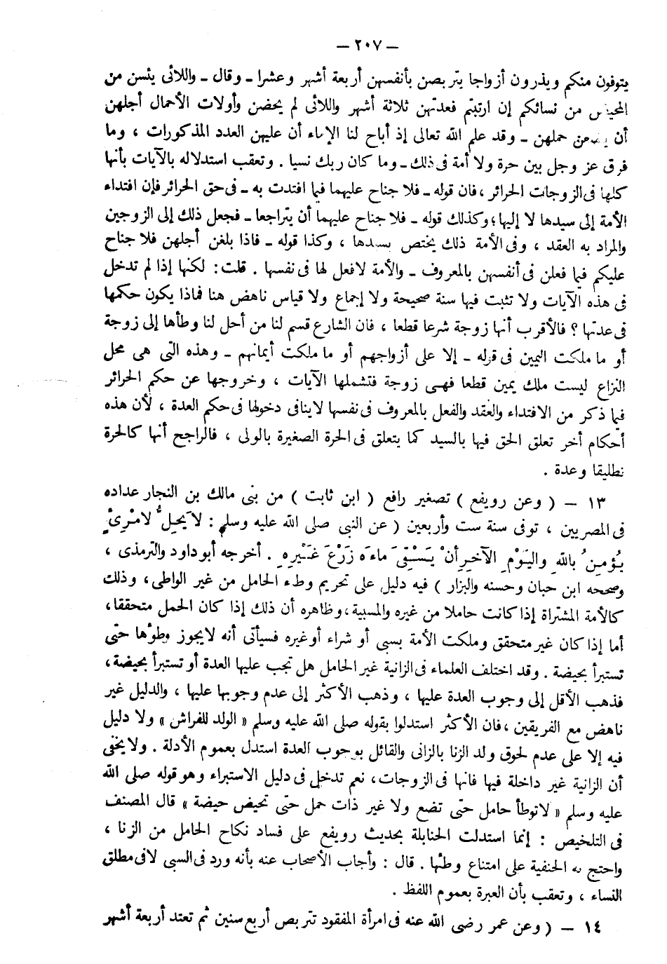 13- وعن رويفع تصغير رافع بن ثابت رضي الله عنه من بني مالك بن النجار عداده في المصريين توفي سنة ست وأربعين عن النبي صلى الله عليه وسلم "لا يحل لامرىء يؤمن بالله واليوم الآخر أن يسقي ماءه زرع غيره" أخرجه أبو داود والترمذي وصححه ابن حبان وحسنه البزار فيه دليل على تحريم وطء الحامل من غير الواطىء وذلك كالأمة المشتراة إذا كانت حاملا من غيره والمسبية وظاهره أن ذلك إذا كان الحمل متحققا أما إذا كان غير متحقق وملكت الأمة بسبي أو شراء أو غيره فسيأتي أنه لا يجوز وطؤها حتى تستبرأ بحيضة وقد اختلف العلماء في الزانية غير الحامل هل تجب عليها العدة أو تستبرأ بحيضة فذهب الأقل إلى وجوب العدة عليها وذهب الأكثر إلى عدم وجوبها والدليل غير ناهض مع الفريقين فإن الأكثر استدلوا بقوله صلى الله عليه وسلم "الولد للفراش" ولا دليل فيه إلا على عدم لحوق ولد الزنا بالزاني والقائل بوجوب العدة استدل بعموم الأدلة ولا يخفى أن الزانية غير داخلة فيها فإنها في الزوجات نعم تدخل في دليل الاستبراء وهو قوله صلى الله عليه وسلم: "لا توطأ حامل حتى تضع ولا غير ذات حمل حتى تحيض حيضة" قال المصنف في التلخيص إنما استدلت الحنابلة بحديث رويفع على فساد نكاح الحامل من الزنا واحتج به الحنفية على امتناع وطئها قال وأجاب الأصحاب عنه بأنه ورد في السبي لا في مطلق النساء وتعقب بأن العبرة بعموم اللفظ