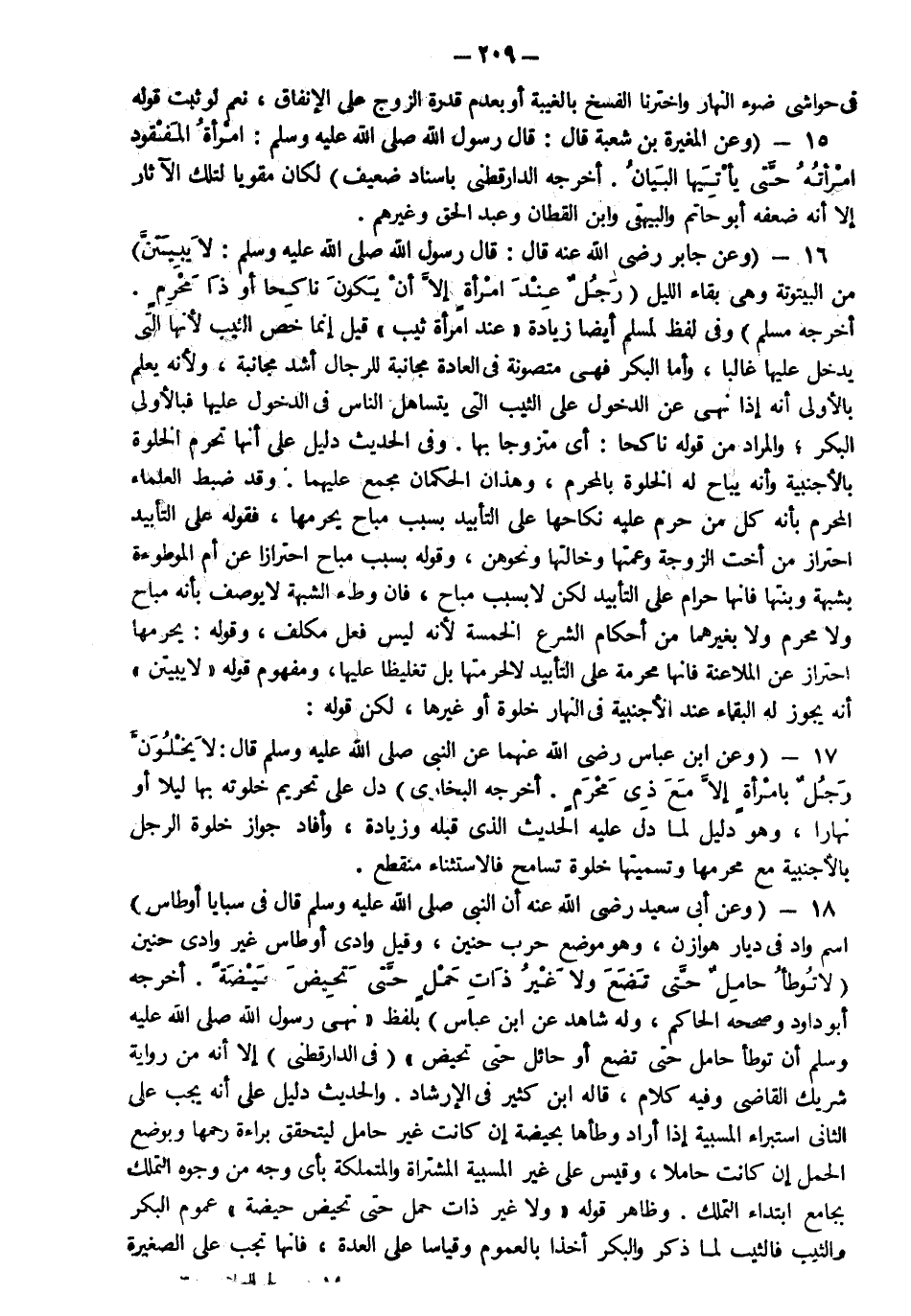 17- وعن ابن عباس رضي الله عنهما عن النبي صلى الله عليه وسلم قال "لا يخلون رجل بامرأة إلا مع ذي محرم" أخرجه البخاري دل على تحريم خلوته بها ليلا أو نهارا وهو دليل لما دل عليه الحديث الذي قبله وزيادة وأفاد جواز خلوة الرجل بالأجنبية مع محرمها وتسميتها خلوة تسامح فالاستثناء منقطع