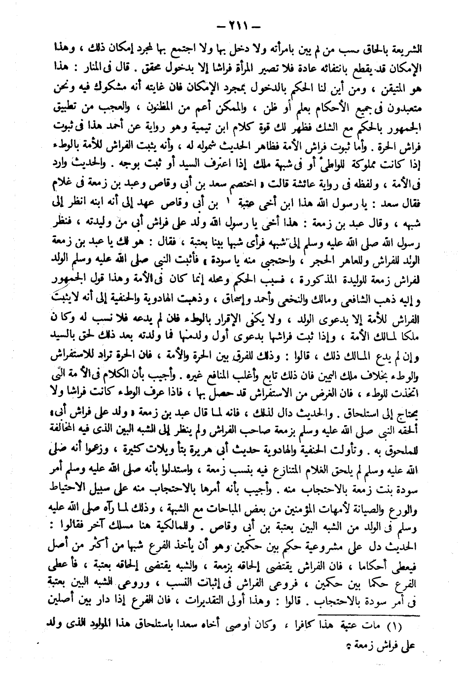 الشريعة بإلحاق نسب من لم يبن بامرأته ولا دخل بها ولا اجتمع بها لمجرد إمكان ذلك وهذا الإمكان قد يقطع بانتفائه عادة فلا تصير المرأة فراشا إلا بدخول محقق قال في المنار هذا هو المتيقن ومن أين لنا الحكم بالدخول بمجرد الامكان فإن غايته أنه مشكوك فيه ونحن متعبدون في جميع الأحكام بعلم أو ظن والممكن أعم من المظنون والعجب من تطبيق الجمهور بالحكم مع الشك فظهر لك قوة كلام ابن تيمية وهو رواية عن أحمد هذا في ثبوت فراش الحرة وأما ثبوت فراش الأمة فظاهر الحديث شموله له وأنه يثبت الفراش للأمة بالوطء إذا كانت مملوكة للوطىء أو في شبهة ملك إذا اعترف السيد أو ثبت بوجه والحديث وارد في الأمة ولفظه في رواية عائشة قالت اختصم سعد بن أبي وقاص وعبد بن زمعة في غلام فقال سعد يا رسول الله هذا ابن أخي عتبة بن أبي وقاص عهد إلي أنه ابنه انظر إلى شبهه وقال عبد بن زمعة هذا أخي يا رسول الله ولد على فراش أبي من وليدته فنظر رسول الله صلى الله عليه وسلم إلى شبهه فرأى شبها بينا بعتبة فقال: "هو لك يا عبد بن زمعة الولد للفراش وللعاهر الحجر واحتجبي منه يا سودة" فأثبت النبي صلى الله عليه وسلم الولد لفراش زمعة للوليدة المذكورة فسبب الحكم ومحله إنما كان في الأمة وهذا قول الجمهور وإليه ذهب الشافعي ومالك والنخعي وأحمد وإسحاق وذهبت الهادوية والحنفية إلى أنه لا يثبت الفراش للأمة إلا بدعوى الولد ولا يكفي الإقرار بالوطء فإن لم يدعه فلا نسب له وكان ملكا لمالك الأمة وإذا ثبت فراشها بدعوى أول ولد منها فما ولدته بعد ذلك لحق بالسيد وإن لم يدع المالك ذلك قالوا وذلك للفرق بين الحرة والأمة فإن الحرة تراد للاستفراش والوطء بخلاف ملك اليمين فإن ذلك تابع وأغلب المنافع غيره وأجيب بأن الكلام في الأمة التي اتخذت للوطء فإن الغرض من الاستفراش قد حصل بها فإذا عرف الوطء كانت فراشا ولا يحتاج إلى استلحاق والحديث دال لذلك فإنه لما قال عبد بن زمعة ولد على فراش أبي ألحقه النبي صلى الله عليه وسلم بزمعة صاحب الفراش ولم ينظر إلى الشبه البين الذي فيه المخالفة للملحوق به وتأولت الحنفية والهادوية حديث أبي هريرة بتأويلات كثيرة وزعموا أنه صلى الله عليه وسلم لم يلحق الغلام المتنازع فيه بنسب زمعة واستدلوا بأنه صلى الله عليه وسلم أمر سودة بنت زمعة بالاحتجاب منه وأجيب بأنه أمرها بالاحتجاب منه على سبيل الاحتياط والورع والصيانة لأمهات المؤمنين من بعض المباحات مع الشبهة وذلك لما رآه صلى الله عليه وسلم في الولد من الشبه بعتبة بن أبي وقاص وللمالكية هنا مسلك آخر فقالوا الحديث دل على مشروعية حكم بين حكمين وهو أن يأخذ الفرع شبها من أكثر من أصل فيعطي أحكاما فإن الفراش يقتضي إلحاقه بزمعة والشبه يقتضي إلحاقه بعتبة فأعطى الفرع حكما بين حكمين فروعي الفراش في إثبات النسب وروعي الشبه البين بعتبة في أمر سودة بالاحتجاب قالوا وهذا أولى التقديرات فإن الفرع إذا دار بين أصلين