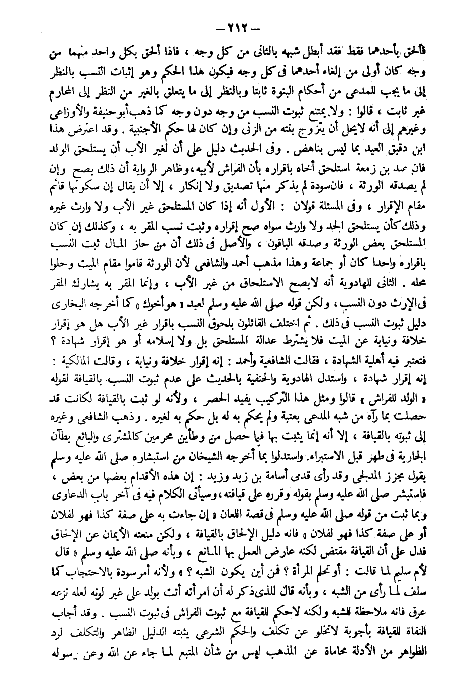 فألحق بأحدهما فقط فقد أبطل شبهه بالثاني من كل وجه فإذا ألحق بكل واحد منهما من وجه كان أولى من إلغاء أحدهما من كل وجه فيكون هذا الحكم وهو إثبات النسب بالنظر إلى ما يجب للمدعي من أحكام البنوة ثابتا وبالنظر إلى ما يتعلق بالغير من النظر إلى المحارم غير ثابت قالوا ولا يمتنع ثبوت النسب من وجه دون وجه كما ذهب أبو حنيفة والأوزاعي وغيرهم إلى أنه لا يحل أن يتزوج بنته من الزنا وإن كان لها حكم الأجنبية وقد اعترض هذا ابن دقيق العيد بما ليس بناهض وفي الحديث دليل على أن لغير الأب أن يستلحق الولد فإن عبد بن زمعة استلحق أخاه بإقراره بأن الفراش لأبيه وظاهر الرواية أن ذلك يصح وإن لم يصدقه الورثة فإن سودة لم يذكر منها تصديق ولا إنكار إلا أن يقال إن سكوتها قائم مقام الإقرار وفي المسألة قولان الأول أنه إذا كان المستلحق غير الأب ولا وارث غيره وذلك كأن يستلحق الجد ولا وارث سواه صح إقراره وثبت نسب المقر به وكذلك إن كان المستلحق بعض الورثة وصدقه الباقون والأصل في ذلك أن من حاز المال ثبت النسب بإقراره واحدا كان أو جماعة وهذا مذهب أحمد والشافعي لأن الورثة قاموا مقام الميت وحلوا محله الثاني للهادوية أنه لا يصح الاستلحاق من غير الأب وإنما المقر به يشارك المقر في الإرث دون النسب ولكن قوله صلى الله عليه وسلم لعبد "هو أخوك" كما أخرجه البخاري دليل ثبوت النسب في ذلك ثم اختلف القائلون بلحوق النسب بإقرار غير الأب هل هو إقرار خلافة ونيابة عن الميت فلا يشترط عدالة المستلحق بل ولا إسلامه أو هو إقرار شهادة فتعتبر فيه أهلية الشهادة فقالت الشافعية و أحمد إنه إقرار خلافة ونيابة وقال المالكية إنه إقرار شهادة واستدل الهادوية والحنفية بالحديث على عدم ثبوت النسب بالقيافة لقوله الولد للفراش قالوا ومثل هذا التركيب يفيد الحصر ولأنه لو ثبت بالقيافة لكانت قد حصلت بما رآه من شبه المدعى بعتبة ولم يحكم به له بل حكم به لغيره وذهب الشافعي وغيره إلى ثبوته بالقيافة إلا أنه إنما يثبت بها فيما حصل من وطأين محرمين كالمشتري والبائع يطآن الجارية في طهر قبل استبراء واستدلوا بما أخرجه الشيخان من استبشاره صلى الله عليه وسلم بقول مجزز المدلجي وقد رأى قدمي أسامة بن زيد وزيد "إن هذه الأقدام بعضها من بعض" فاستبشر صلى الله عليه وسلم بقوله وقرره على قيافته وسيأتي الكلام فيه في آخر باب الدعاوى وبما ثبت من قوله صلى الله عليه وسلم في قصة اللعان "إن جاءت به على صفة كذا فهو لفلان أو على صفة كذا فهو لفلان" فإنه دليل الإلحاق بالقيافة ولكن منعته الأيمان عن الإلحاق فدل على أن القيافة مقتض لكنه عارض العمل بها المانع وبأنه صلى الله عليه وسلم قال لأم سليم لما قالت أو تحتلم المرأة فمن أين يكون الشبه ولأنه أمر سودة بالاحتجاب كما سلف لما رأى من الشبه وبأنه قال للذي ذكر له أن امرأته أتت بولد على غير لونه لعله نزعه عرق فإنه ملاحظة للشبه ولكنه لا حكم للقيافة مع ثبوت الفراش في ثبوت النسب وقد أجاب النفات للقيافة بأجوبة لا تخلو عن تكلف والحكم الشرعي يثبته الدليل الظاهر والتكلف لرد الظواهر من الأدلة محاماة عن المذهب ليس من شأن المتبع لما جاء عن الله وعن رسوله