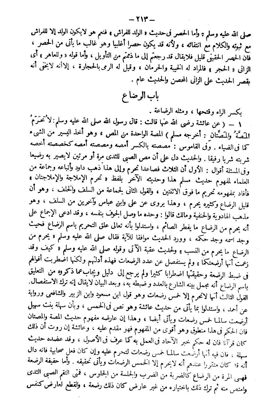 1- عن عائشة رضي الله عنها قالت قال رسول الله صلى الله عليه وسلم: "لا تحرم المصة والمصتان" أخرجه مسلم المصة الواحدة من المص وهو أخذ اليسير من الشيء كما في الضياء وفي القاموس مصصته بالكسر أمصه ومصصته أمصه كخصصته أخصه شربته شربا رفيقا والحديث دل على أن مص الصبي للثدي مرة أو مرتين لا يصير به رضيعا وفي المسألة أقوال الأول: أن الثلاث فصاعدا تحرم وإلى هذا ذهب داود وأتباعه وجماعة من العلماء لمفهوم حديث مسلم هذا وحديث الآخر بلفظ "لا تحرم الإملاجة والإملاجتان" فأفاد بمفهومه تحريم ما فوق الاثنتين القول الثاني: لجماعة من السلف والخلف وهو أن قليل الرضاع وكثيره يحرم وهذا يروى عن علي وابن عباس وآخرين من السلف وهو مذهب الهادوية والحنفية و مالك قالوا وحده ما وصل الجوف بنفسه وقد ادعى الإجماع على أنه يحرم من الرضاع ما يفطر الصائم واستدلوا بأنه تعالى علق التحريم باسم الرضاع فحيث وجد اسمه وجد حكمه وورد الحديث موافقا للآية فقال صلى الله عليه وسلم: "يحرم من الرضاع ما يحرم من النسب" ولحديث عقبة الآتي وقوله صلى الله عليه وسلم: "كيف وقد زعمت أنها أرضعتكما" ولم يستفصل عن عدد الرضعات فهذه أدلتهم ولكنها اضطربت أقوالهم في ضبط الرضعة وحقيقتها اضطرابا كثيرا ولم يرجع إلى دليل ويجاب عما ذكروه من التعليق باسم الرضاع أنه مجمل بينه الشارع بالعدد وضبطه به وبعد البيان لا يقال إنه ترك الاستفصال القول الثالث: أنها لا تحرم إلا خمس رضعات وهو قول ابن مسعود وابن الزبير والشافعي ورواية عن أحمد واستدلوا بما يأتي من حديث عائشة وهو نص في الخمس وبأن سهلة بنت سهيل أرضعت سالما خمس رضعات ويأتي أيضا وهذا إن عارضه مفهوم حديث المصة والمصتان فإن الحكم في هذا منطوق وهو أقوى من المفهوم فهو مقدم عليه وعائشة وإن روت أن ذلك كان قرآنا فإن له حكم خبر الآحاد في العمل به كما عرف في الأصول وقد عضده حديث سهل فإن فيه أنها أرضعت سالما خمس رضعات لتحرم عليه وإن كان فعل صحابية فإنه دال أنه قد كان متقررا عندهم أنه لا يحرم إلا الخمس الرضعات ويأتي تحقيقه وأما حقيقة الرضعة فهي المرة من الرضاع كالضربة من الضرب والجلسة من الجلوس فمتى التقم الصبي الثدي وامتص منه ثم ترك ذلك باختياره من غير عارض كان ذلك رضعة والقطع لعارض كنفس