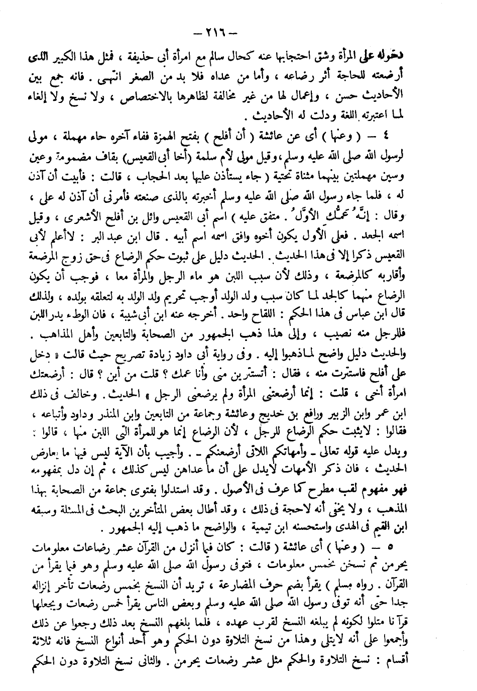 4- وعنها أي عن عائشة رضي الله عنها أن أفلح بفتح الهمزة ففاء آخره حاء مهملة مولى لرسول الله صلى الله عليه وسلم وقيل مولى لأم سلمة أخا أبي القعيس بقاف مضمومة وعين وسين مهملتين بينهما مثناة تحتية جاء يستأذن عليها بعد الحجاب قالت فأبيت أن آذن له فلما جاء رسول الله صلى الله عليه وسلم أخبرته بالذي صنعت فأمرني أن آذن له علي وقال إنه عمك متفق عليه اسم أبي القعيس وائل بن أفلح الأشعري وقيل اسمه الجعد فعلى الأول يكون أخوه وافق اسمه اسم أبيه قال ابن عبد البر لا أعلم لأبي القعيس ذكرا إلا في هذا الحديث والحديث دليل على ثبوت حكم الرضاع في حق زوج المرضعة وأقاربه كالمرضعة وذلك لأن سبب اللبن هو ماء الرجل والمرأة معا فوجب أن يكون الرضاع منهما كالجد لما كان سبب ولد الولد أوجب تحريم ولد الولد به لتعلقه بولده لذلك قال ابن عباس في هذا الحكم اللقاح واحد أخرجه عنه ابن أبي شيبة فإن الوطء يدر اللبن فللرجل منه نصيب وإلى هذا ذهب الجمهور من الصحابة والتابعين وأهل المذاهب والحديث دليل واضح لمن ذهبوا إليه وفي رواية أبي داود زيادة تصريح حيث قالت دخل علي أفلح فاستترت منه فقال أتستترين مني وأنا عمك قلت من أين قال أرضعتك امرأة أخي قلت إنما أرضعتني المرأة ولم يرضعني الرجل الحديث وخالف في ذلك ابن عمر وابن الزبير ورافع بن خديج وعائشة وجماعة من التابعين و ابن المنذر وداود وأتباعه فقالوا لا يثبت حكم الرضاع للرجل لأن الرضاع إنما هو للمرأة التي اللبن منها قالوا ويدل عليه قوله تعالى :{وَأُمَّهَاتُكُمُ اللَّاتِي أَرْضَعْنَكُمْ} وأجيب بأن الآية ليس فيها ما يعارض الحديث فإذ ذكر الأمهات لا يدل على أن ما عداهن ليس كذلك ثم إن دل بمفهومه فهو مفهوم لقب مطرح كما عرف في الأصول وقد استدلوا بفتوى جماعة من الصحابة بهذا المذهب ولا يخفى أنه لا حجة في ذلك وقد أطال بعض المتأخرين البحث في المسألة وسبقه ابن القيم في الهدي واستحسنه ابن تيمية والواضح ما ذهب إليه الجمهور