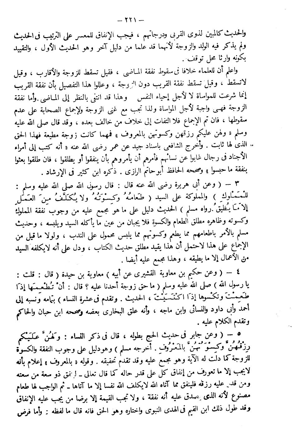2- وعن طارق المحاربي هو طارق بن عبد الله المحاربي بضم المميم وحاء مهملة روى عنه جامع بن شداد وربعي بكسر الراء وسكون الموحدة وكسر العين المهملة وتشديد المثناة التحتية ابن حراش بكسر الحاء المهملة وتخفيف الراء والشين المعجمة قال قدمنا المدينة فإذا رسول الله صلى الله عليه وسلم قائم على المنبر يخطب الناس ويقول: "يد المعطي العليا وابدأ بمن تعول أمك وأباك وأختك وأخاك ثم أدناك فأدناك" رواه النسائي وصححه ابن حبان والدارقطني الحديث كالتفسير لحديث اليد العليا خير من اليد السفلى وفسر في النهاية بالمعطية أو المنفقة واليد السفلى بالمانعة أو السائلة وقوله ابدأ بمن تعول دليل على وجوب الإنفاق على القريب وقد فصله بذكر الأم قبل الأب إلى آخر ما ذكره فدل هذا الترتيب على أن الأم أحق من الأب بالبر قال القاضي عياض وهو مذهب الجمهور ويدل له ما أخرجه البخاري من حديث أبي هريرة فذكر الأم ثلاث مرات ثم ذكر الأب معطوفا بثم فمن لا يجد إلا كفاية لأحد أبويه خص بها الأم للأحاديث هذه وقد نبه القرآن على زيادة حق الأم في قوله: {وَوَصَّيْنَا الإِنْسَانَ بِوَالِدَيْهِ إِحْسَاناً حَمَلَتْهُ أُمُّهُ كُرْهاً وَوَضَعَتْهُ كُرْهاً} وفي قوله وأختك وأخاك ثم أدناك إلى آخره دليل على وجوب الإنفاق للقريب المعسر فإنه تفصيل لقوله وابدأ بمن تعول فجعل الأخ من عياله وإلى هذا ذهب عمر وابن أبي ليلى وأحمد والهادي ولكنه اشترط في البحر أن يكون القريب وارثا مستدلا بقوله تعالى: {وَعَلَى الْوَارِثِ مِثْلُ ذَلِكَ} واللام للجنس وعند الشافعي أن النفقة تجب لفقير غير مكتسب زمنا أو صغيرا أو مجنونا لعجزه عن كفاية نفسه قالوا فإن لم يكن فيه إحدى هذه الصفات الثلاث فأقوال أحسنها تجب لأنه يقبح أن يكلف التكسب مع اتساع مال قريبه والثاني المنع للقدرة على الكسب فإنه نازل منزلة المال الثالث أنه يجب نفقة الأصل على الفرع دون العكس لأنه ليس من المصاحبة بالمعروف أن يكلف أصله التكسب مع علو السن وعند الحنفية يلزم التكسب لقريب محرم فقير عاجز عن الكسب بقدر الإرث هكذا في كتب الفريقين وفي البحر نقل عنهم ما يخالف هذا وهذه أقوال لم يسفر فيها وجه الاستدلال وفي قوله تعالى: {وَآتِ ذَا الْقُرْبَى حَقَّهُ} ما يشعر بأن للقريب حقا على قريبه والحقوق متفاوته فمع حاجته للنفقة تجب ومع عدمها فحقه الإحسان بغيرها من البر والإكرام