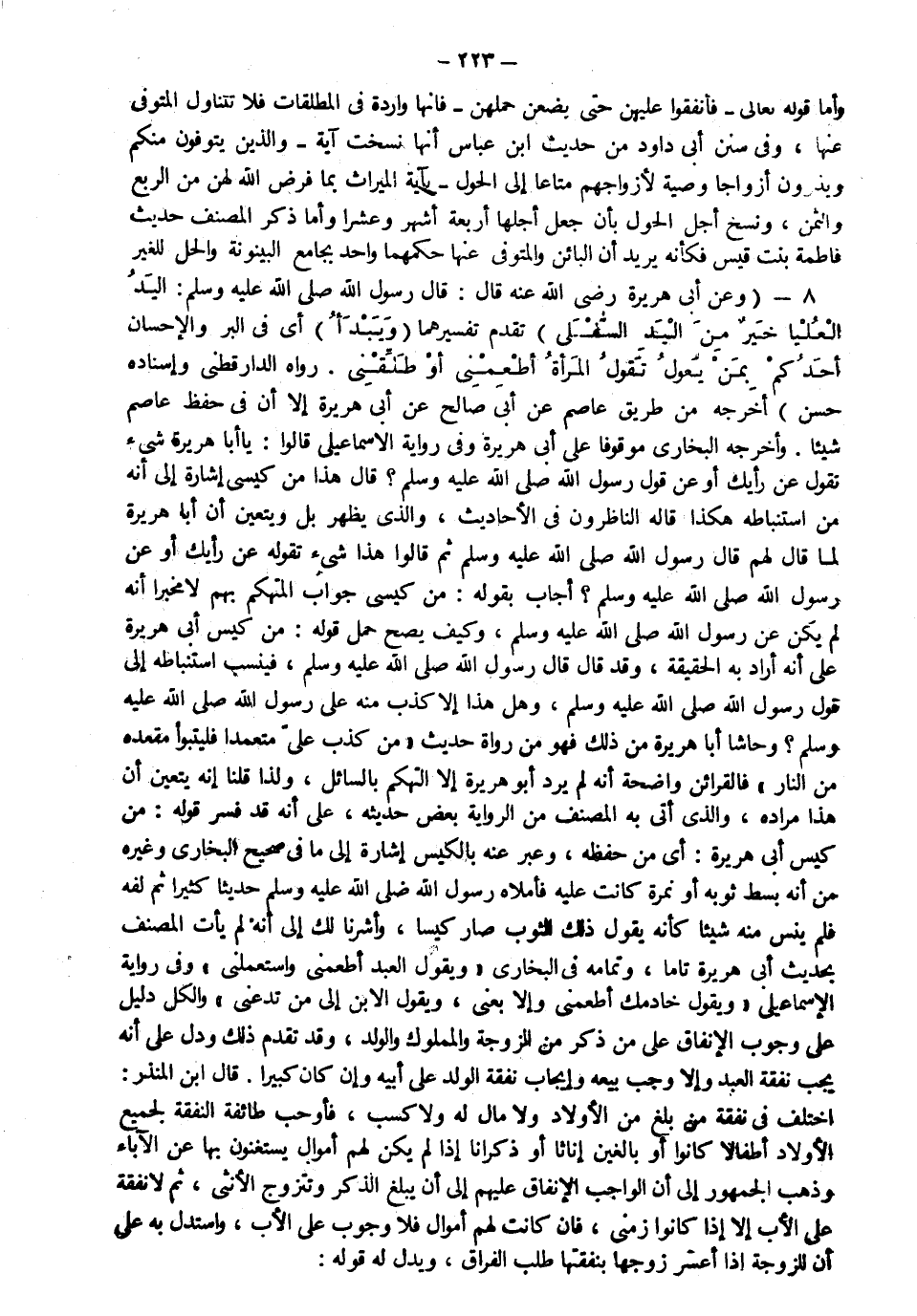 8- وعن أبي هريرة رضي الله عنه قال قال رسول الله صلى الله عليه وسلم: " اليد العليا خير من اليد السفلى" تقدم تفسيرهما "ويبدأ" أي في البر والإحسان أحدكم "بمن يعول تقول المرأة أطعمني أو طلقني" رواه الدارقطني وإسناده حسن أخرجه من طريق عاصم عن أبي صالح عن أبي هريرة إلا أن في حفظ عاصم شيئا وأخرجه البخاري موقوفا على أبي هريرة وفي رواية الإسماعيلي قالوا يا أبا هريرة شيء تقوله عن رأيك أو عن قول رسول الله صلى الله عليه وسلم قال هذا من كيسي إشارة إلى أنه من استنباطه هكذا قاله الناظرون في الأحاديث والذي يظهر بل ويتعين أن أبا هريرة لما قال لهم قال رسول الله صلى الله عليه وسلم ثم قالوا هذا شيء تقوله عن رأيك أو عن رسول الله صلى الله عليه وسلم أجاب بقوله من كيسي جواب المتهكم بهم لا مخبرا أنه لم يكن عن رسول الله صلى الله عليه وسلم وكيف يصح حمل قوله من كيس أبي هريرة على أنه أراد به الحقيقة وقد قال قال رسول الله صلى الله عليه وسلم فينسب استنباطه إلى قول رسول الله صلى الله عليه وسلم وهل هذا إلا كذب منه على رسول الله صلى الله عليه وسلم وحاشا أبا هريرة من ذلك فهو من رواة حديث "من كذب علي متعمدا فليتبوأ مقعده من النار" فالقرائن واضحة أنه لم يرد أبو هريرة إلا التهكم بالسائل ولذا قلنا إنه يتعين أن هذا مراده والذي أتى به المصنف من الرواية بعض حديثه على أنه فسر قوله من كيس أبي هريرة أي من حفظه وعبر عنه بالكيس إشارة إلى ما في صحيح البخاري وغيره من أنه بسط ثوبه أو نمرة كانت عليه فأملاه رسول الله صلى الله عليه وسلم حديثا كثيرا ثم لفه فلم ينس منه شيئا كأنه يقول ذلك الثوب صار كيسا وأشرنا لك إلى أنه لم يأت المصنف بحديث أبي هريرة تاما وتمامه في البخاري ويقول العبد أطعمني واستعملني وفي رواية الإسماعيلي ويقول خادمك أطعمني وإلا بعني ويقول الابن إلى من تدعني والكل دليل على وجوب الإنفاق على من ذكر من الزوجة والمملوك والولد وقد تقدم ذلك ودل على أنه يجب نفقة العبد وإلا وجب بيعه وإيجاب نفقة الولد على أبيه وإن كان كبيرا قال ابن المنذر اختلف في نفقة من بلغ من الأولاد ولا مال له ولا كسب فأوجب طائفة النفقة لجميع الأولاد أطفالا كانوا أو بالغين إناثا أو ذكرانا إذا لم يكن لهم أموال يستغنون بها عن الآباء وذهب الجمهور إلى أن الواجب الإنفاق عليه إلى أن يبلغ الذكر وتتزوج الأنثى ثم لا نفقة على الأب إلا إذا كانوا زمنى فإن كانت لهم أموال فلا وجوب على الأب واستدل به على أن للزوجة إذا أعسر زوجها بنفقتها طلب الفراق ويدل له قوله