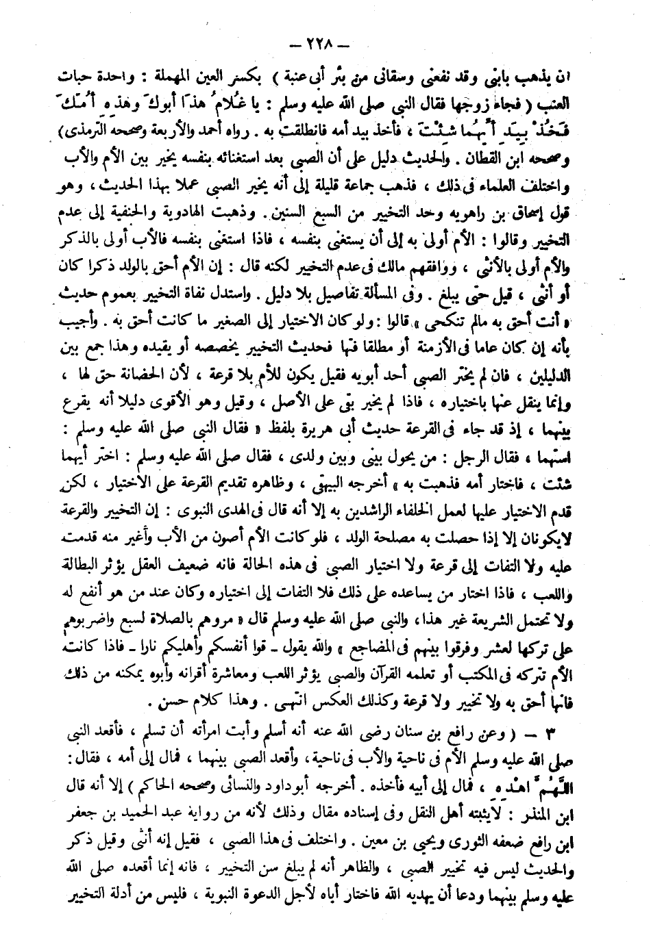 3- وعن رافع بن سنان رضي الله عنه أنه أسلم و أبت امرأته أن تسلم فأقعد النبي صلى الله عليه وسلم الأم في ناحية والأب في ناحية وأقعد الصبي بينهما فمال إلى أمه فقال اللهم اهده فمال إلى أبيه فأخذه أخرجه أبو داود والنسائي وصححه الحاكم إلا أنه قال ابن المنذر لا يثبته أهل النقل وفي إسناده مقال وذلك لأنه من رواية عبد الحميد بن جعفر بن رافع ضعفه الثوري ويحيى بن معين واختلف في هذا الصبي فقيل إنه أنثى وقيل ذكر والحديث ليس فيه تخيير الصبي والظاهر أنه لم يبلغ سن التخيير فإنه إنما أقعده صلى الله عليه وسلم بينهما ودعا أن يهديه الله فاختار أباه لأجل الدعوة النبوية فليس من أدلة التخيير