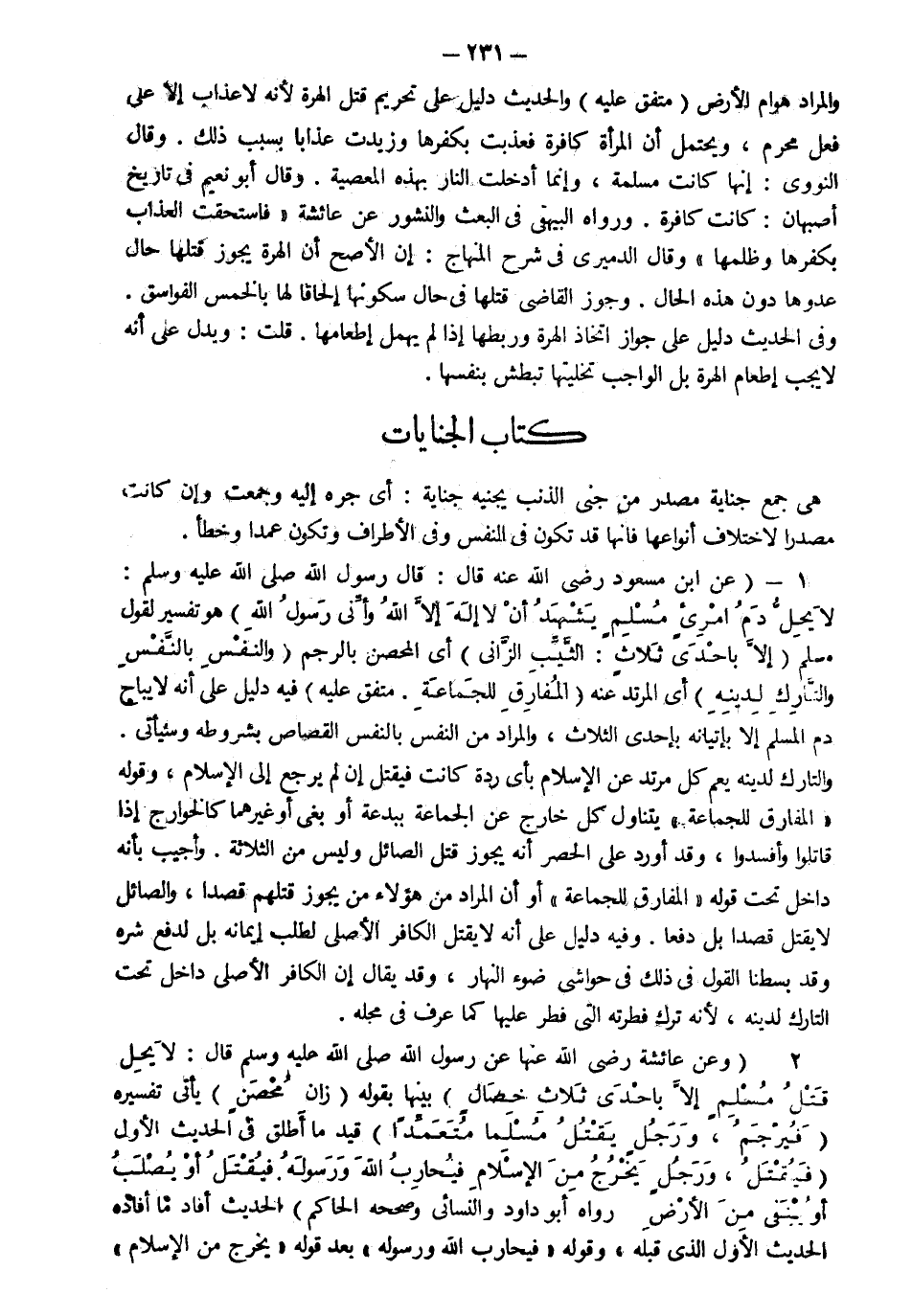 1- عن ابن مسعود رضي الله عنه قال قال رسول الله صلى الله عليه وسلم: "لا يحل دم امرىء مسلم يشهد أن لا إله إلا الله وأني رسول الله" هو تفسير لقوله مسلم "إلا بإحدى ثلاث الثيب الزاني أي المحصن بالرجم والنفس بالنفس والتارك لدينه" أي المرتد عنه "المفارق للجماعة" متفق عليه فيه دليل على أنه لا يباح دم المسلم إلا بإتيانه بإحدى الثلاث والمراد من النفس بالنفس القصاص بشرطه وسيأتي والتارك لدينه يعم كل مرتد عن الإسلام بأي ردة كانت فيقتل إن لم يرجع إلى الإسلام وقوله المفارق للجماعة يتناول كل خارج عن الجماعة ببدعة أو بغي أو غيرهما كالخوارج إذا قاتلوا وأفسدوا وقد أورد على الحصر أنه يجوز قتل الصائل وليس من الثلاثة وأجيب بأنه داخل تحت قوله المفارق للجماعة أو أن المراد من هؤلاء من يجوز قتلهم قصدا والصائل لا يقتل قصدا بل دفعا وفيه دليل على أنه لا يقتل الكافر الأصلي لطلب إيمانه بل لدفع شره وقد بسطنا القول في ذلك في حواشي ضوء النهار وقد يقال إن الكافر الأصلي داخل تحت التارك لدينه لأنه ترك فطرته التي فطر عليها كما عرف في محله