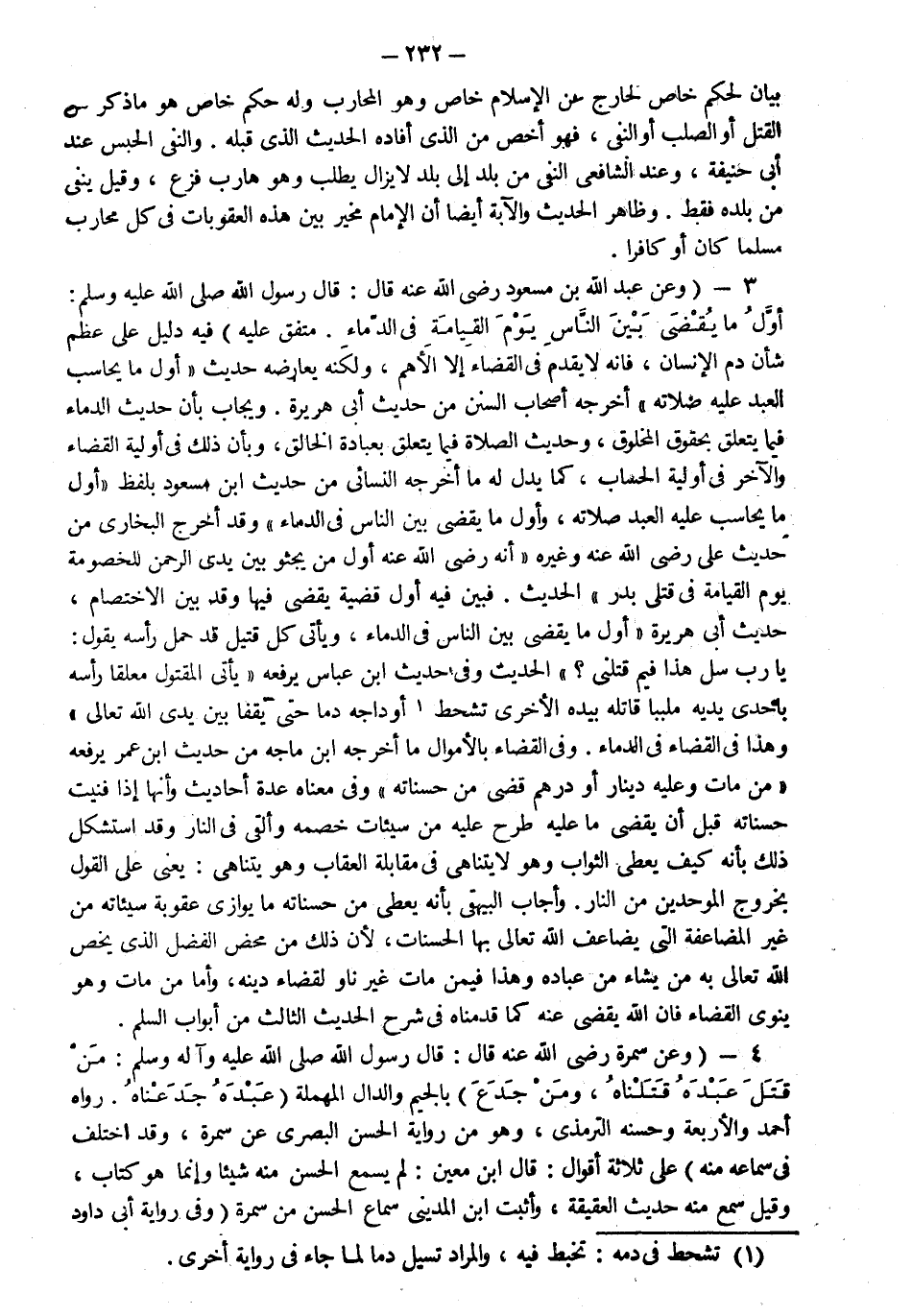 3- وعن عبد الله بن مسعود رضي الله عنه قال قال رسول الله صلى الله عليه وسلم: " أول ما يقضى بين الناس يوم القيامة في الدماء" متفق عليه فيه دليل على عظم شأن دم الإنسان فإنه لا يقدم في القضاء إلا الأهم ولكنه يعارضه حديث أول ما يحاسب العبد عليه صلاته أخرجه أصحاب السنن من حديث أبي هريرة ويجاب بأن حديث الدماء فيما يتعلق بحقوق المخلوق وحديث الصلاة فيما يتعلق بعبادة الخالق وبأن ذلك في أولوية القضاء والآخر في أولوية الحساب كما يدل له ما أخرجه النسائي من حديث ابن مسعود بلفظ أول ما يحاسب عليه العبد صلاته وأول ما يقضى بين الناس في الدماء وقد أخرج البخاري من حديث علي رضي الله عنه وغيره أنه رضي الله عنه أول من يجثو بين يدي الرحمن للخصومة يوم القيامة في قتلى بدر الحديث فبين فيه أول قضية يقضي فيها وقد بين الاختصام حديث أبي هريرة "أول ما يقضى بين الناس في الدماء ويأتي كل قتيل قد حمل رأسه يقول يا رب سل هذا فيم قتلني" الحديث وفي حديث ابن عباس يرفعه "يأتي المقتول معلقا رأسه بإحدى يديه ملببا قاتله بيده الأخرى تشحط أوداجه دما حتى يقفا بين يدي الله تعالى" وهذا في القضاء في الدماء وفي القضاء بالأموال ما أخرجه ابن ماجه من حديث ابن عمر يرفعه "من مات وعليه دينار أو درهم قضى من حسناته" وفي معناه عدة أحاديث وأنها إذا فنيت حسناته قبل أن يقضي ما عليه طرح عليه من سيئات خصمه وألقي في النار وقد استشكل ذلك بأنه كيف يعطى الثواب وهو لا يتناهى في مقابلة العقاب وهو يتناهى يعني على القول بخروج الموحدين من النار وأجاب البيهقي بأنه يعطى من حسناته ما يوازي عقوبة سيئاته المضاعفة التي يضاعف الله تعالى بها الحسنات لأن ذلك من محض الفضل الذي يخص الله تعالى به من يشاء من عباده وهذا فيمن مات غير ناو لقضاء دينه وأما من مات وهو ينوي القضاء فإن الله يقضي عنه كما قدمناه في شرح الحديث الثالث من أبواب السلم