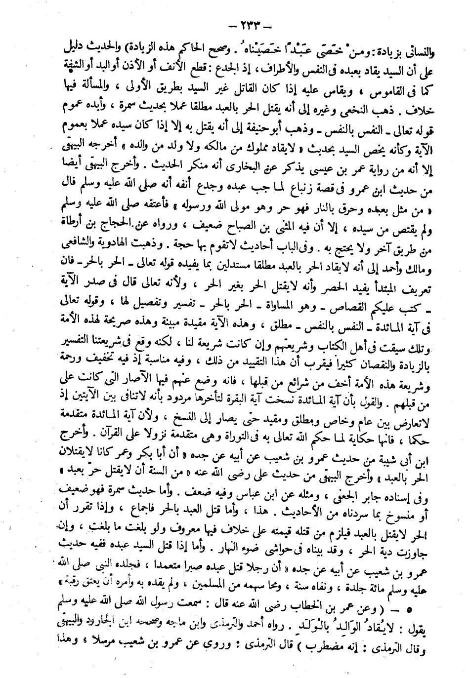والنسائي بزيادة "ومن خصى عبده خصيناه" وصحح الحاكم هذه الزيادة والحديث دليل على أن السيد يقاد بعبده في النفس والأطراف إذ الجدع قطع الأنف أو الأذن أو اليد أو الشفة كما في القاموس ويقاس عليه إذا كان القاتل غير السيد بطريق الأولى والمسألة فيها خلاف ذهب النخعي وغيره إلى أنه يقتل الحر بالعبد مطلقا عملا بحديث سمرة وأيده عموم قوله تعالى النفس بالنفس وذهب أبو حنيفة إلى أنه يقتل به إلا إذا كان سيده عملا بعموم الآية وكأنه يخص السيد بحديث لا يقاد مملوك من مالكه ولا ولد من والده أخرجه البيهقي إلا أنه من رواية عمر بن عيسى يذكر عن البخاري أنه منكر الحديث وأخرج البيهقي أيضا من حديث ابن عمرو في قصة زنباع لما جب عبده وجدع أنفه أنه صلى الله عليه وسلم قال من مثل بعبده وحرق بالنار فهو حر وهو مولى الله ورسوله فأعتقه صلى الله عليه وسلم ولم يقتص من سيده إلا أن فيه المثنى بن الصباح ضعيف ورواه عن الحجاج بن أرطاة من طريق آخر ولا يحتج به وفي الباب أحاديث لا تقوم بها حجة وذهبت الهادوية و الشافعي ومالك وأحمد إلى أنه لا يقاد الحر بالعبد مطلقا مستدلين بما يفيده قوله تعالى: {الْحُرُّ بِالْحُرِّ} فإن تعريف المبتدأ يفيد الحصر وأنه لا يقتل الحر بغير الحر ولأنه تعالى قال في صدر الآية {كُتِبَ عَلَيْكُمُ الْقِصَاصُ} وهو المساواة الحر بالحر تفسير وتفصيل لها وقوله تعالى في آية المائدة {النَّفْسَ بِالنَّفْسِ} مطلق وهذه الآية مقيدة مبينة وهذه صريحة لهذه الأمة وتلك سيقت في أهل الكتاب وشريعتهم وإن كانت شريعة لنا لكنه وقع في شريعتنا التفسير بالزيادة والنقصان كثيرا فيقرب أن هذا التقييد من ذلك وفيه مناسبة إذ فيه تخفيف ورحمة وشريعة هذه الأمة أخف من شرائع من قبلها فإنه وضع عنهم فيها الآصار التي كانت على من قبلهم والقول بأن آية المائدة نسخت آية البقرة لتأخرها مردود بأنه لا تنافي بين الآيتين إذ لا تعارض بين عام وخاص ومطلق ومقيد حتى يصار إلى النسخ ولأن آية المائدة متقدمة حكما فإنها حكاية لما حكم الله تعالى به في التوراة وهي متقدمة نزولا على القرآن وأخرج ابن أبي شيبة من حديث عمرو بن شعيب عن أبيه عن جده أن أبا بكر وعمر كانا لا يقتلان الحر بالعبد وأخرج البيهقي من حديث علي رضي الله عنه من السنة أن لا يقتل حر بعبد وفي إسناده جابر الجعفي ومثله عن ابن عباس وفيه ضعف وأما حديث سمرة فهو ضعيف أو منسوخ بما سردناه من الأحاديث هذا وأما قتل العبد بالحر فإجماع وإذا تقرر أن الحر لا يقتل بالعبد فيلزم من قتله قيمته على خلاف فيها معروف ولو بلغت ما بلغت وإن جاوزت دية الحر وقد بيناه في حواشي ضوء النهار وأما إذا قتل السيد عبده ففيه حديث عمرو بن شعيب عن أبيه عن جده أن رجلا قتل عبده صبرا متعمدا فجلده النبي صلى الله عليه وسلم مائة جلدة ونفاه سنة ومحا سهمه من المسلمين ولم يقده به وأمره أن يعتق رقبة