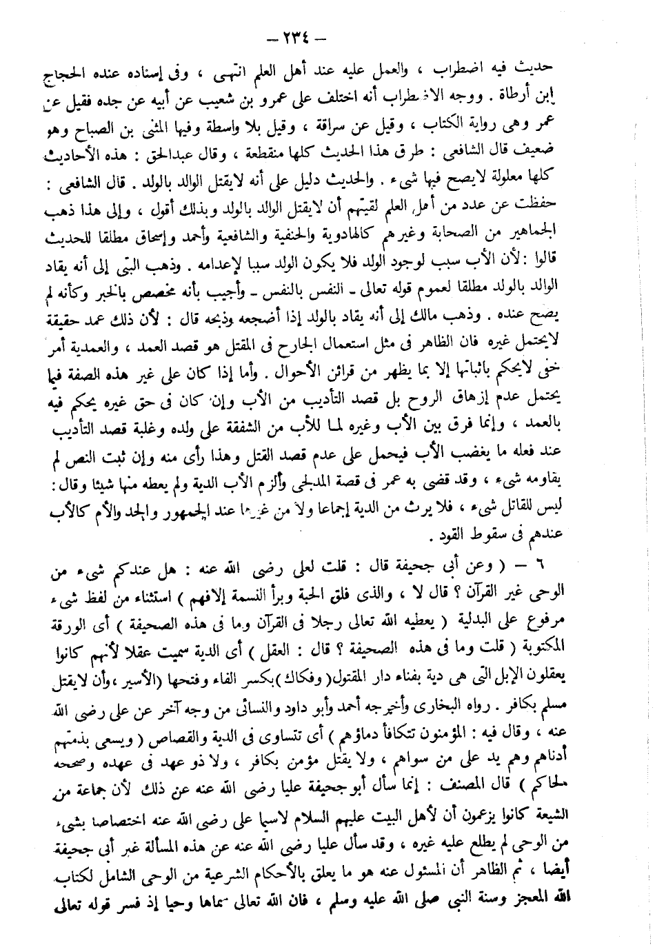 6- وعن أبي جحيفة قال قلت لعلي رضي الله عنه هل عندكم شيء من الوحي غير القرآن قال لا والذي فلق الحبة وبرأ النسمة إلا فهم استثناء من لفظ شيء تزوجها على البدلية يعطيه الله تعالى رجلا في القرآن وما في هذه الصحيفة أي الورقة المكتوبة قلت وما في هذه الصحيفة قال العقل أي الدية سميت عقلا لأنهم كانوا يعقلون الإبل التي هي دية بفناء دار المقتول وفكاك بكسر الفاء وفتحها الأسير وأن لا يقتل مسلم بكافر رواه البخاري وأخرجه أحمد وأبو داود والنسائي من وجه آخر عن علي رضي الله عنه وقال فيه المؤمنون تتكافأ دماؤهم أي تتساوى في الدية والقصاص ويسعى بذمتهم أدناهم وهم يد على من سواهم ولا يقتل مؤمن بكافر ولا ذو عهد في عهده وصححه الحاكم قال المصنف إنما سأل أبو جحيفة عليا رضي الله عنه عن ذلك لأن جماعة من الشيعة كانوا يزعمون أن لأهل البيت عليهم السلام لا سيما علي رضي الله عنه اختصاصا بشيء من الوحي لم يطلع عليه غيره وقد سأل عليا رضي الله عنه عن هذه المسألة غير أبي جحيفة أيضا عند الظاهر أن المسؤول عنه هو ما يتعلق بالأحكام الشرعية من الوحي الشامل لكتاب الله المعجز وسنة النبي صلى الله عليه وسلم فإن الله تعالى سماها وحيا إذ فسر قوله تعالى
