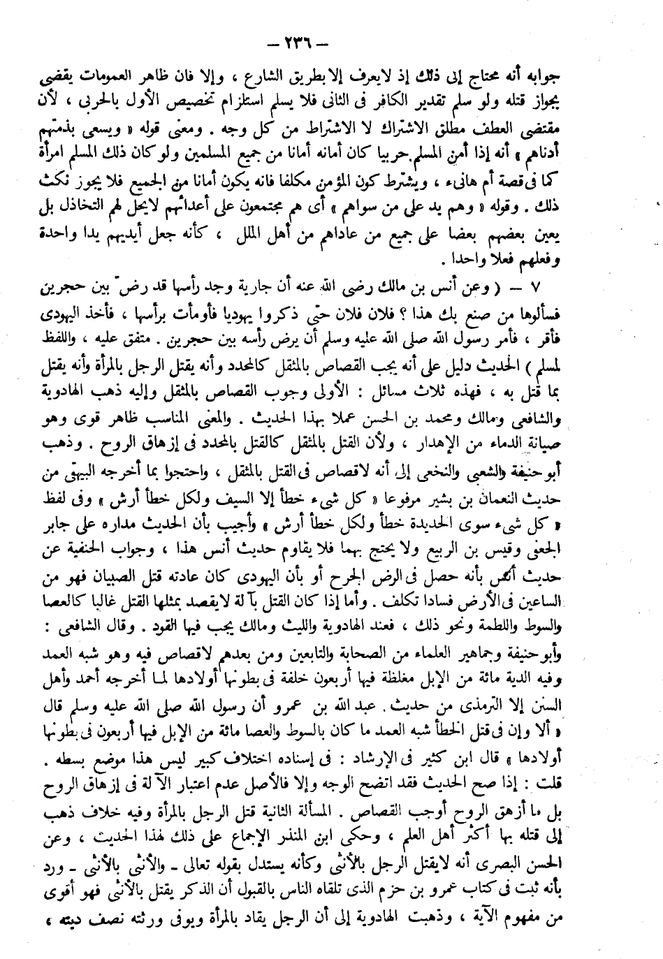 7- وعن أنس بن مالك رضي الله عنه أن جارية وجد رأسها قد رض بين حجرين فسألوها من صنع بك هذا فلان فلان حتى ذكروا يهوديا فأومأت برأسها فأخذ اليهودي فأقر فأمر رسول الله صلى الله عليه وسلم أن يرض رأسه بين حجرين متفق عليه واللفظ لمسلم الحديث دليل على أنه يجب القصاص بالمثل كالمحدد وأنه يقتل الرجل بالمرأة وأنه يقتل بما قتل به فهذه ثلاث مسائل الأولى: وجوب القصاص بالمثقل وإليه ذهب الهادوية و الشافعي ومالك ومحمد بن الحسن عملا بهذا الحديث والمعنى المناسب ظاهر قوي وهو صيانة الدماء من الإهدار ولأن القتل بالمثل كالقتل بالمحدد في إزهاق الروح وذهب أبو حنيفة والشعبي والنخعي إلى أنه لا قصاص في القتل بالمثل واحتجوا بما أخرجه البيهقي من حديث النعمان بن بشير مرفوعا كل شيء خطأ إلا السيف ولكل خطأ أرش وفي لفظ كل شيء سوى الحديدة خطأ ولكل خطأ أرش وأجيب بأن الحديث مداره على جابر الجعفي وقيس بن الربيع ولا يحتج بهما فلا يقاوم حديث أنس هذا وجواب الحنفية عن حديث أنس بأنه حصل في الرض الجرح أو بأن اليهودي كان عادته قتل الصبيان فهو من الساعين في الأرض فسادا تكلف وأما إذا كان القتل بآلة لا يقصد بمثلها القتل غالبا كالعصا والسوط واللطمة ونحو ذلك فعند الهادوية و الليث ومالك يجب فيها القود وقال الشافعي وأبو حنيفة وجماهير العلماء من الصحابة والتابعين ومن بعدهم لا قصاص فيه وهو شبه العمد وفيه الدية مائة من الإبل مغلظة فيها أربعون خلفة في بطونها أولادها لما أخرجه أحمد وأهل السنن إلا الترمذي من حديث عبد الله بن عمرو أن رسول الله صلى الله عليه وسلم قال: "ألا وإن في قتل الخطإ شبه العمد ما كان بالسوط والعصا مائة من الإبل فيها أربعون في بطونها أولادها" قال ابن كثير في الإرشاد: في إسناده اختلاف كثير ليس هذا موضع بسطه قلت إذا صح الحديث فقد اتضح الوجه وإلا فالأصل عدم اعتبار الآلة في إزهاق الروح بل ما أزهق الروح أوجب القصاص المسألة الثانية قتل الرجل بالمرأة وفيه خلاف ذهب إلى قتله بها أكثر أهل العلم وحكى ابن المنذر الإجماع على ذلك لهذا الحديث وعن الحسن البصري أنه لا يقتل الرجل بالأنثى وكأنه يستدل بقوله تعالى: {والْأُنْثَى بِالْأُنْثَى} ورد بأنه ثبت في كتاب عمرو بن حزم الذي تلقاه الناس بالقبول أن الذكر يقتل بالأنثى فهو أقوى من مفهوم الآية وذهبت الهادوية إلى أن الرجل يقاد بالمرأة ويوفى ورثته نصف ديته