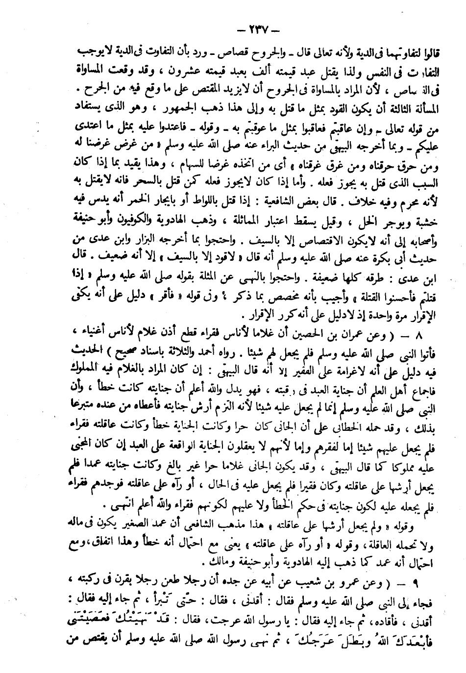 8- وعن عمران بن حصين رضي الله عنه أن غلاما لأناس فقراء قطع أذن غلام لأناس أغنياء فأتوا النبي صلى الله عليه وسلم فلم يجعل لهم شيئا رواه أحمد والثلاثة بإسناد صحيح الحديث فيه دليل على أنه لا غرامة على الفقير إلا أنه قال البيهقي إن كان المراد بالغلام فيه المملوك فإجماع أهل العلم أن جناية العبد في رقبته فهو يدل والله أعلم أن جنايته كانت خطأ وأن النبي صلى الله عليه وسلم إنما لم يجعل عليه شيئا لأنه التزم أرش جنايته فأعطاه من عنده متبرعا بذلك وقد حمله الخطابي على أن الجاني كان حرا وكانت الجناية خطأ وكانت عاقلته فقراء فلم يجعل عليهم شيئا إما لفقرهم وإما لأنه لا يعقلون الجناية الواقعة على العبد إن كان المجني عليه مملوكا كما قال البيهقي وقد يكون الجاني غلاما حرا غير بالغ وكانت جنايته عمدا فلم يجعل أرشها على عاقلته وكان فقيرا فلم يجعل عليه في الحال أو رآه على عاقلته فوجدهم فقراء فلم يجعله عليه لكون جنايته في حكم الخطإ ولا عليهم لكونهم فقراء والله أعلم انتهى وقوله ولم يجعل أرشها على عاقلته هذا مذهب الشافعي أن عمد الصغير يكون في ماله ولا تحمله العاقلة وقوله أو رآه على عاقلته يعني مع احتمال أنه خطأ وهذا اتفاق ومع احتمال أنه عمد كما ذهب إليه الهادوية و أبو حنيفة ومالك