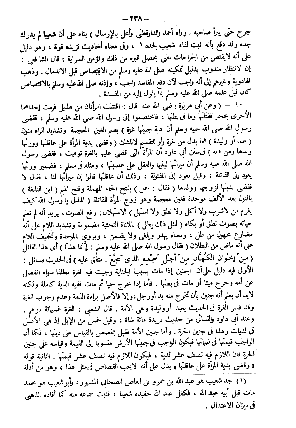 10- وعن أبي هريرة رضي الله عنه قال اقتتلت امرأتان من هذيل فرمت إحداهما الأخرى بحجر فقتلتها ومافي بطنها فاختصموا إلى رسول الله صلى الله عليه وسلم فقضى رسول الله صلى الله عليه وعلى آله وسلم أن دية جنينها غرة بضم الغين المعجمة وتشديد الراء منون " عبد أو وليدة" هما بدل من غرة وأو للتقسيم لا للشك "وقضى بدية المرأة على عاقلتها وورثها ولدها من معهم" في سنن أبي داود أن المرأة التي قضى عليها بالغرة توفيت فقضى رسول الله صلى الله عليه وسلم أن ميراثها لبنيها والعقل على عصبتها ومثله في مسلم فضمير ورثها يعود إلى القاتلة وقيل يعود إلى المقتولة وذلك أن عاقلتها قالوا إن ميراثها لنا فقال لا فقضى بديتها لزوجها وولدها فقال حمل بفتح الحاء المهملة وفتح الميم ابن النابغة بالنون بعد الألف موحدة فغين معجمة وهو زوج المرأة القاتلة الهذلي يا رسول الله كيف يغرم من لا شرب ولا أكل ولا نطق ولا استهل الاستهلال رفع الصوت يريد أنه لم تعلم حياته بصوت نطق أو بكاء فمثل ذلك يطل بالمثناة التحتية مضمومة وتشديد اللام على أنه مضارع مجهول من طل ومعناه يهدر ويلغى ولا يضمن ويروى بالموحدة وتخفيف اللام على أنه ماض من البطلان فقال رسول الله صلى الله عليه وسلم: "إنما هذا أي هذا القائل "من إخوان الكهان" من أجل سجعه الذي سجع متفق عليه وفي الحديث مسائل الأولى فيه دليل على أن الجنين إذا مات بسبب الجناية وجبت فيه الغرة مطلقا سواء انفصل عن أمه وخرج ميتا أو مات في بطنها فأما إذا خرج حيا ثم مات ففيه الدية كاملة ولكنه لا بد أن يعلم أنه جنين بأن تخرج منه يد أو رجل وإلا فالأصل براءة الذمة وعدم وجوب الغرة وقد فسر الغرة في الحديث بعبد أو وليدة وهي الأمة قال الشعبي الغرة خمسمائة درهم وعند أبي داود والنسائي من حديث بريدة مائة شاة وقيل خمس من الإبل إذ هي الأصل في الديات وهذا في جنين الحرة وأما جنين الأمة فقيل يخصص بالقياس على ديتها فكما أن الواجب قيمتها في ضمانها فيكون الواجب في جنينها الأرش منسوبا إلى القيمة وقياسه على جنين الحرة فإن اللازم فيه نصف عشر الدية فيكون اللازم فيه نصف عشر قيمتها الثانية قوله " وقضى بدية المرأة على عاقلتها" يدل على أنه لا يجب القصاص في مثل هذا وهو من أدلة