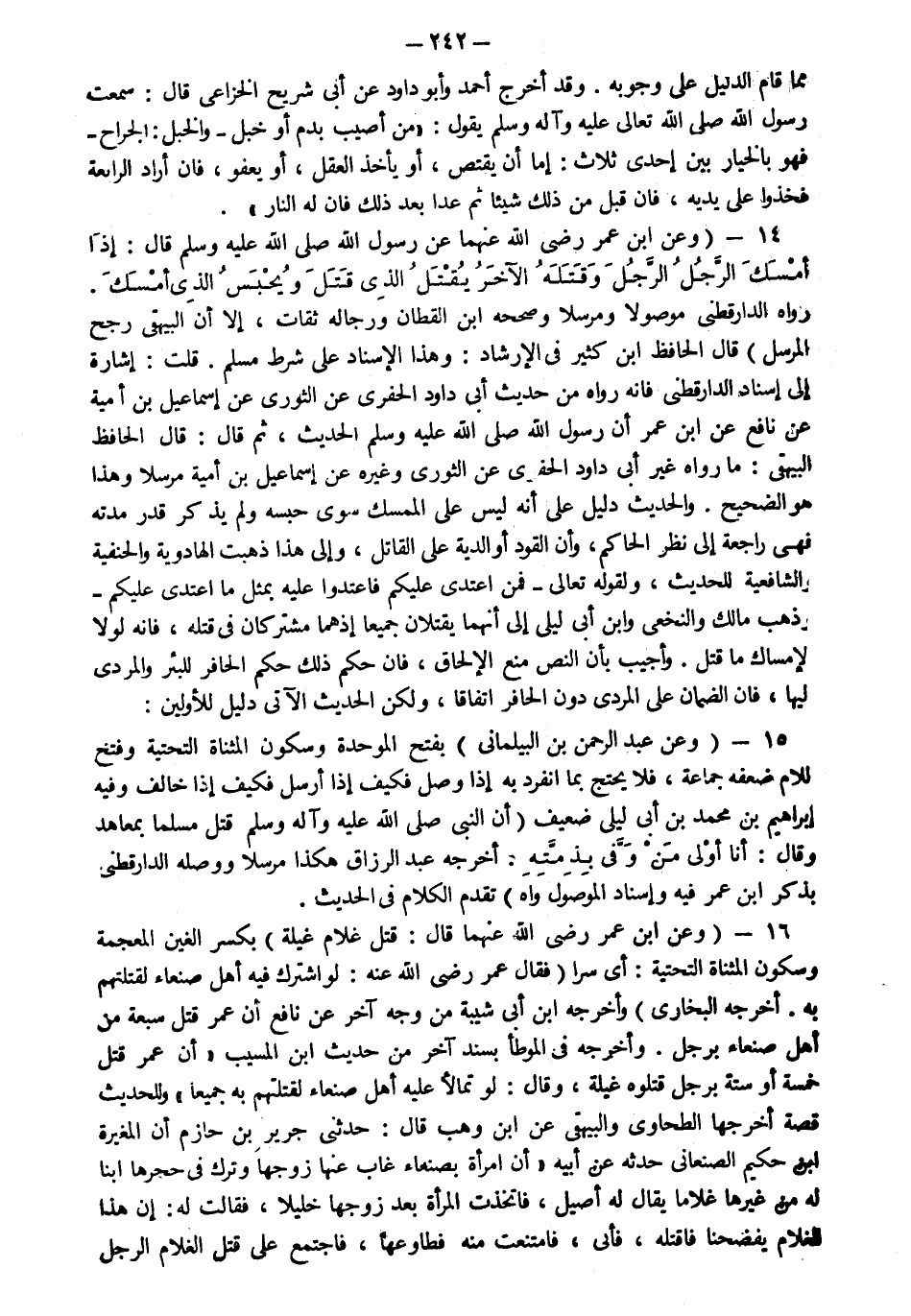 16- وعن ابن عمر رضي الله عنهما قال قتل غلام غيلة بكسر الغين المعجمة وسكون المثناة التحتية أي سرا فقال عمر رضي الله عنه لو اشترك فيه أهل صنعاء لقتلتهم به أخرجه البخاري وأخرجه ابن أبي شيبة من وجه آخر عن نافع أن عمر قتل سبعة من أهل صنعاء برجل وأخرجه في الموطإ بسند آخر من حديث ابن المسيب أن عمر قتل خمسة أو ستة برجل قتلوه غيلة وقال لو تمالأ عليه أهل صنعاء لقتلتهم به جميعا وللحديث قصة أخرجها الطحاوي والبيهقي عن ابن وهب قال حدثني جرير بن حازم أن المغيرة بن حكيم الصنعاني حدثه عن أبيه أن امرأة بصنعاء غاب عنها زوجها وترك في حجرها ابنا له من غيرها غلاما يقال له أصيل فاتخذت المرأة بعد زوجها خليلا فقالت له إن هذا الغلام يفضحنا فاقتله فأبى فامتنعت منه فطاوعها فاجتمع على قتل الغلام الرجل