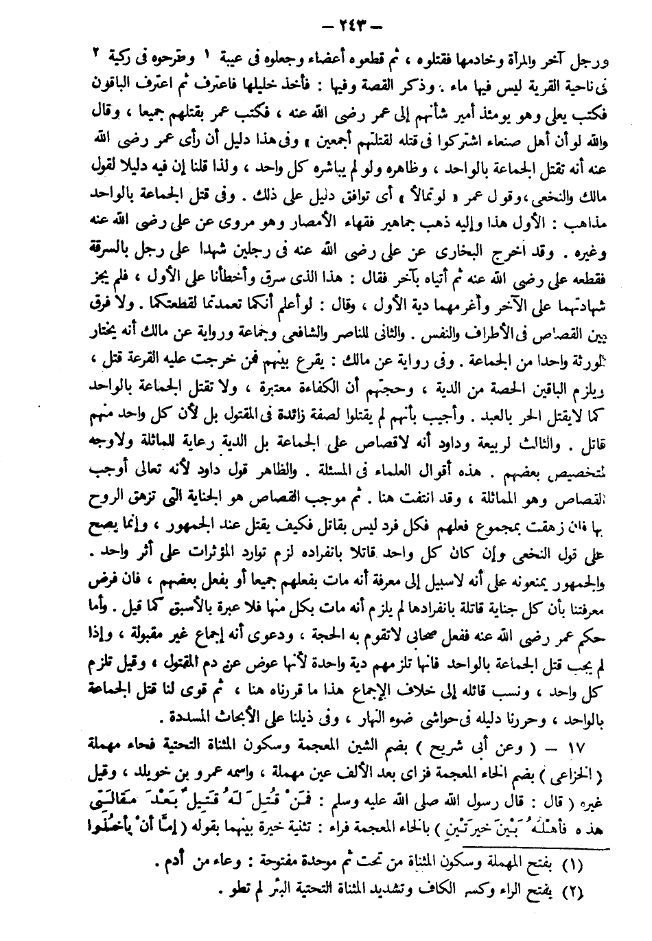 ورجل آخر والمرأة وخادمها فقتلوه ثم قطعوه أعضاءه وجعلوه في عيبة وطرحوه في ركية في ناحية القرية ليس فيها ماء وذكر القصة وفيها فأخذ خليلها فاعترف ثم اعترف الباقون فكتب يعلى وهو يومئذ أمير شأنهم إلى عمر رضى الله عنه فكتب عمر بقتلهم جميعا وقال والله لو أن أهل صنعاء اشتركوا في قتله لقتلتهم أجمعين وفي هذا دليل أن رأي عمر رضي الله عنه أنه تقتل الجماعة بالواحد وظاهره ولو لم يباشره كل واحد ولذا قلنا إن فيه دليلا لقول مالك والنخعي وقول عمر لو تمالأ أي توافق دليل على ذلك وفي قتل الجماعة بالواحد مذاهب الأول هذا وإليه ذهب جماهير فقهاء الأمصار وهو مروي عن علي رضي الله عنه وغيره وقد أخرج البخاري عن علي رضي الله عنه في رجلين شهدا على رجل بالسرقة فقطعه علي رضي الله عنه ثم أتياه بآخر فقالا هذا الذي سرق وأخطأنا على الأول فلم يجز شهادتهما على الآخر وأغرمهما دية الأول وقال لو أعلم أنكما تعمدتما لقطعتكما ولا فرق بين القصاص في الأطراف والنفس والثاني للناصر والشافعي وجماعة ورواية عن مالك أنه يختار الورثة واحدا من الجماعة وفي رواية عن مالك يقرع بينهم فمن خرجت كان عليه القرعة قتل ويلزم الباقون الحصة من الدية وحجتهم أن الكفاءة معتبرة ولا تقتل الجماعة بالواحد كما لا يقتل الحر بالعبد وأجيب بأنهم لم يقتلوا لصفة زائدة في المقتول بل لأن كل واحد منهم قاتل والثالث لربيعة وداود أنه لا قصاص على الجماعة بل الدية رعاية للمماثلة ولا وجه لتخصيص بعضهم هذه أقوال العلماء في المسألة والظاهر قول داود لأنه تعالى أوجب القصاص وهو المماثلة وقد انتفت هنا عند موجب القصاص هو الجناية التي تزهق الروح بها فإن زهقت بمجموع فعلهم فكل فرد ليس بقاتل فكيف يقتل عند الجمهور وإنما يصح على قول النخعي وإن كان كل واحد قاتلا بانفراده لزم توارد المؤثرات على أثر واحد والجمهور يمنعونه على أنه لا سبيل إلى معرفة أنه مات بفعلهم جميعا أو بفعل بعضهم فإن فرض معرفتنا بأن كل جناية قاتلة بانفرادها لم يلزم أنه مات بكل منها فلا عبرة بالأسبق كما قيل وأما حكم عمر رضي الله عنه ففعل صحابي لا تقوم به الحجة ودعوى أنه إجماع غير مقبولة وإذا لم يجب قتل الجماعة بالواحد فإنها تلزمهم دية واحدة لأنها عوض عن دم المقتول وقيل تلزم كل واحد ونسب قائله إلى خلاف الإجماع هذا ما قررناه هنا ثم قوي لنا قتل الجماعة بالواحد وحررنا دليله في حواشي ضوء النهار وفي ذيلنا على الأبحاث المسددة
